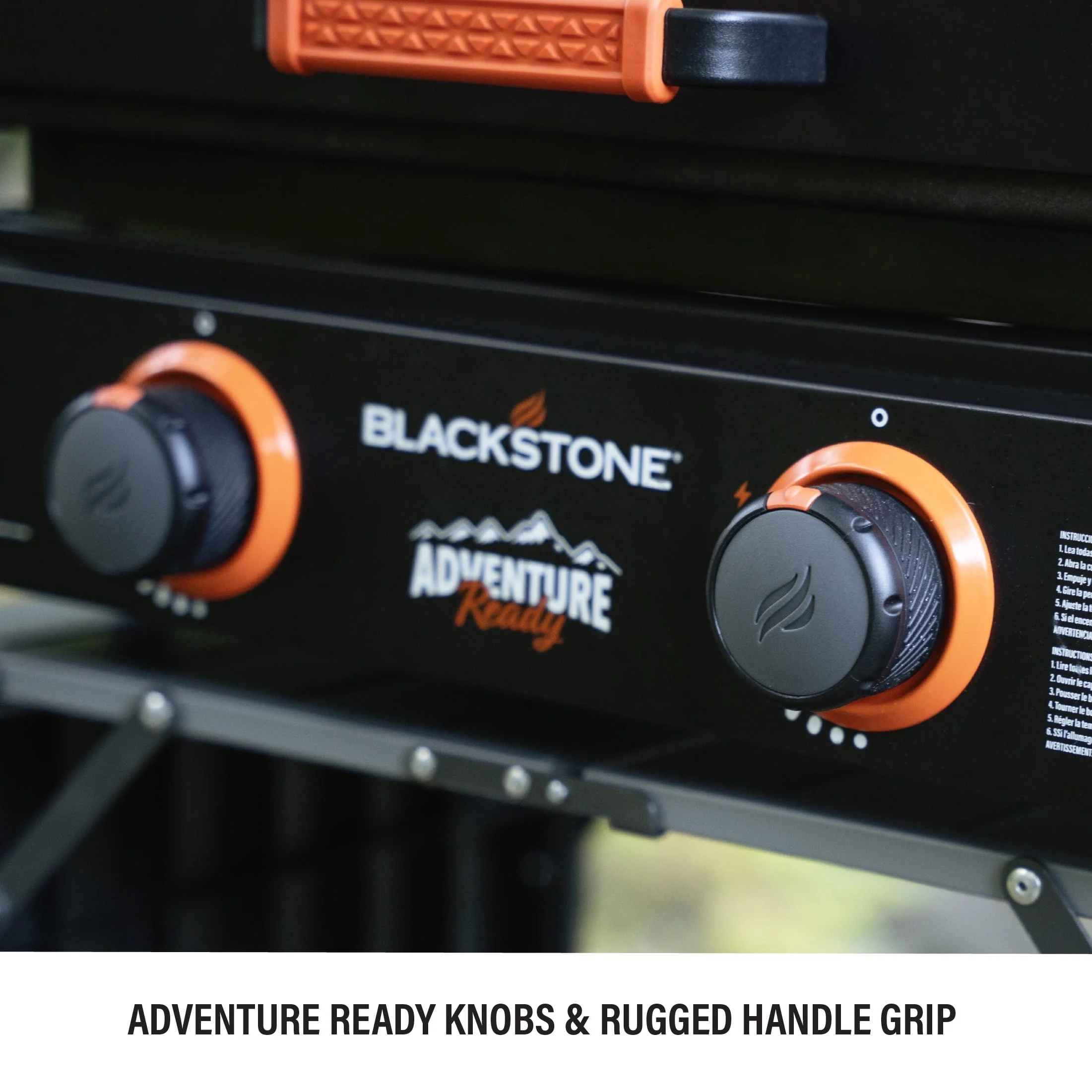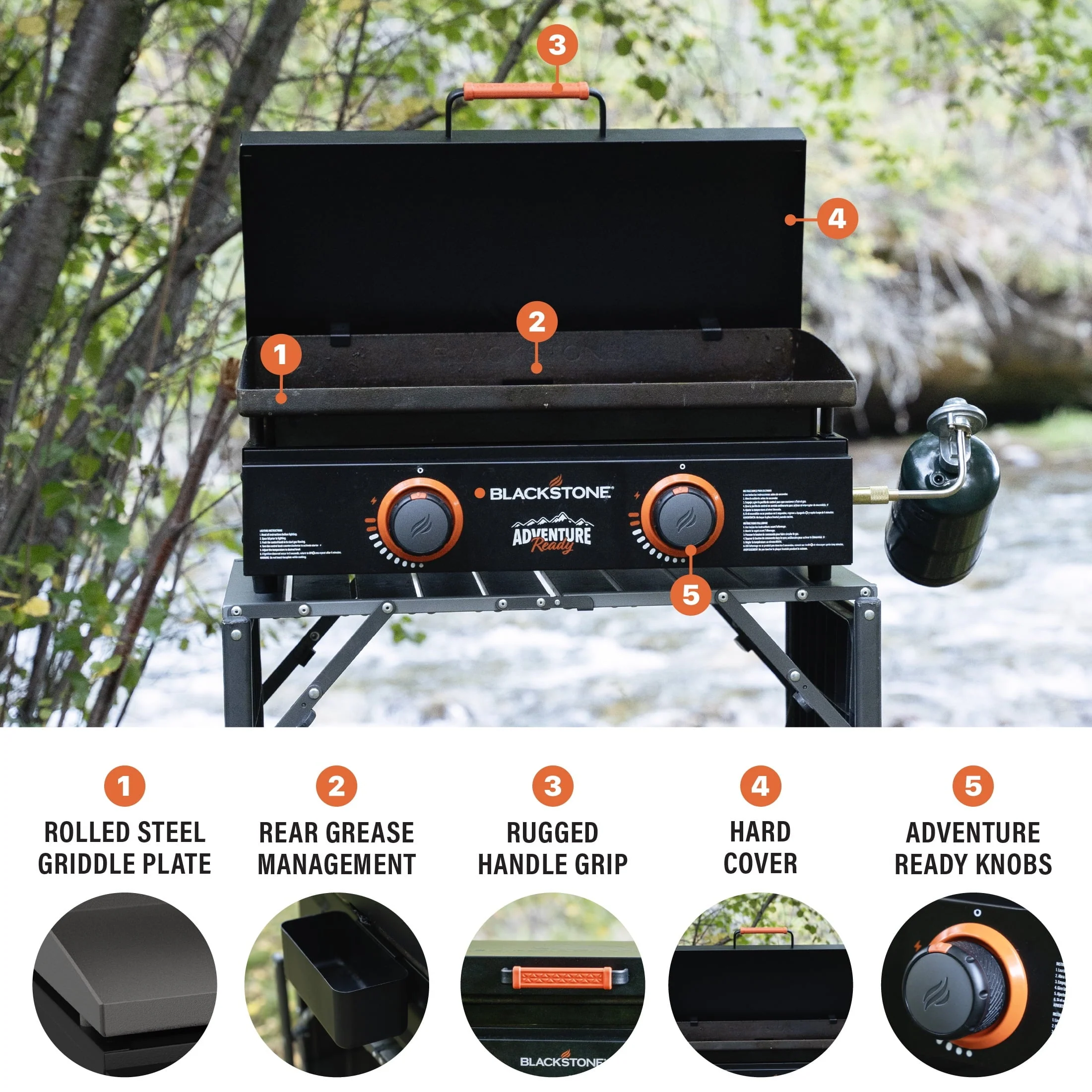 Satisfy your hunger for amazing food with the updated Blackstone 22" Adventure Ready propane griddle on your next outdoor adventure. With 362 sq in of cooking space and 24,000 BTU's, you'll be equipped to cook for your loved ones in the great outdoors. Not only does this bundle include the 22" griddle, but it also comes with a matching hardcover to help keep your griddle clean between uses. The hardcover is designed with a heat-resistant, rugged handle grip and interior hooks to hang it off the back of the griddle while cooking. Enjoy other elevated design elements on this model like the sleek, easy-glide burner dials with pops of orange. Blackstone delivers quality every time with features like the rear grease management system and stainless-steel, H-shaped burners that will ensure you'll enjoy your griddle for years to come. Give the gift of a Blackstone 22" Adventure Ready griddle to an outdoor enthusiast this Holiday Season.