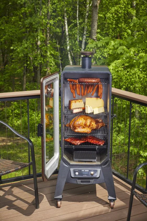 Innovation meets the outdoors with Pit Boss all new 3 Series Vertical Pellet Smoker. Never before has smoking been this versatile. The double walled insulation lets you smoke from 150°F to temperatures reaching 420°F, unlike any other smoker on the market today. The large front window eliminates the need for peek-a-boo cooking and its elevated frame makes transferring your meal from the Smoker to the table a breeze. With the PB 3 Series Pellet Smoker there is no need to fret about cooking lengths its hopper allows you to cook for up to 18 hours! Its sleek design is not only unique, it is also functional. The PB 3 Series Pellet Smoker features 721 square inches of cooking space, four porcelain coated cooking racks, locking caster wheels, an easy to read digital controller and a striking hammer tone copper finish. The multiple position racking system ensures you'll have enough room to smoke anything your heart (or stomach) desires. So, come on, join us and experience how Pit Boss is redefining the smoker industry in your own backyard!