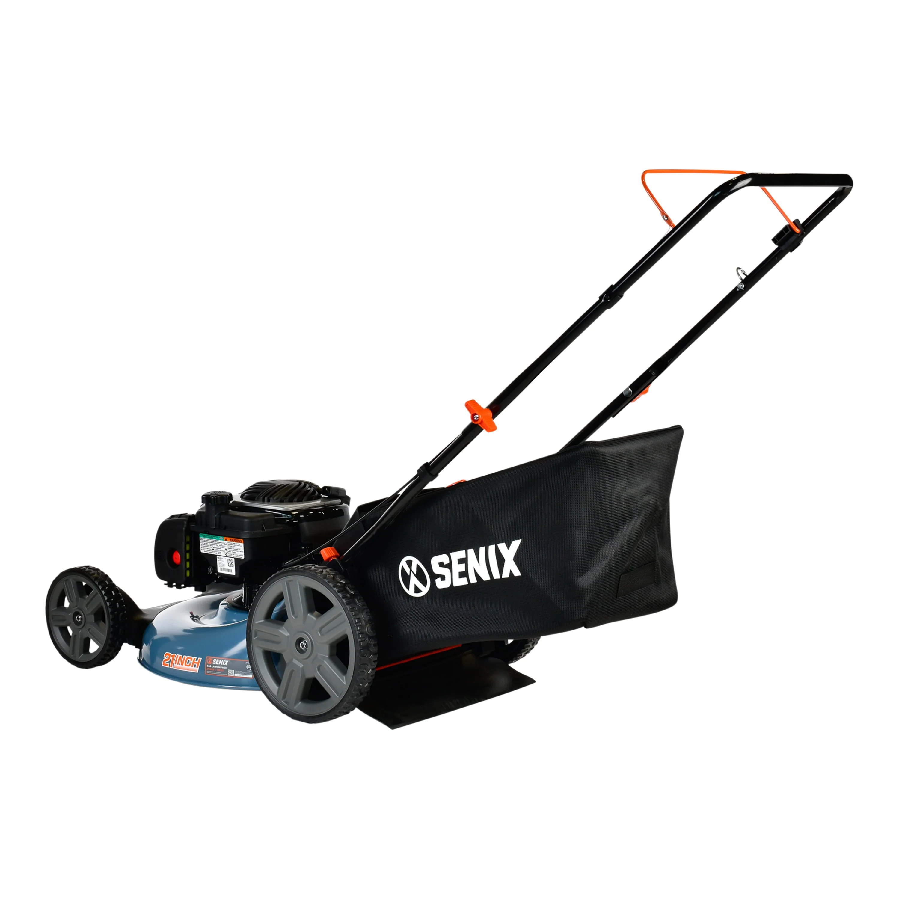 Beautify your lawn with the SENIX 21-inch 140 cc lawn mower. This walk-behind lawn mower features a 21-inch steel deck and is powered by a reliable Briggs & Stratton 140 cc gas powered engine that is designed to provide longer engine life, low vibration, and easy maintenance. The 4-stroke engine is eco-friendly offering low emissions, low fuel consumption, no mixing of oil and gas, and low noise. Prime N' Pull start makes it easy to start the mower every time, and the 3-in-1 convertible deck allows you to mulch, side discharge, or rear bag grass clippings with our 16 gallon grass bag. This lawn mower is ideal for small to medium size yards. The durable 8-inch front and 11-inch rear wheels provide great maneuverability through rough terrain and uneven surfaces, can be adjusted to 6 different positions from 1.25-inches to 3.75-inches using a duel-lever to meet the needs and conditions of your lawn. The fold down handle and compact design allows for easy storage. All SENIX lawn mowers are backed by our 3-year limited warranty for your peace of mind.