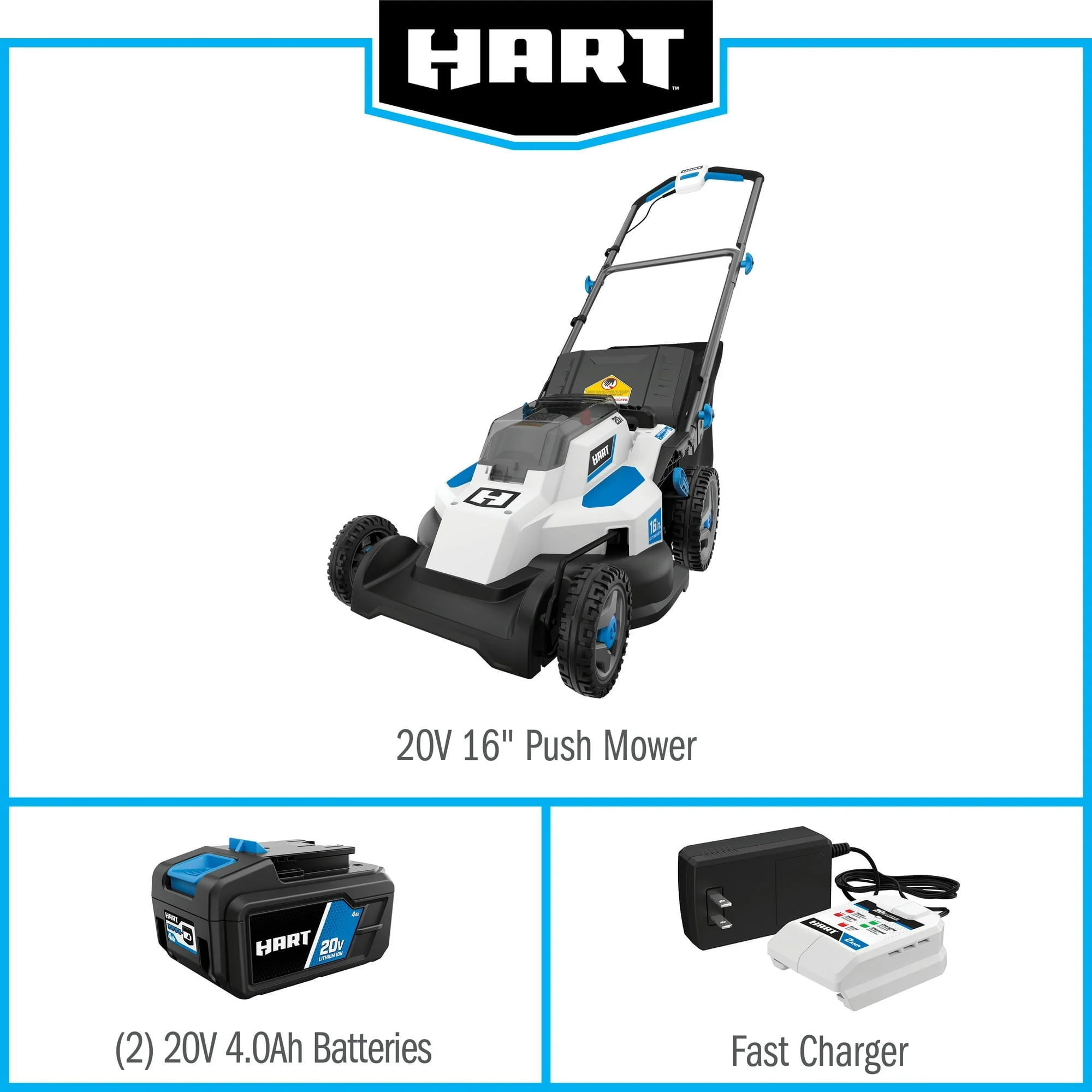 Go cordless and electric with HART’s 20V 16�?Push Lawn Mower with Rear Bagger. This push lawn mower only needs a battery to operate and has a lengthy run time of 40 minutes. The 16�?blade is the perfect width to cut small-medium sized yards in no time at all. HART’s best rated electric push mower comes with a large bag for quicker cleanup of debris. Utilize the mulch plug to spread grass clippings, which will function as a built-in fertilizer for your lawn. The HART 20V battery is compatible with all HART 20V tools. Make the switch to HART’s electric lawn mowers and turn your back on gas for good.