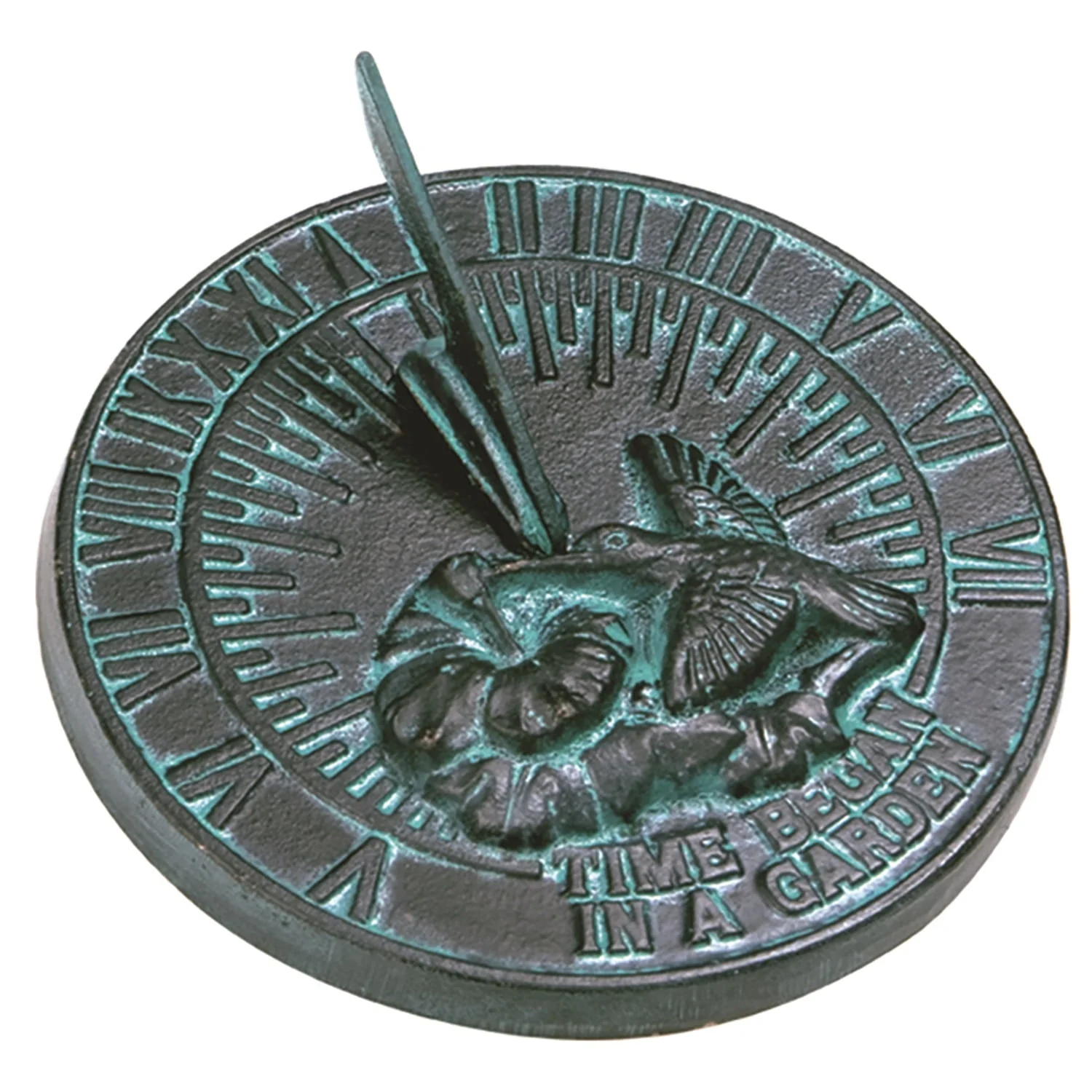 Yet another quality offering from Rome Industries, this Hummingbird Sundial offers stunning style. Many features, including rusted cast iron, distressed whitewashed finish and the motto: Time Began in a Garden. Roman numeral markings add classic appeal.