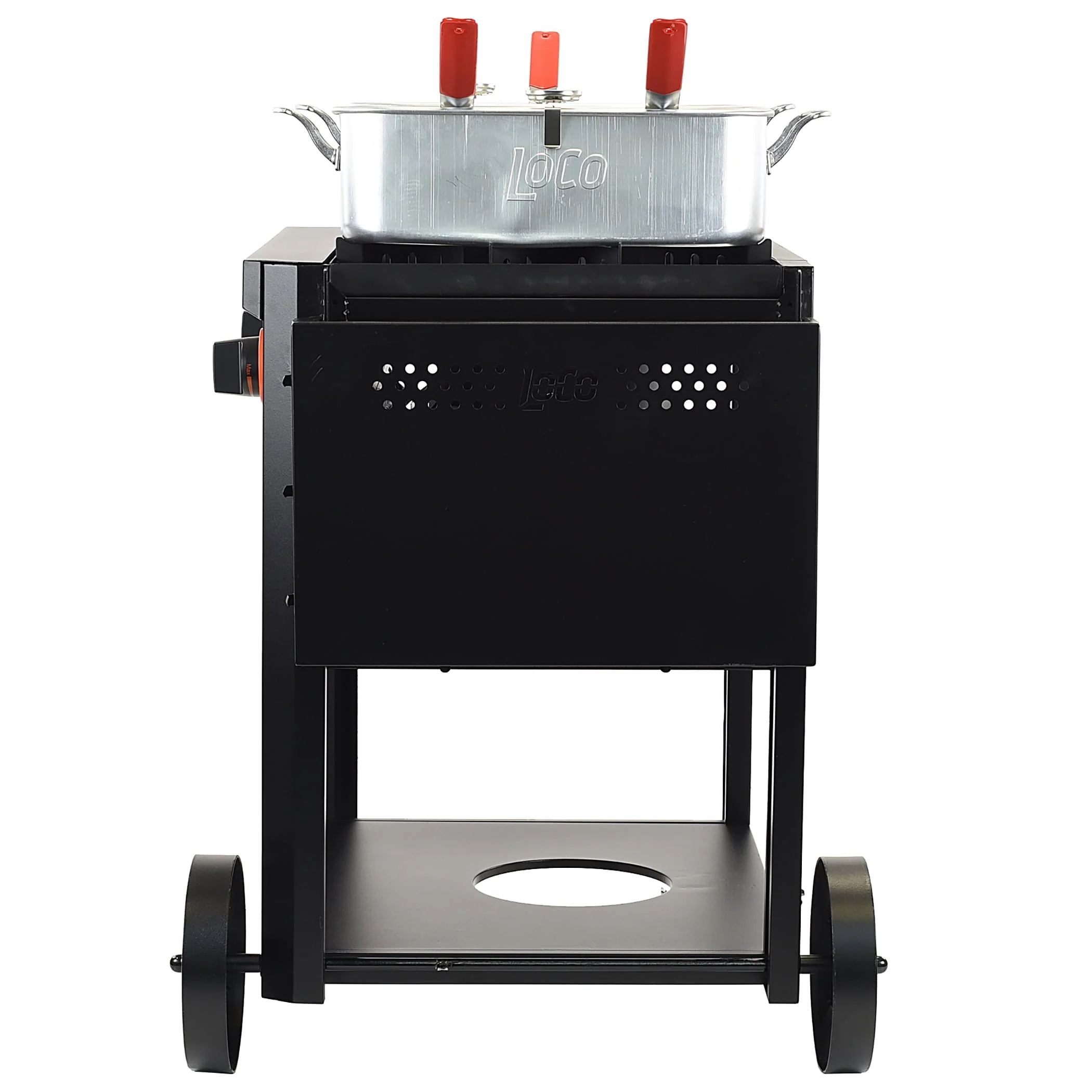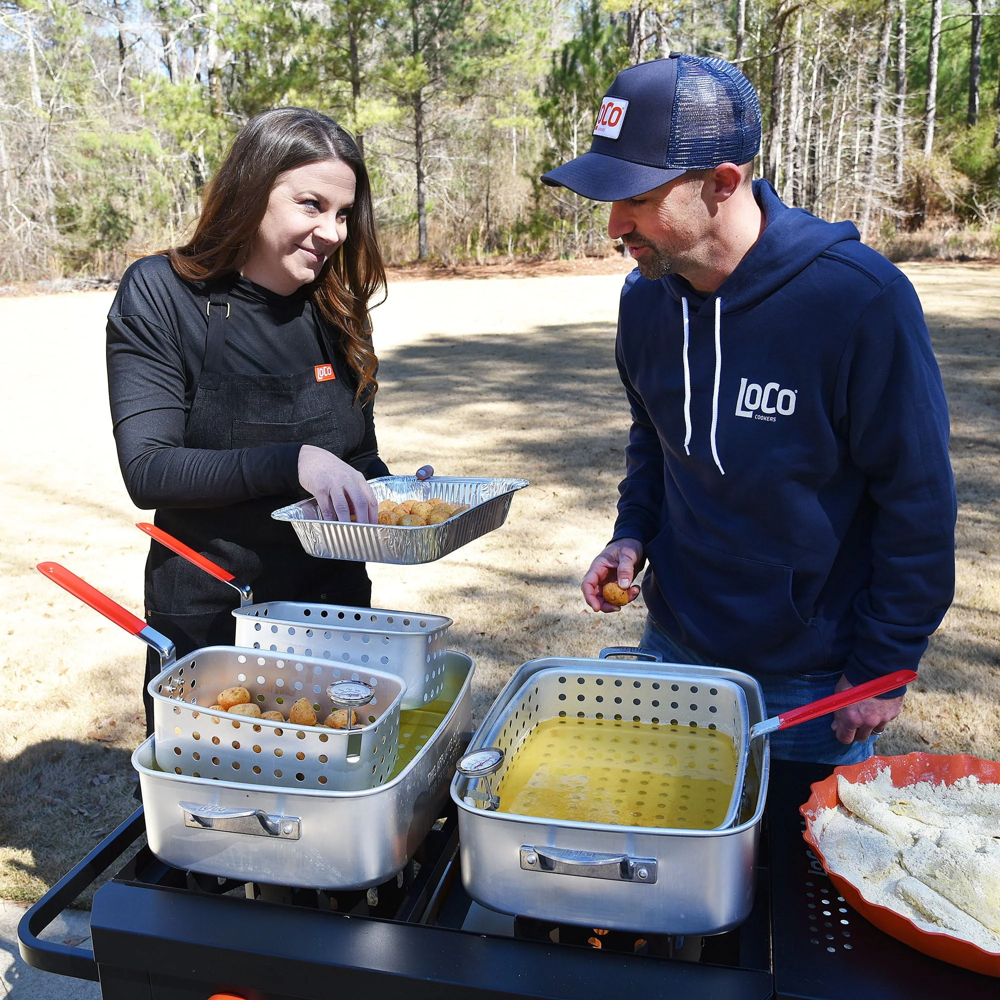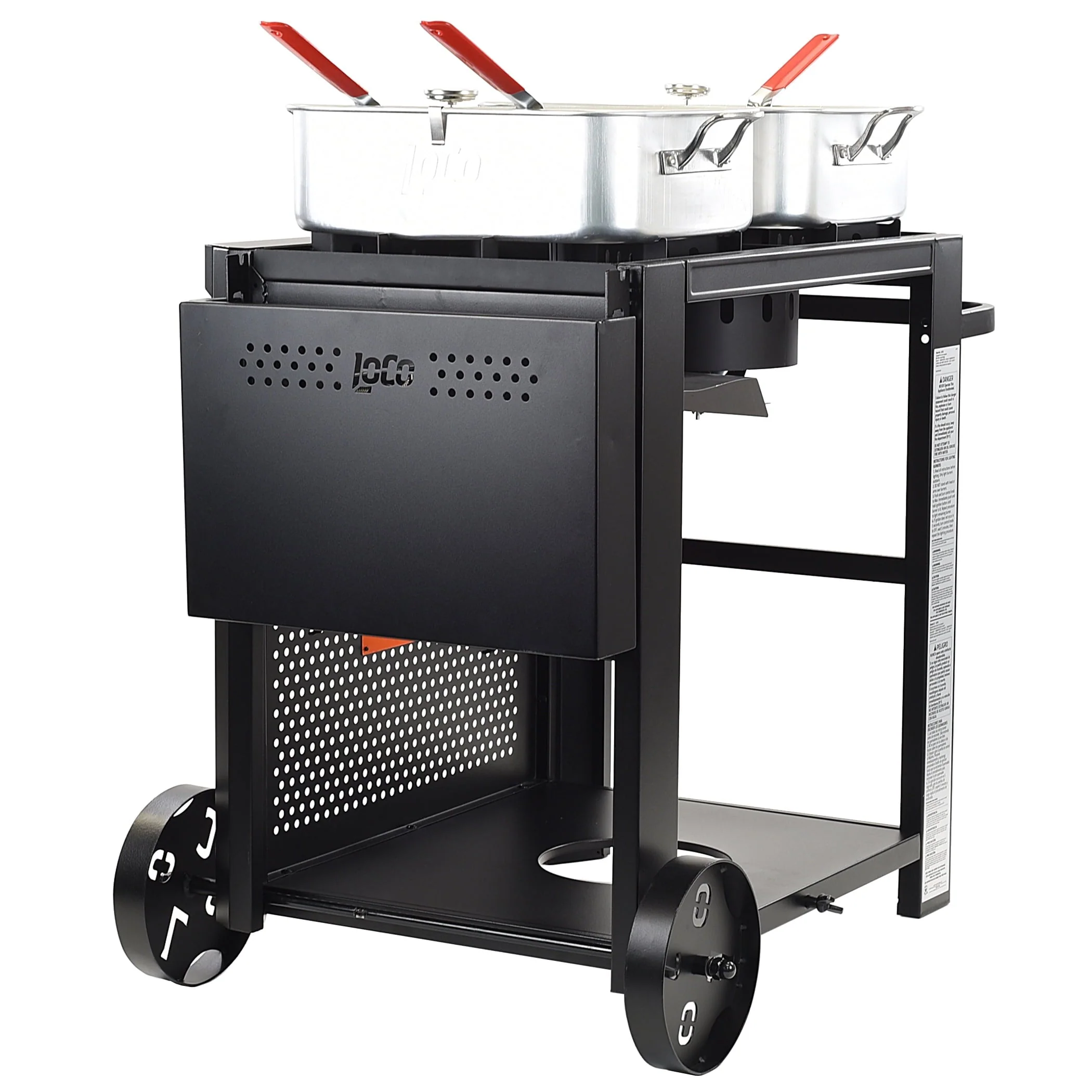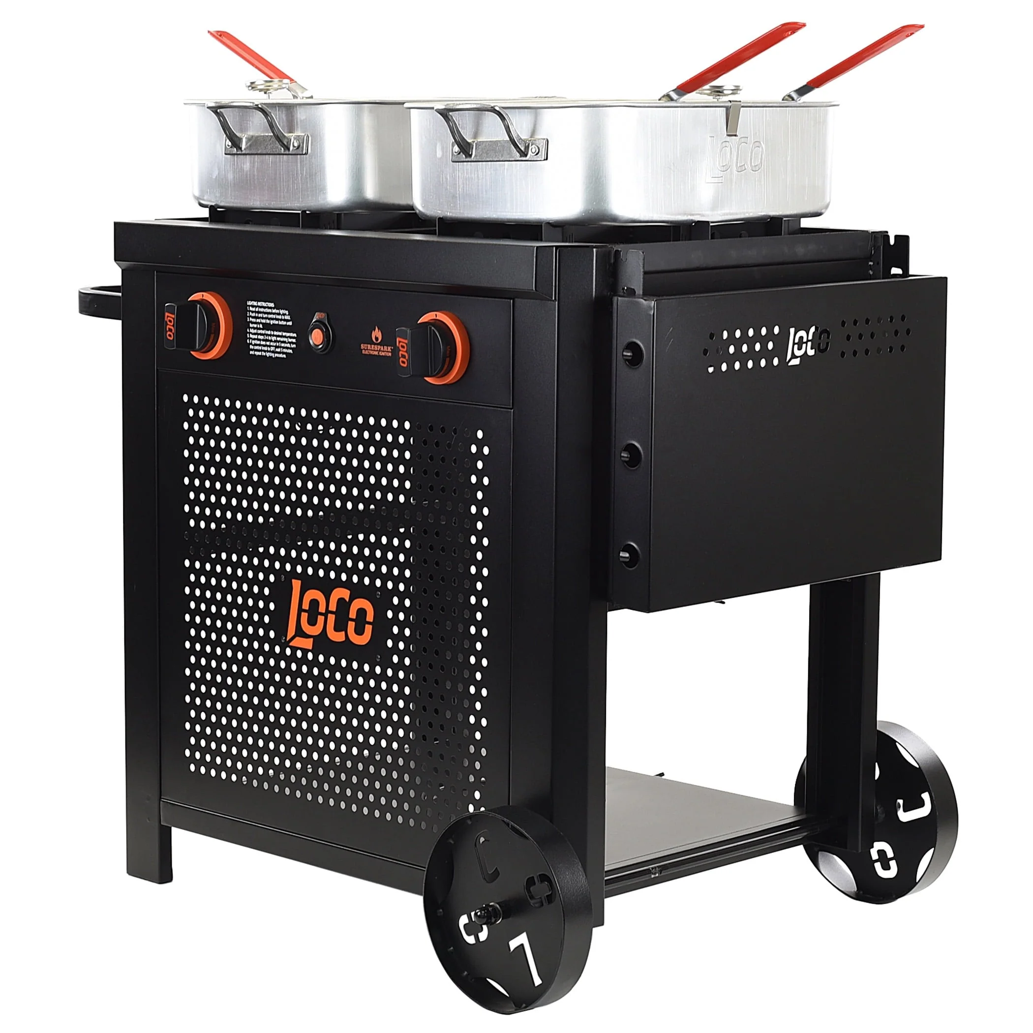 The Loco Cookers Dual Burner Fry Cart has so you can cook different items at the same time using different temps. Move the dual burner fry cart easily with the heavy duty wheels.