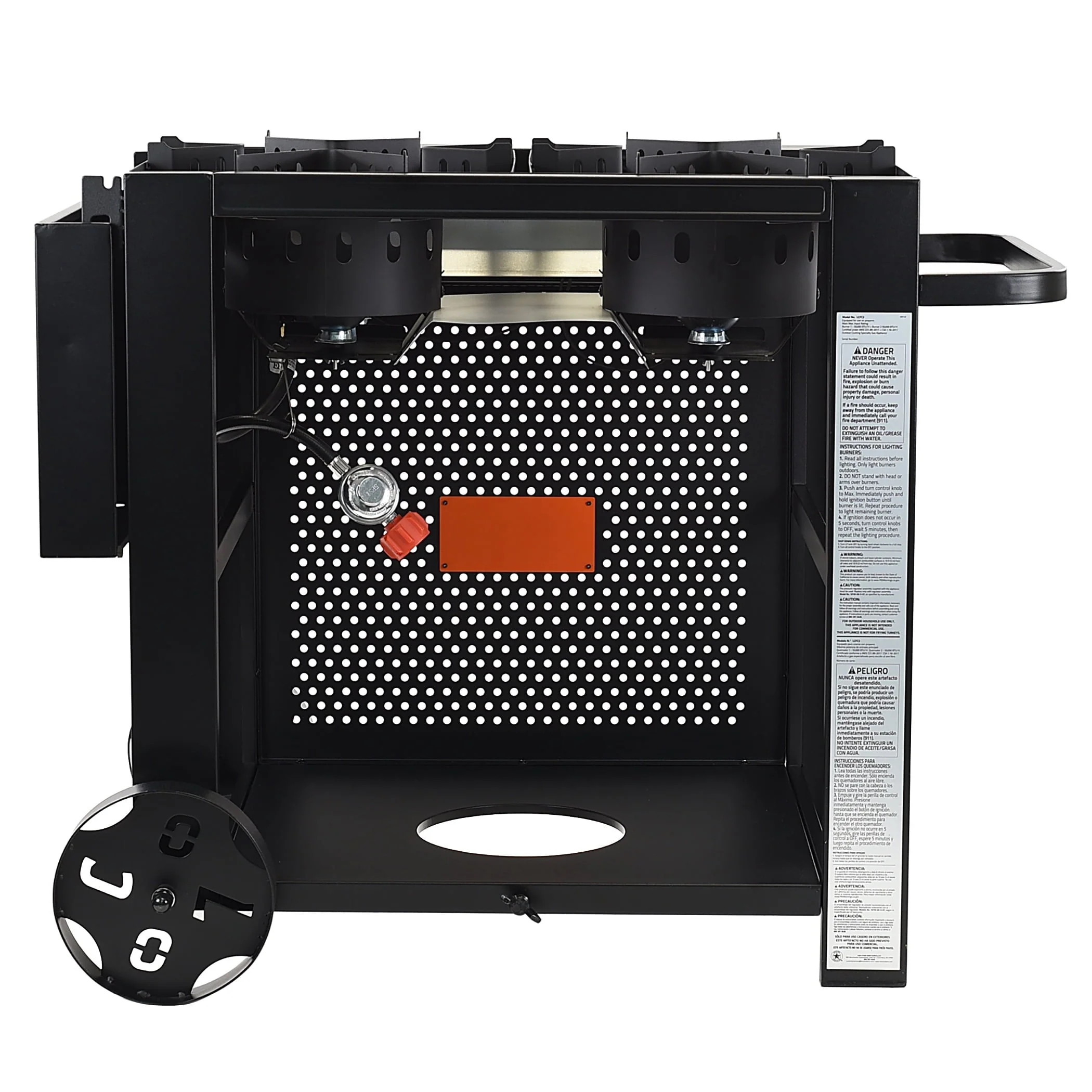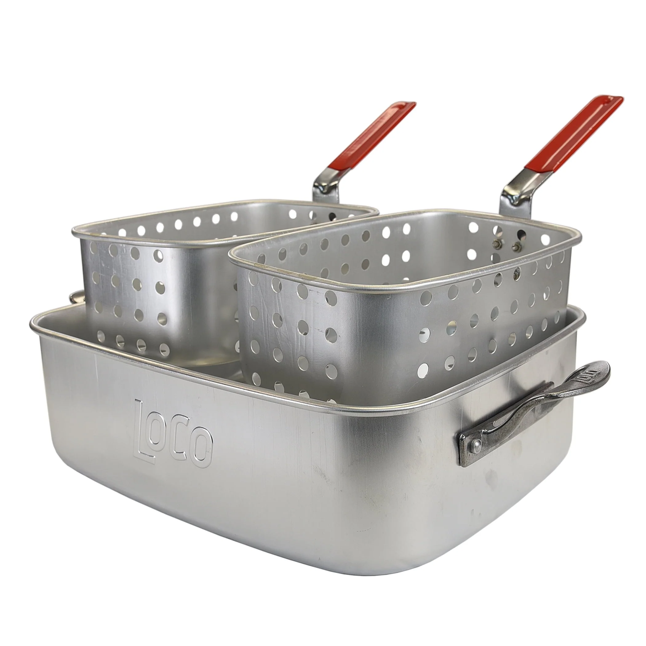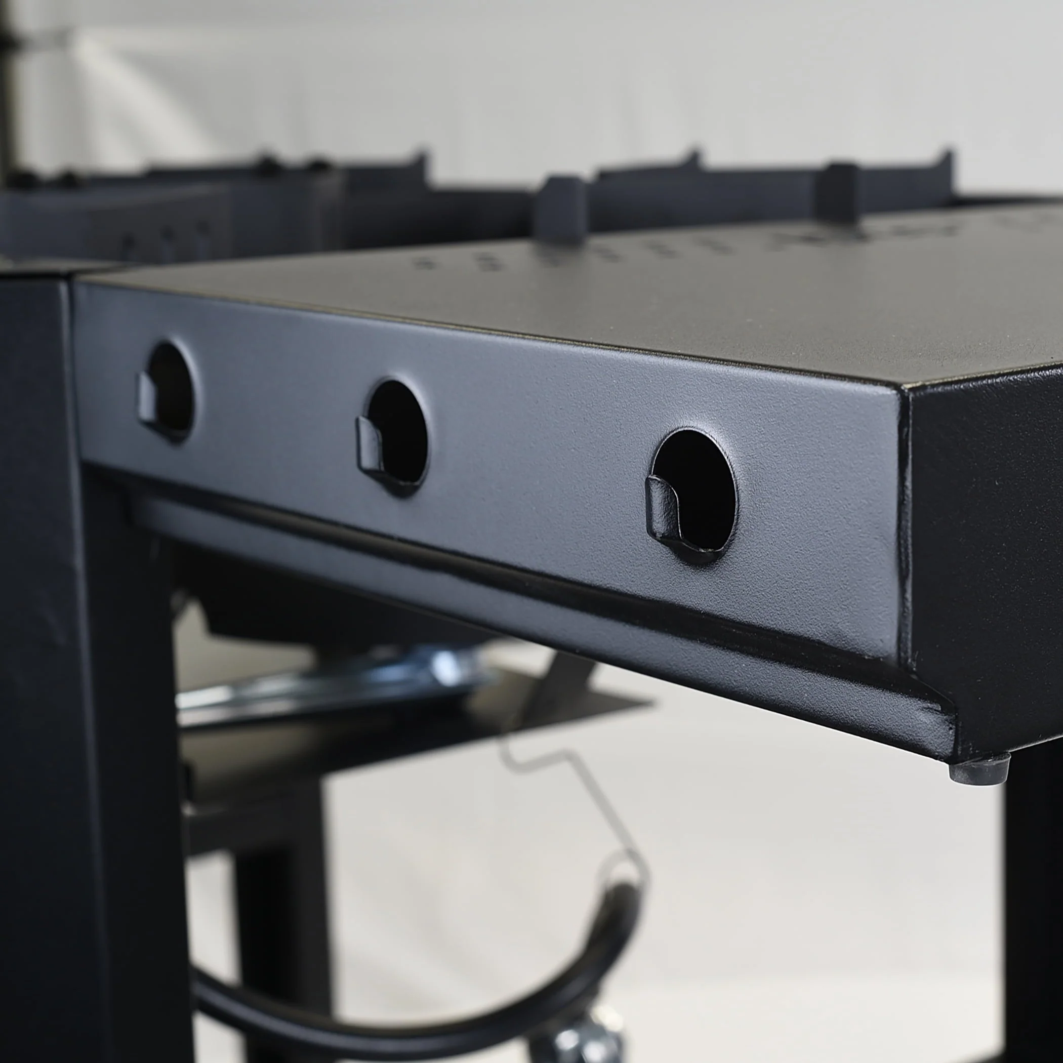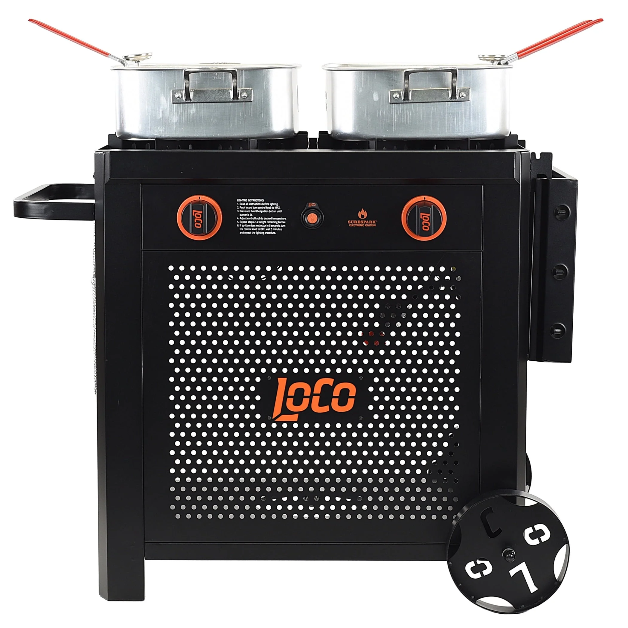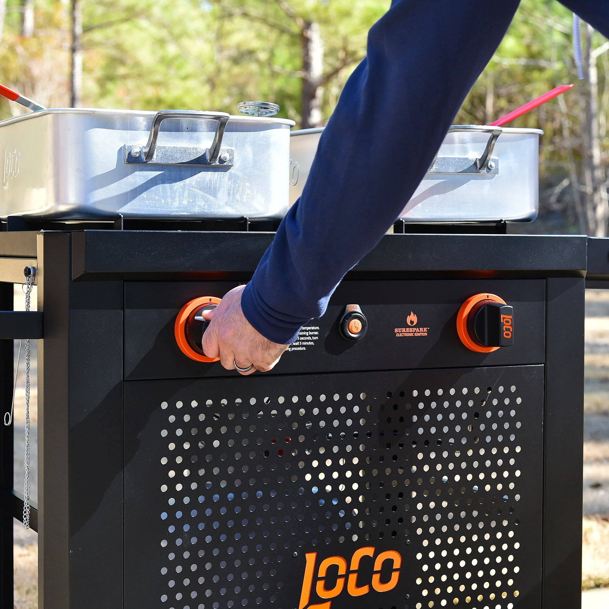 The Loco Cookers Dual Burner Fry Cart has so you can cook different items at the same time using different temps. Move the dual burner fry cart easily with the heavy duty wheels.