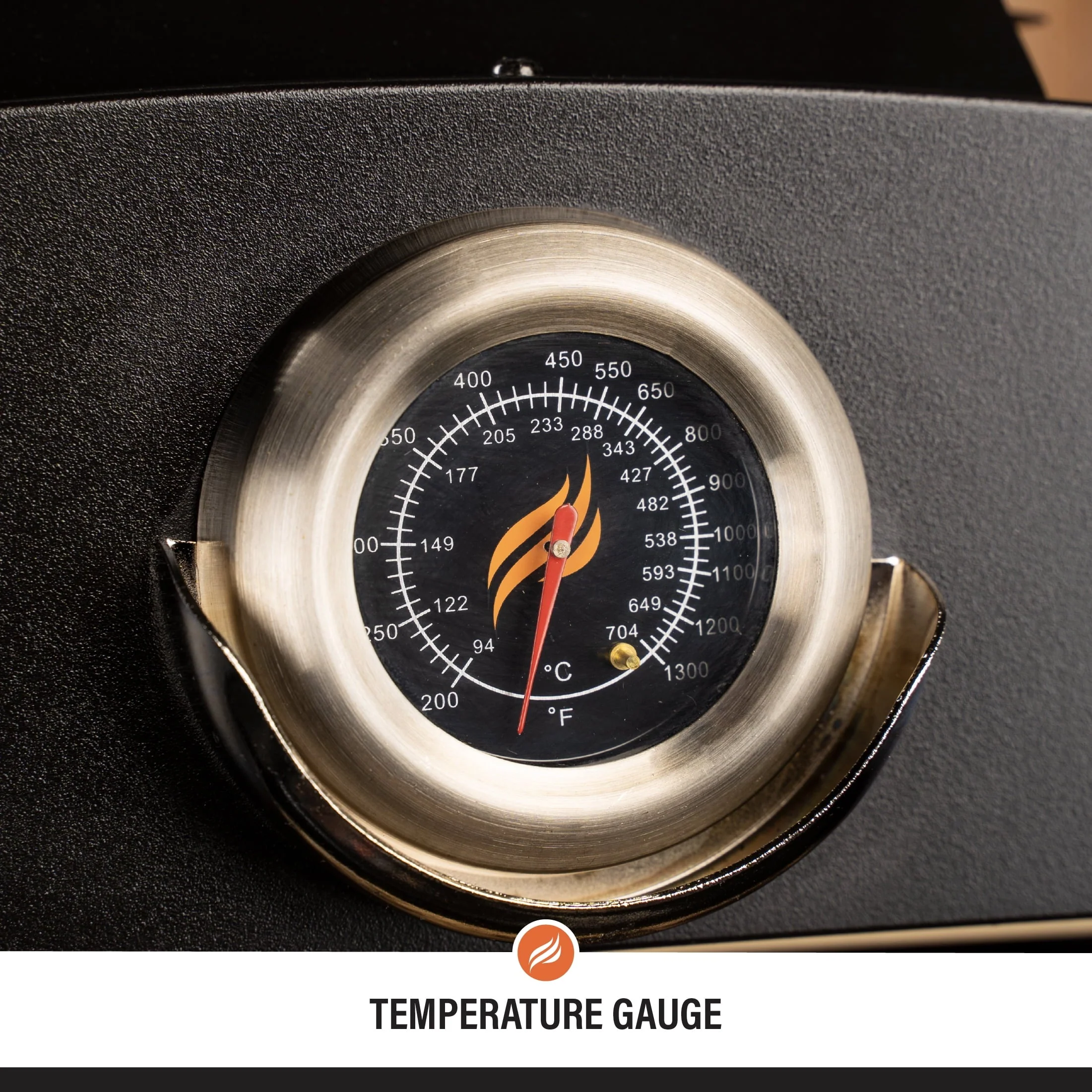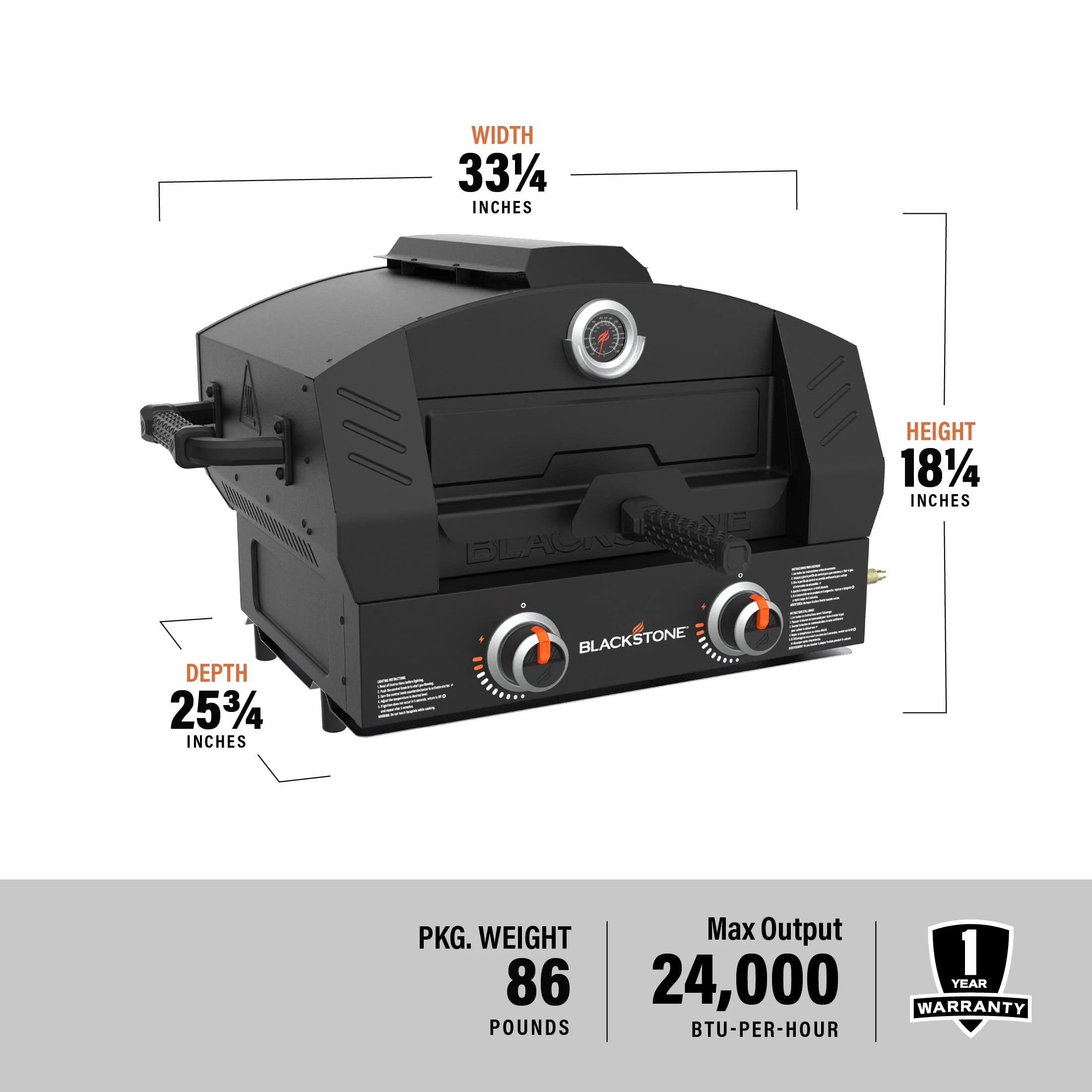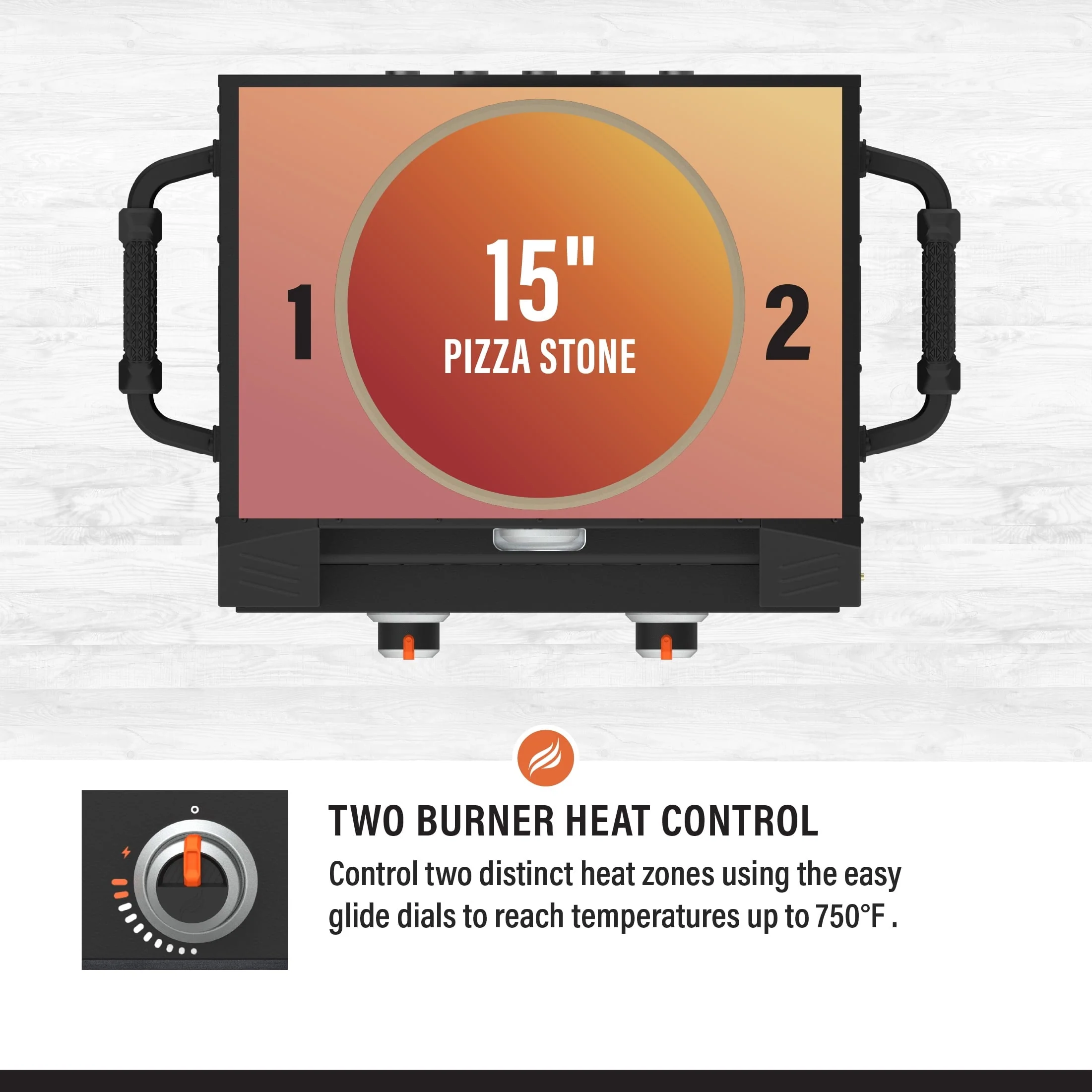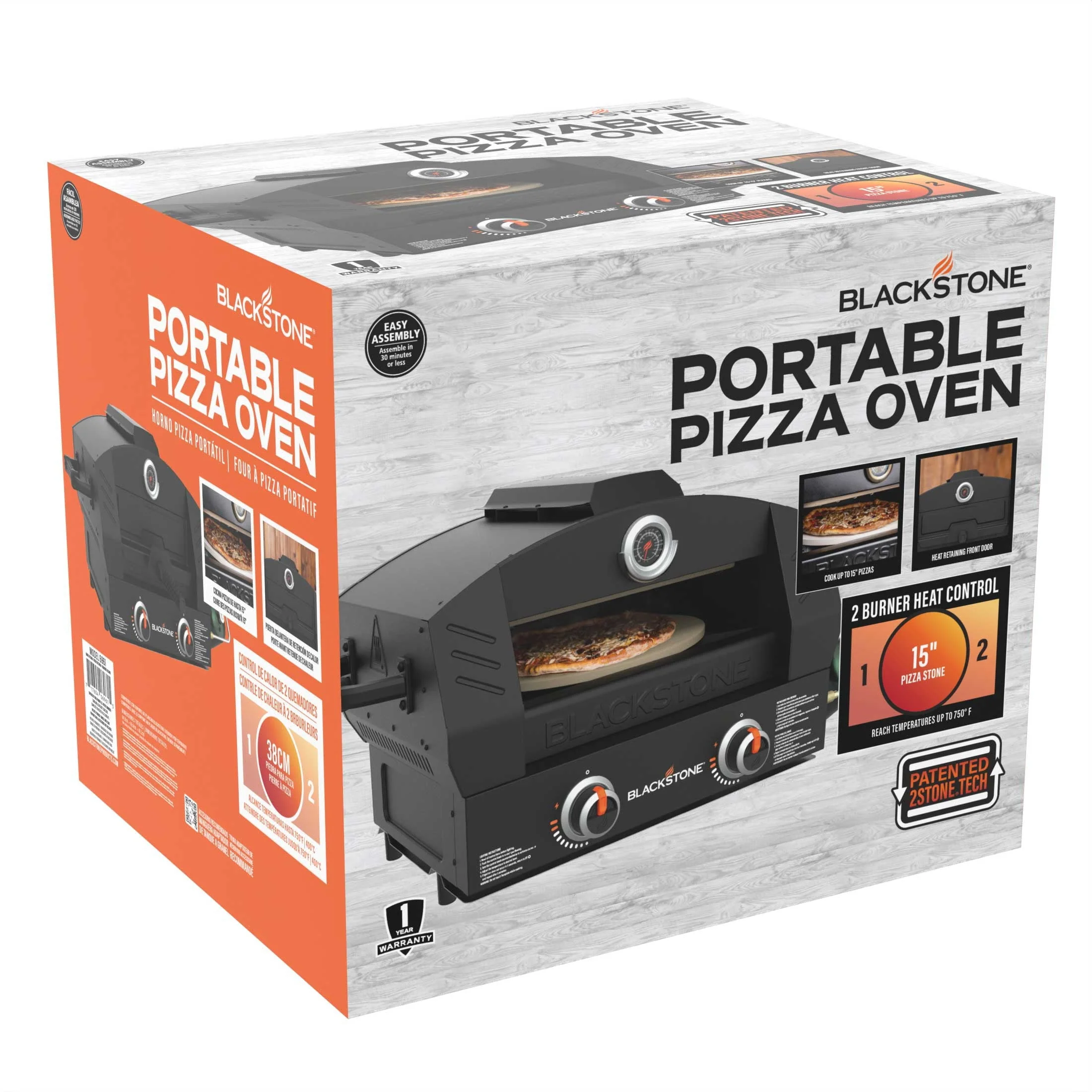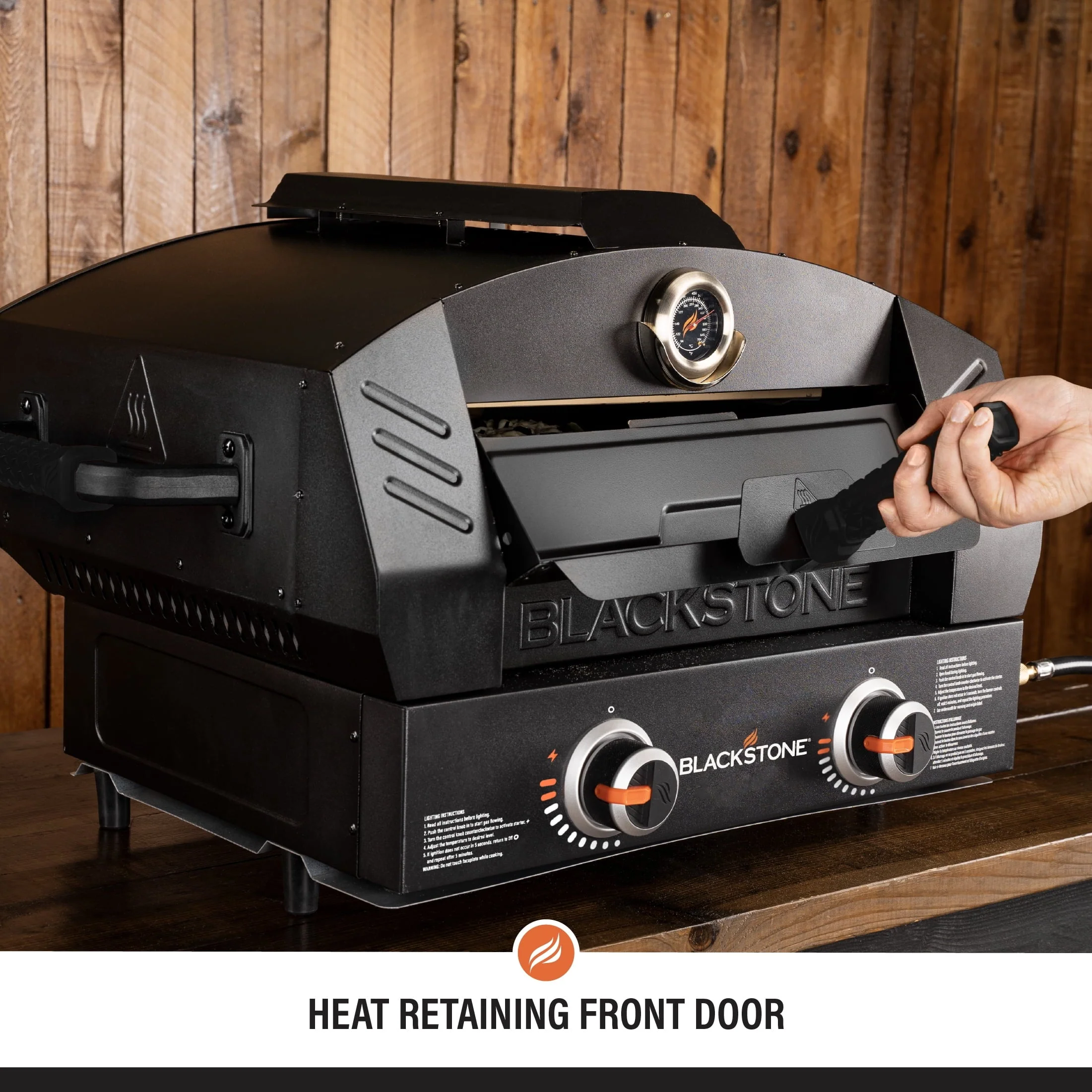 The Blackstone Tabletop Propane Pizza Oven with 15" Cordierite Stones is perfect for any backyard, tailgate or outdoor adventure. The patented 2-stone technology with one stone on top, and another on the bottom, means you don't have to continually turn the pizza as it bakes, unlike a traditional pizza oven. Just rotate the pizza once halfway through baking for a more consistent bake. The heat-retaining door on the front allows for evenly baked crust and toppings every time. Such heat control makes it possible to bake a pizza in just a few minutes! Make pizzas anywhere thanks to the portable size and sturdy handles for ease of transport. Start enjoying homemade pizzas that bake faster than you could get one delivered. Don't limit yourself to just pizzas, because this portable oven can also be used to cook calzones, stromboli, steak, veggies, and so much more.