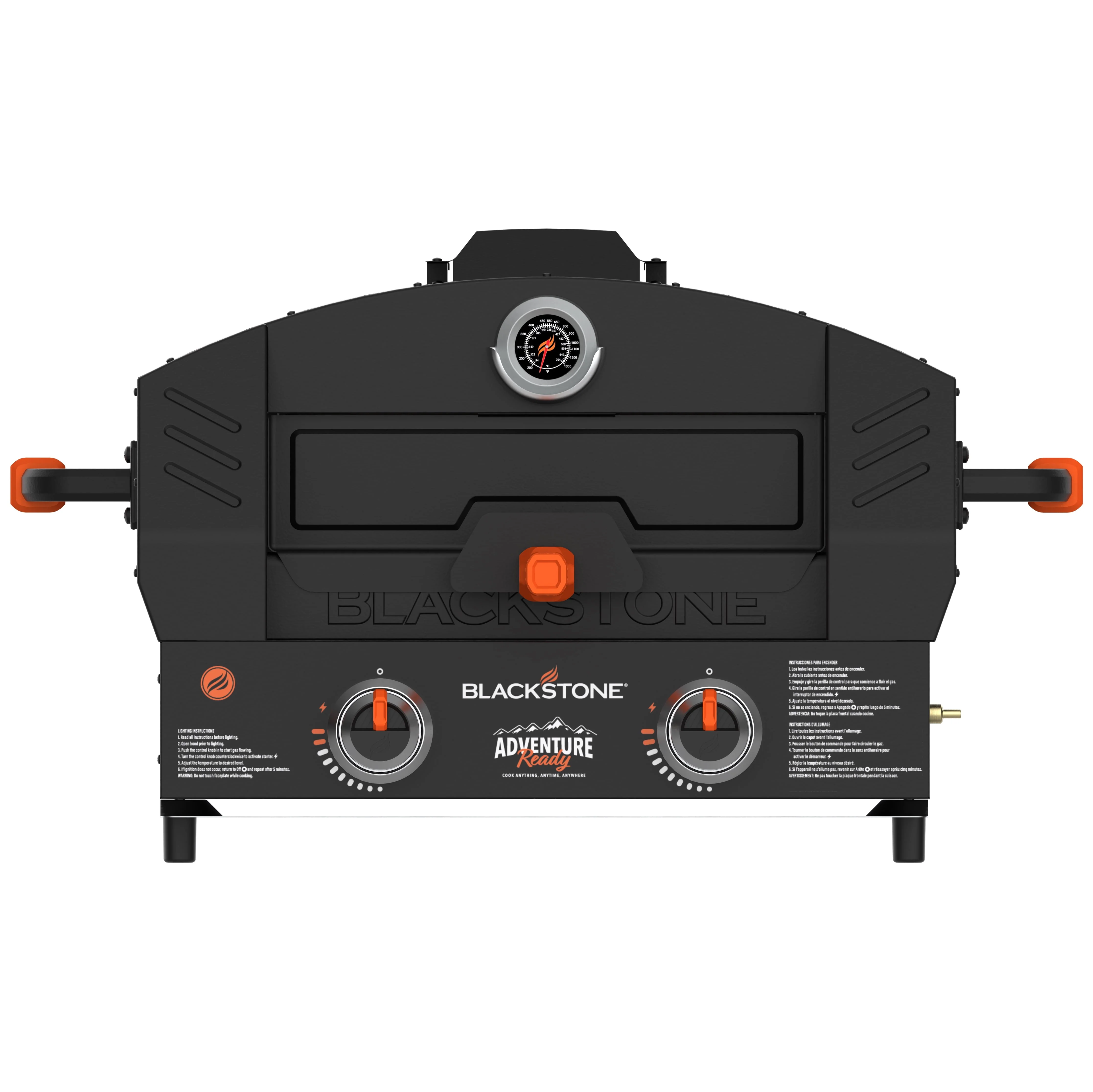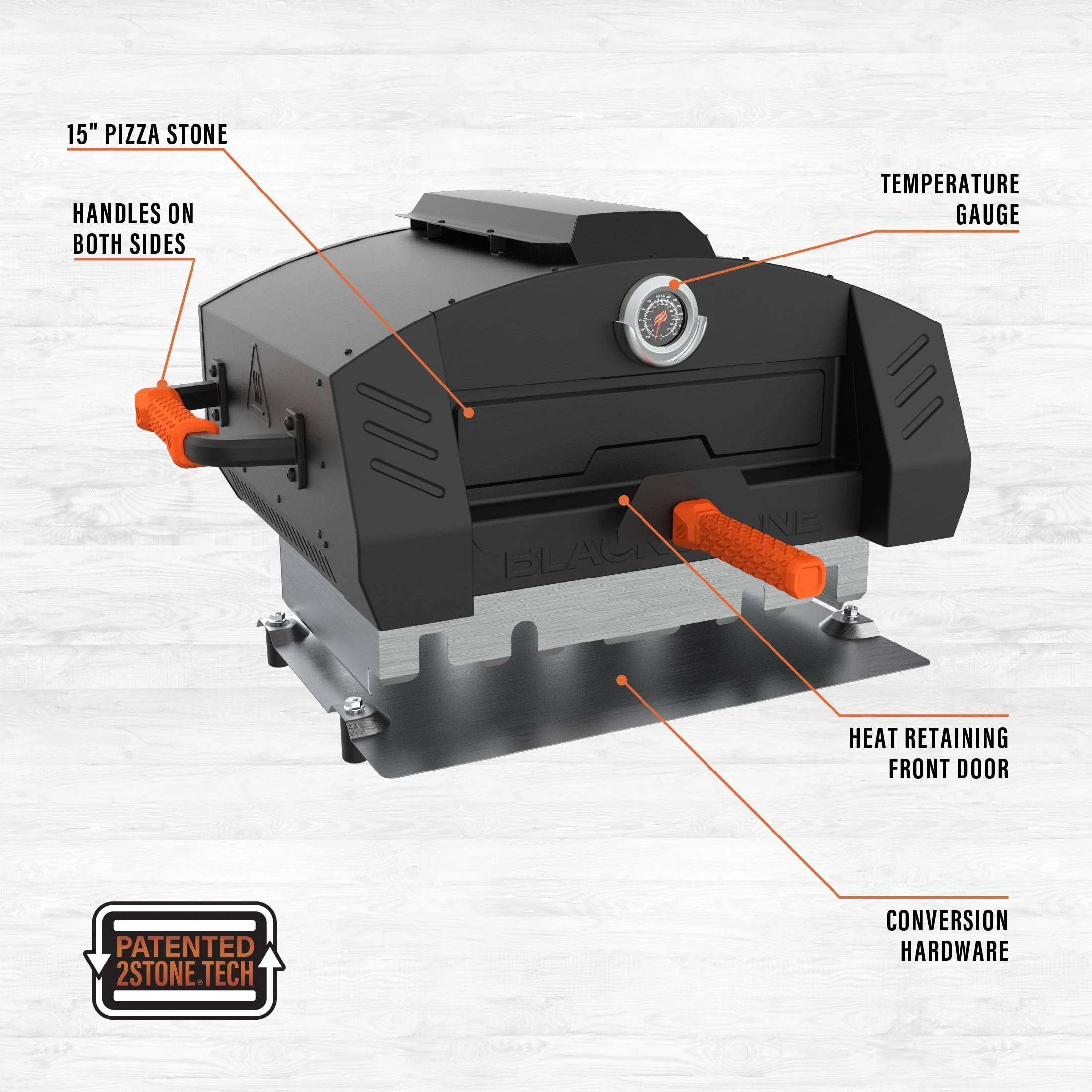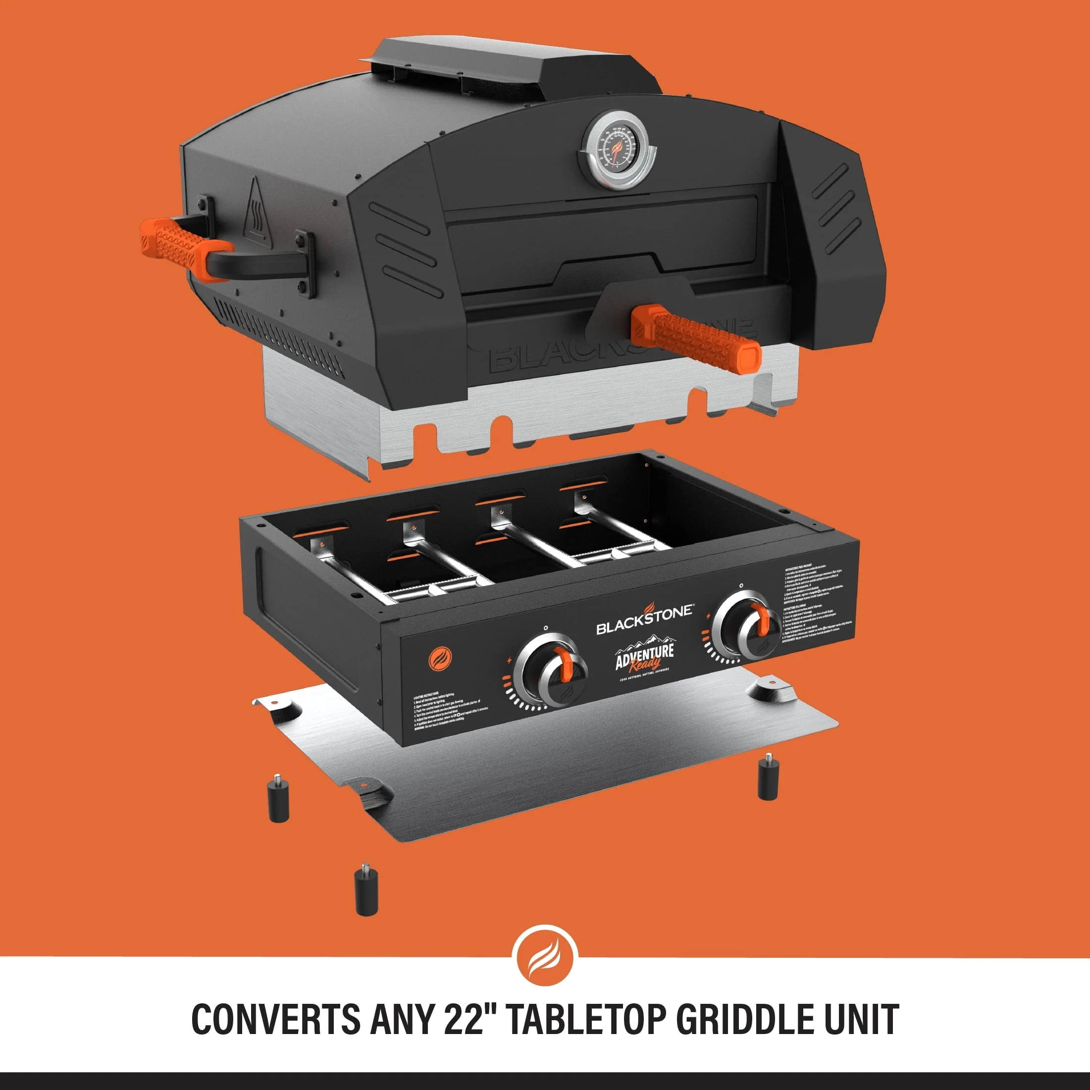Imitate a classic brick oven with the Blackstone Outdoor Propane Pizza Oven Conversion Add On. Convert any standard 22�?Blackstone outdoor tabletop griddle into a fully functioning pizza oven. Two pizza stones means faster baking times, and evenly cooked pizza with a perfectly crispy crust. Unlike traditional pizza ovens, you won't have to continually turn the pizza as it bakes, just rotate the pizza once halfway through baking. Large, industrial handles with heat-resistant grips make this pizza oven add on practical and portable. Trap in heat of up to 700+ degrees Fahrenheit with the sliding door while smoke filters through the vents on top of the oven. Get outdoors and bake a fresh pizza to share with your family and friends. If you are a pizza lover, you need to experience how pizza was meant to be baked with this ingenious pizza oven converter.