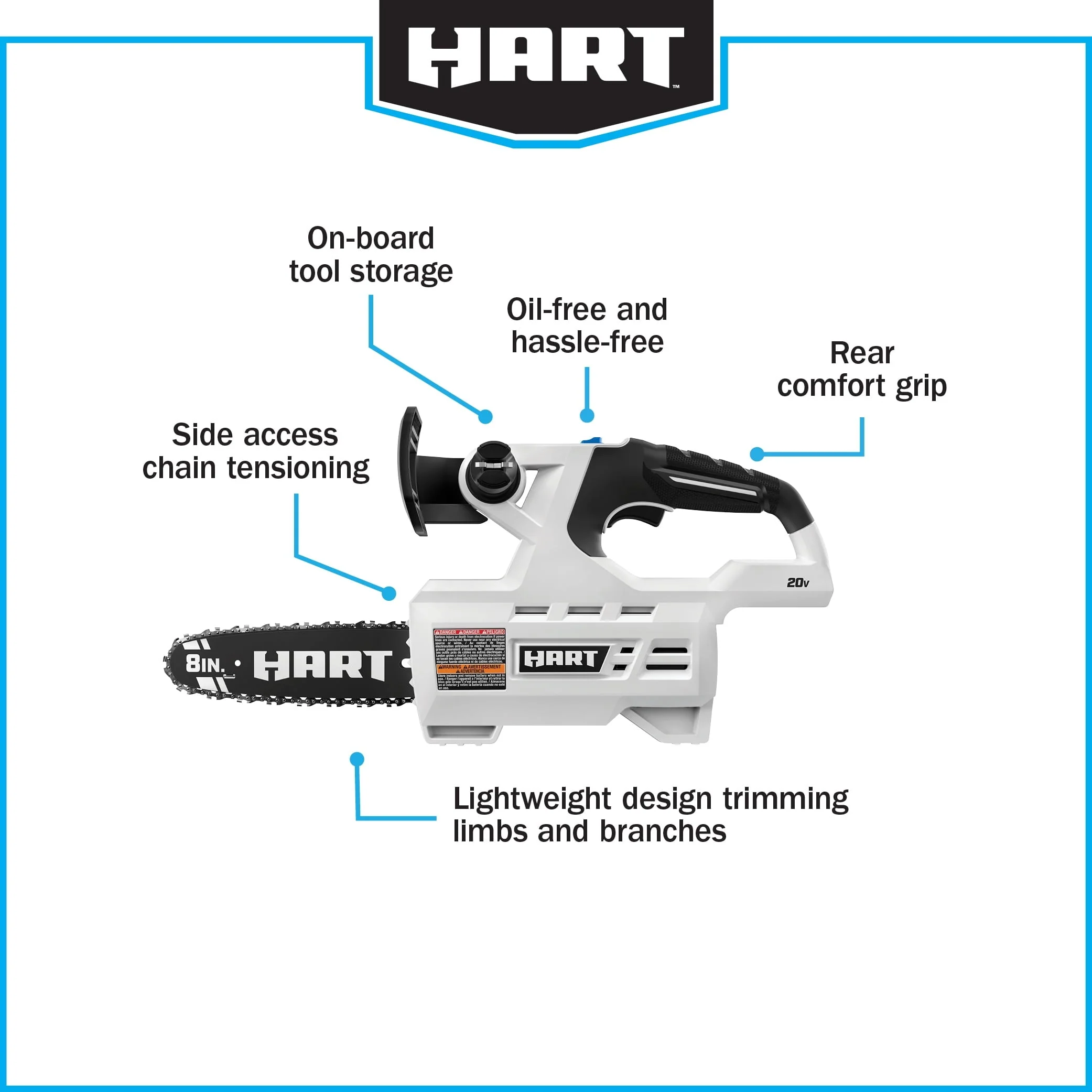 The HART 20-Volt 8-Inch Pruning Saw Kit is the versatile solution for all your light-duty pruning and limbing needs. Its lightweight and compact design ensures precise trimming of limbs and branches, using its maximum cutting diameter of 6-inches to slice with ease. The best part? There's no need for bar & chain oil, saving you the hassle of purchasing and using additional supplies. Enjoy the ultimate user convenience without sacrificing quality. Designed with your comfort in mind, the saw features a rear comfort grip, providing enhanced user comfort even during extended periods of use. Say goodbye to discomfort and hello to effortless pruning. Experience the power of the HART 20-Volt 8-Inch Pruning Saw Kit today. Includes: (1) 20-Volt 8-inch pruning saw, (1) 20-Volt 2.0Ah lithium-ion battery, (1) 20-Volt fast charger, (1) scabbard, (1) wrench, (1) safety tip, and (1) operator's manual. The HART 20-Volt battery in this kit powers all HART 20-Volt tools, outdoor equipment, automotive, and lifestyle items!