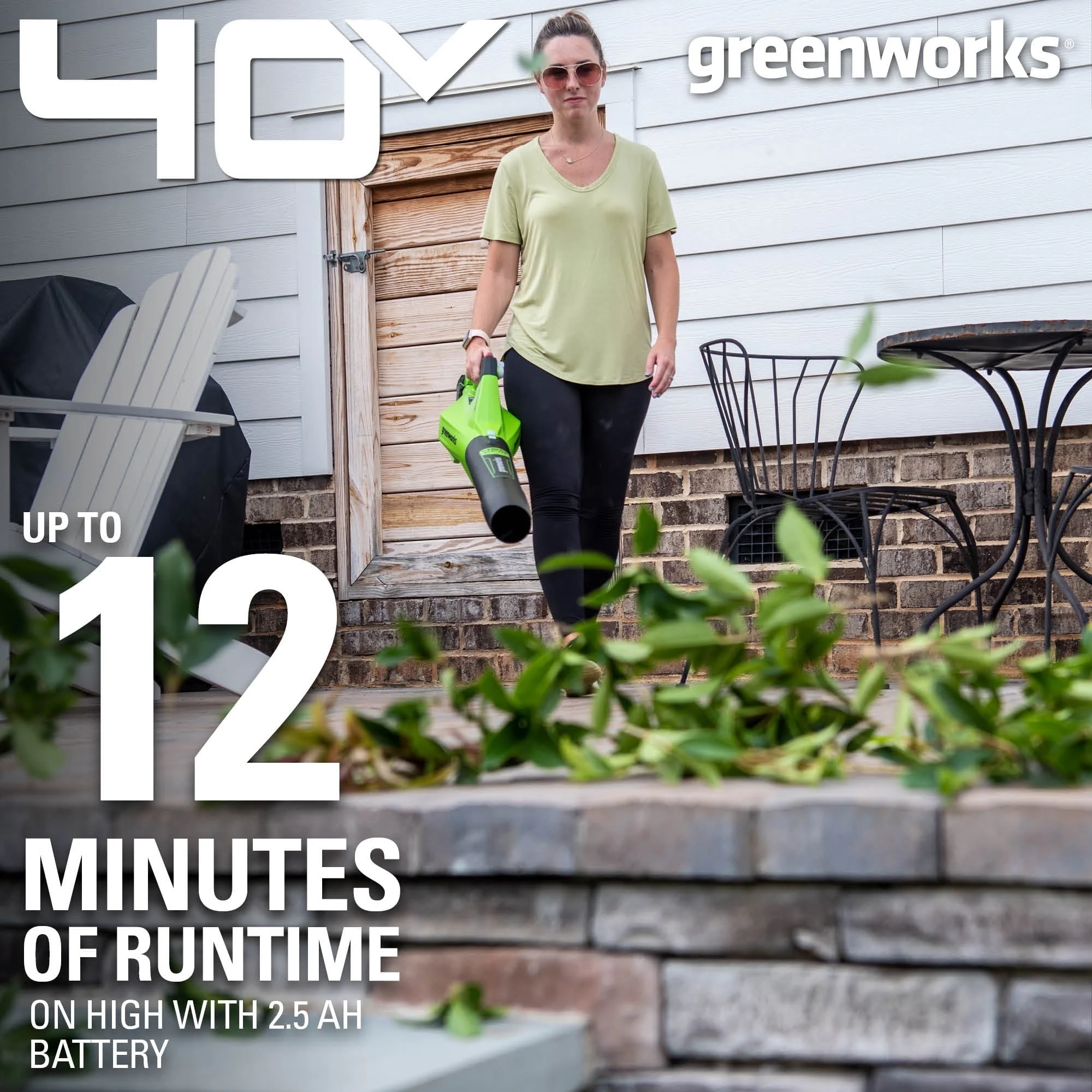 Cordless outdoor power tools are ideal for homeowners like you who are simplifying and focusing on what's essential to getting the most out of life. Introducing the Greenworks 40V 450 CFM Leaf Blower with 2.5Ah Battery & Charger, the ultimate solution for keeping your lawn leaf-free and pristine. With its variable speed trigger, this leaf blower delivers wind speeds of up to 120 MPH and generates 450 CFM, making it easy to effectively blow away leaves from your lawn. Equipped with Intelligent Brushless Motor Technology, this leaf blower provides two times more torque, resulting in more power, longer runtimes, quiet operation, and extended motor life. Say goodbye to the hassle of pull-starting, as this blower features a convenient push-button start for effortless operation. To further enhance user convenience and ensure precise speed control, the Greenworks Leaf Blower comes with cruise control functionality. Simply set your desired speed and let the blower do the work for you. What's more, the Greenworks 40V Leaf Blower is compatible with the Greenworks 40V Li-ion system, which means higher efficiency and longer runtime. Easily swap batteries and power an assortment of tools to complete all your yard work seamlessly. With the purchase of the Greenworks 40V 450 CFM Leaf Blower, you'll receive a 2.5Ah battery and charger, ensuring you have everything you need to get started right away. And to give you peace of mind, this product is backed by a 3-year limited tool and battery warranty. Experience the power, convenience, and durability of the Greenworks 40V 450 CFM Leaf Blower, revolutionizing the way you tackle leaf cleanup in your yard.