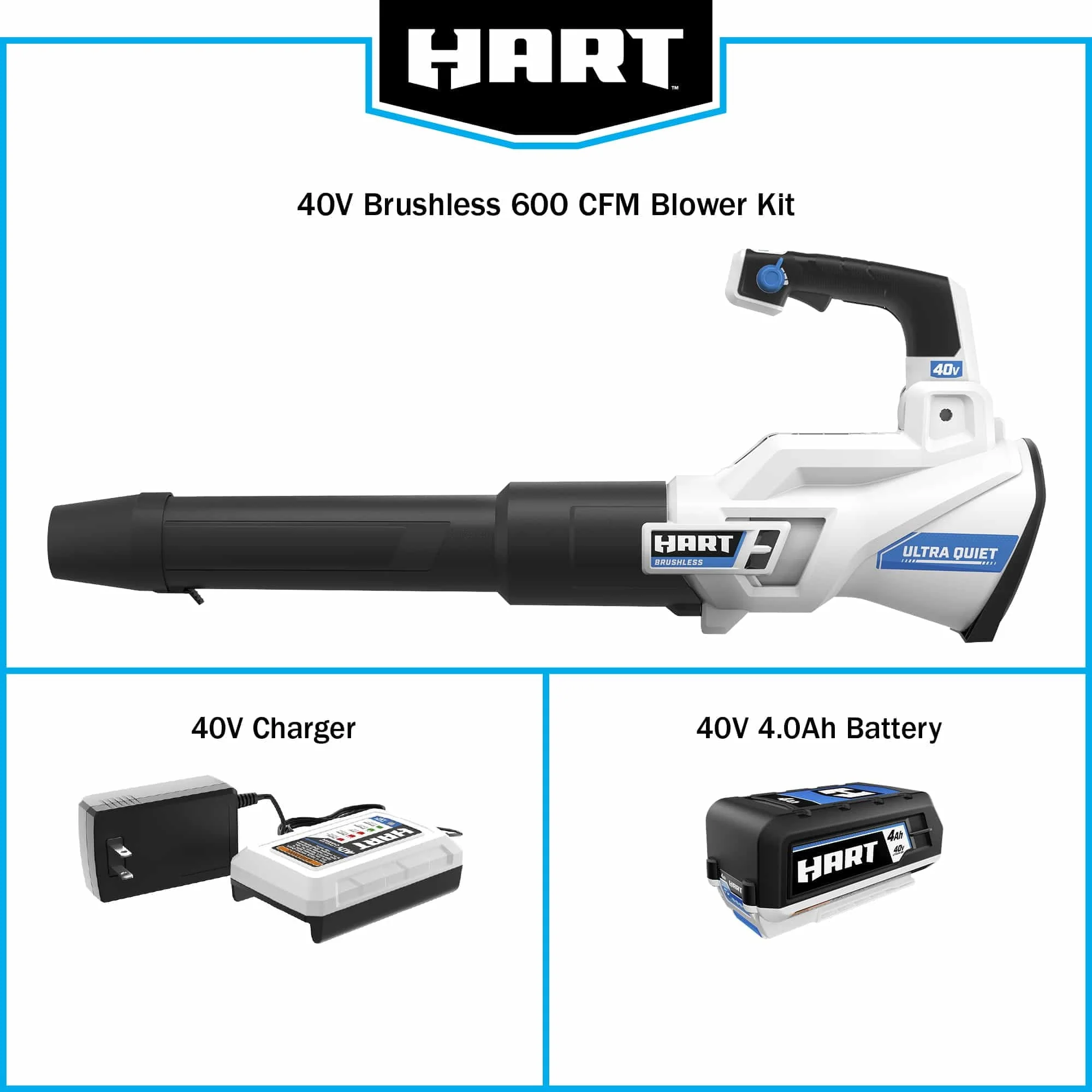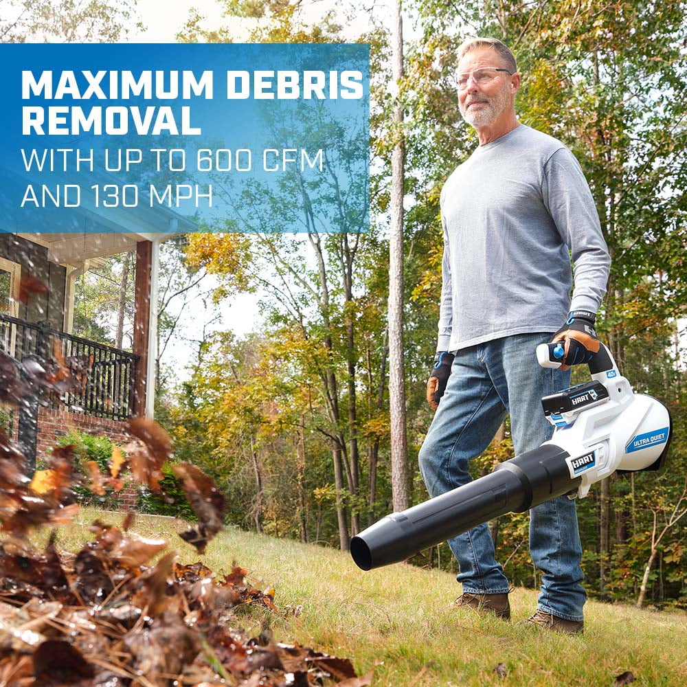 This 40V Brushless 600 CFM Blower Kit will make fall cleanup feel so new and easy. This tool not only clears stubborn materials such as wet leaves, but also lifts and moves twigs, grass clippings, and more. And it does so quickly and efficiently. The turbo fan design provides 600 CFM and 155 MPH of maximum clearing power, while the variable speed trigger gives you total control. Lightweight, compact design provides the ultimate user comfort during extended periods of use. Plus, there’s no stubborn start-up cord to deal with. Just press the turbo button for maximum clearing power. Battery power also eliminates the fumes and mess that come with gas-powered blowers. Brushless Motor Technology delivers more power, longer runtime, and longer motor life. Plus, it’s cordless, so you’re free to work anywhere without tripping over or getting tangled up in cords. Finally, the *Ultra-Quiet Technology* makes it our quietest blower to date. The included 40V 4.0Ah battery is compatible with all HART 40V tools. Disclaimer: *compared to brushed blower.
