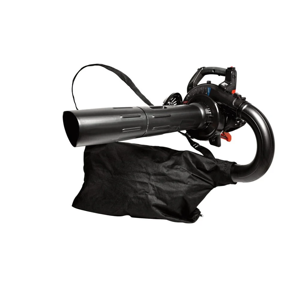 The TB272V gas leaf blower/vac gas leaf blower is powered by a 27cc, 2-cycle engine with a balanced full-crank design. High volume air stream speeds up to 150 MPH and 450 CFM clear leaves and debris from yards and hard surfaces. A vacuum kit with a high capacity 1.5-bushel collection bag is included for shredding and collecting leaves and debris. Designed for easy pull starts with Spring Assist technology and a simple Prime, Flip and Go process, this blower also includes cruise control to help make it easy to maintain airflow while working.