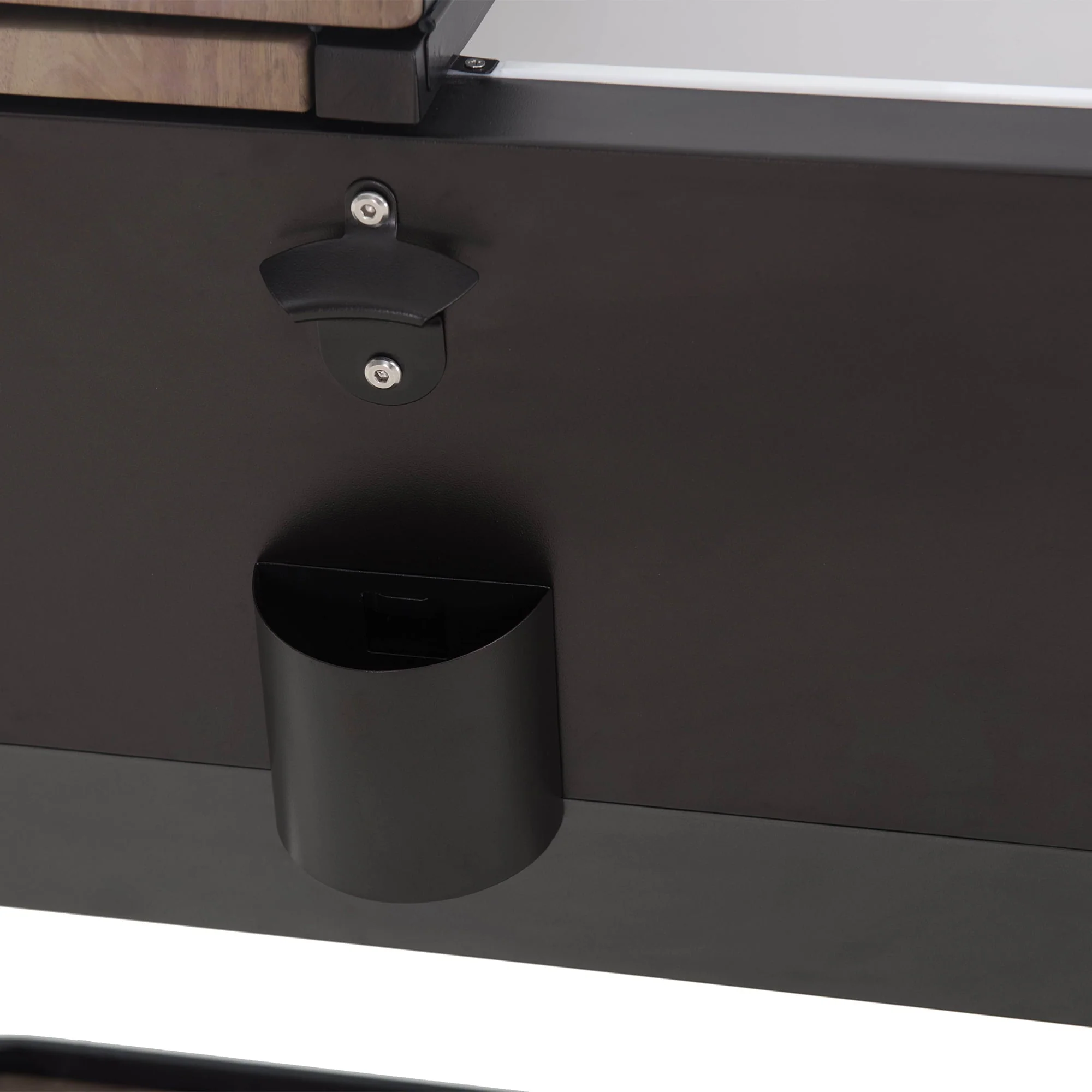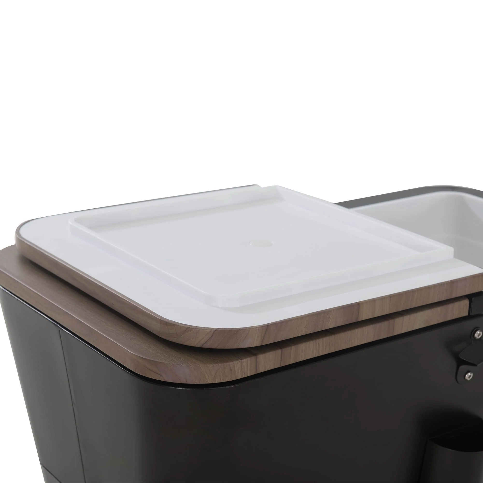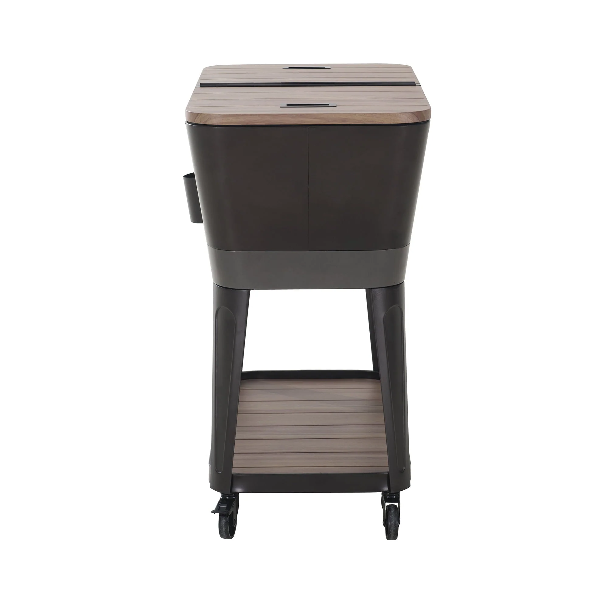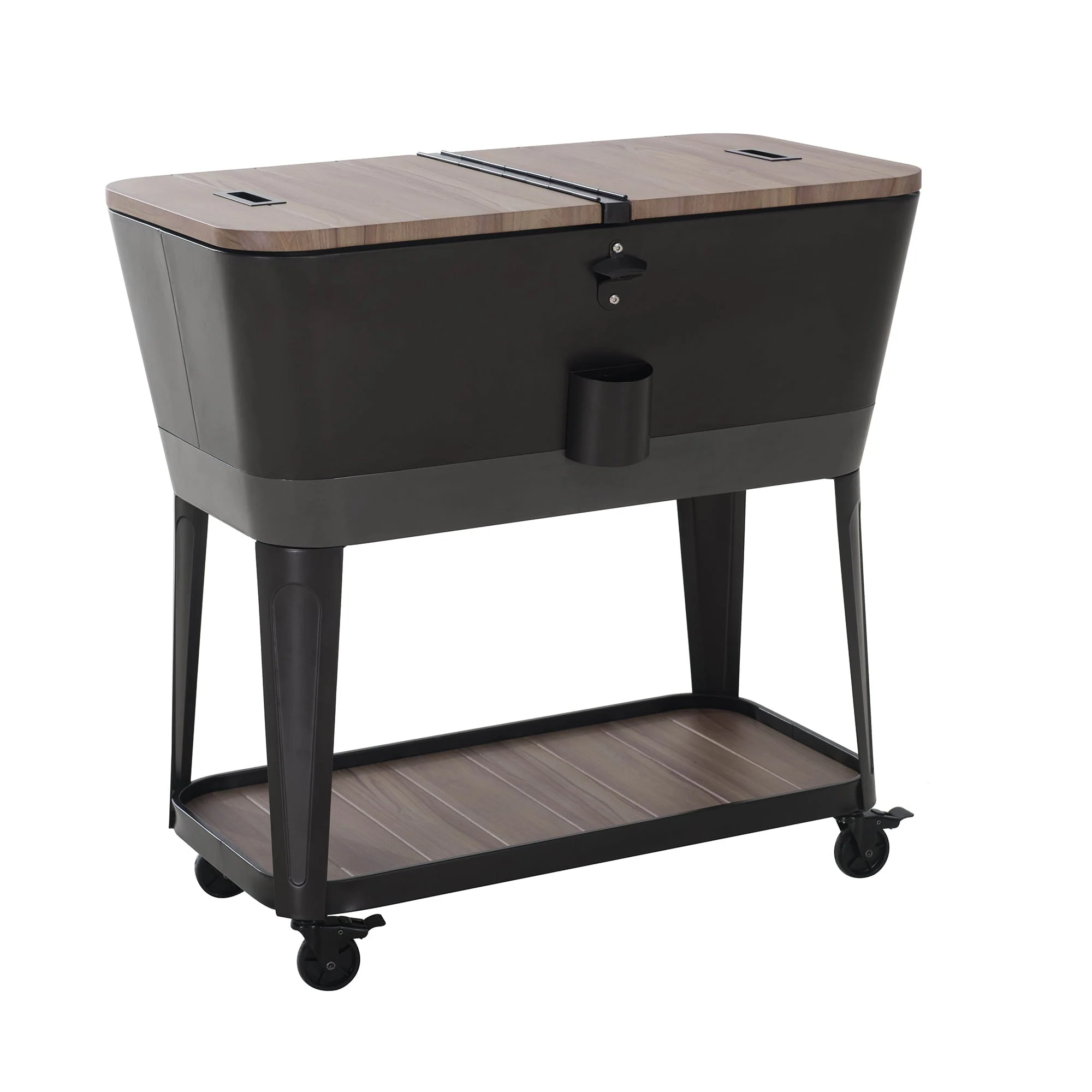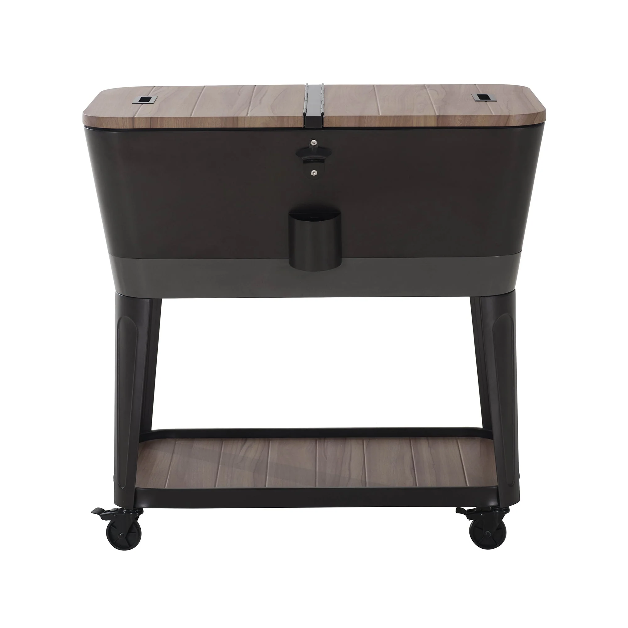 Keep your drinks cool in style with this patio cooler cart by Sunjoy, the world’s leading ready-to-assemble outdoor structure maker. This is the perfect way to store and serve beverages at your next gathering. This rolling cooler is made of rust-resistant powder-coated steel with a natural-looking wood grain finish. Two recessed metal pull handles are included to make the cooler easy to access. The lower shelf is a great place for extra storage and the built-in bottle opener with a cap-catcher ensures you will always be able to open your favorite beverage. Use the wheels locking feature to ensure stability once the cooler cart is positioned where desired. The cooler comes with a stainless-steel drain plug to make clean-up a breeze when the party is over.