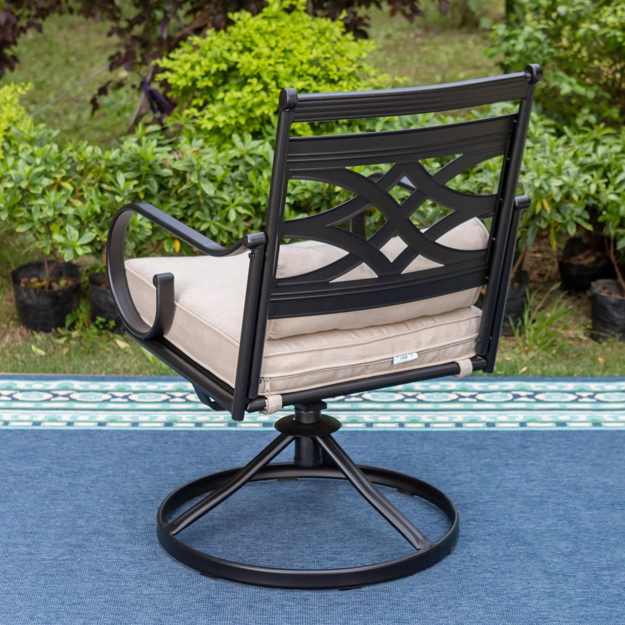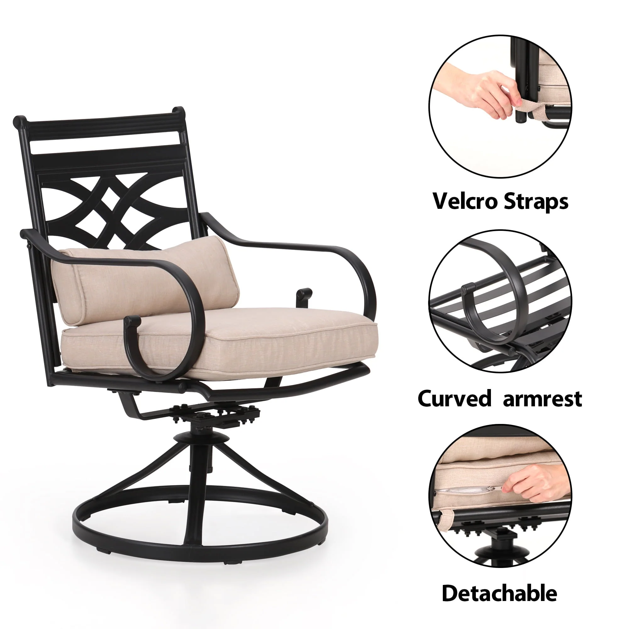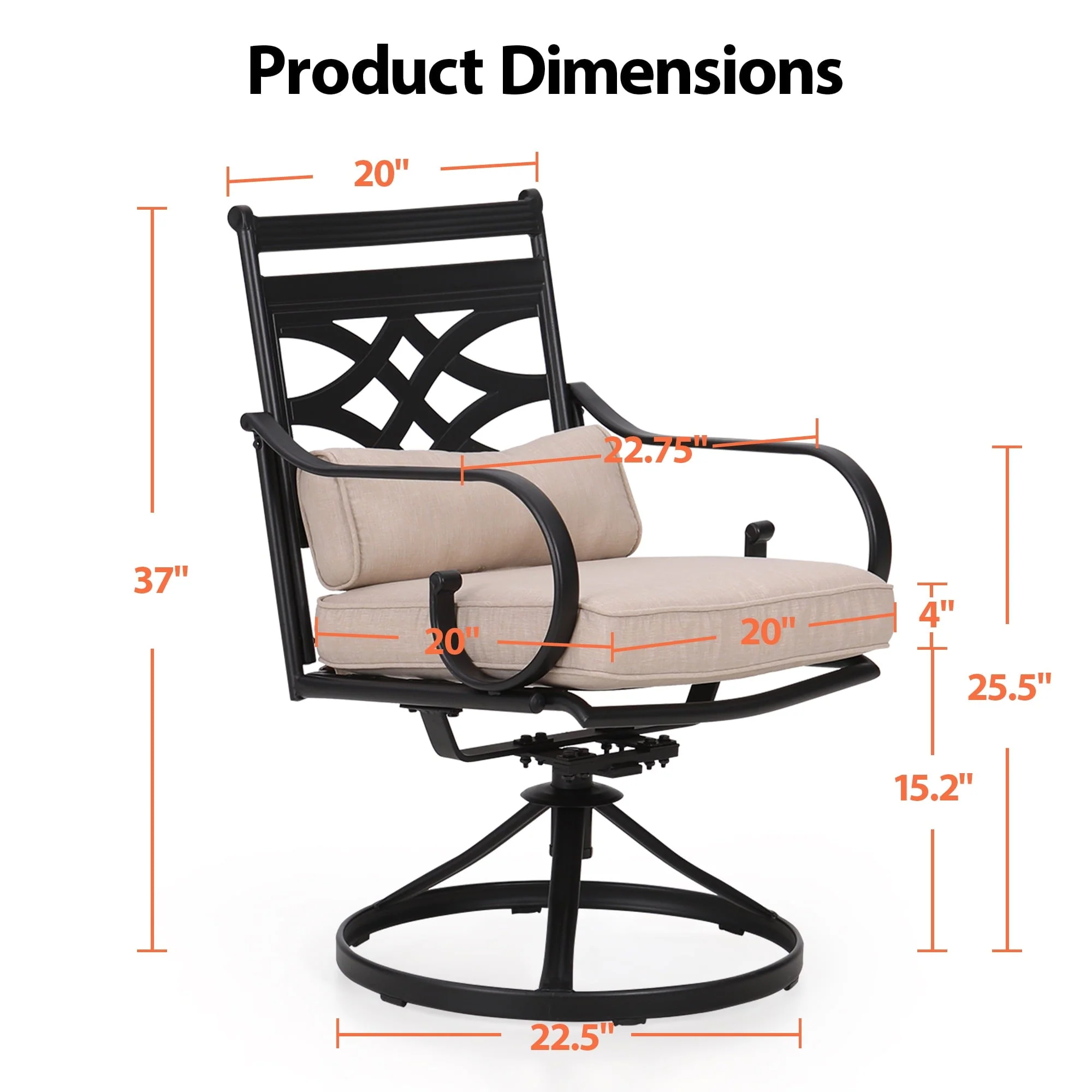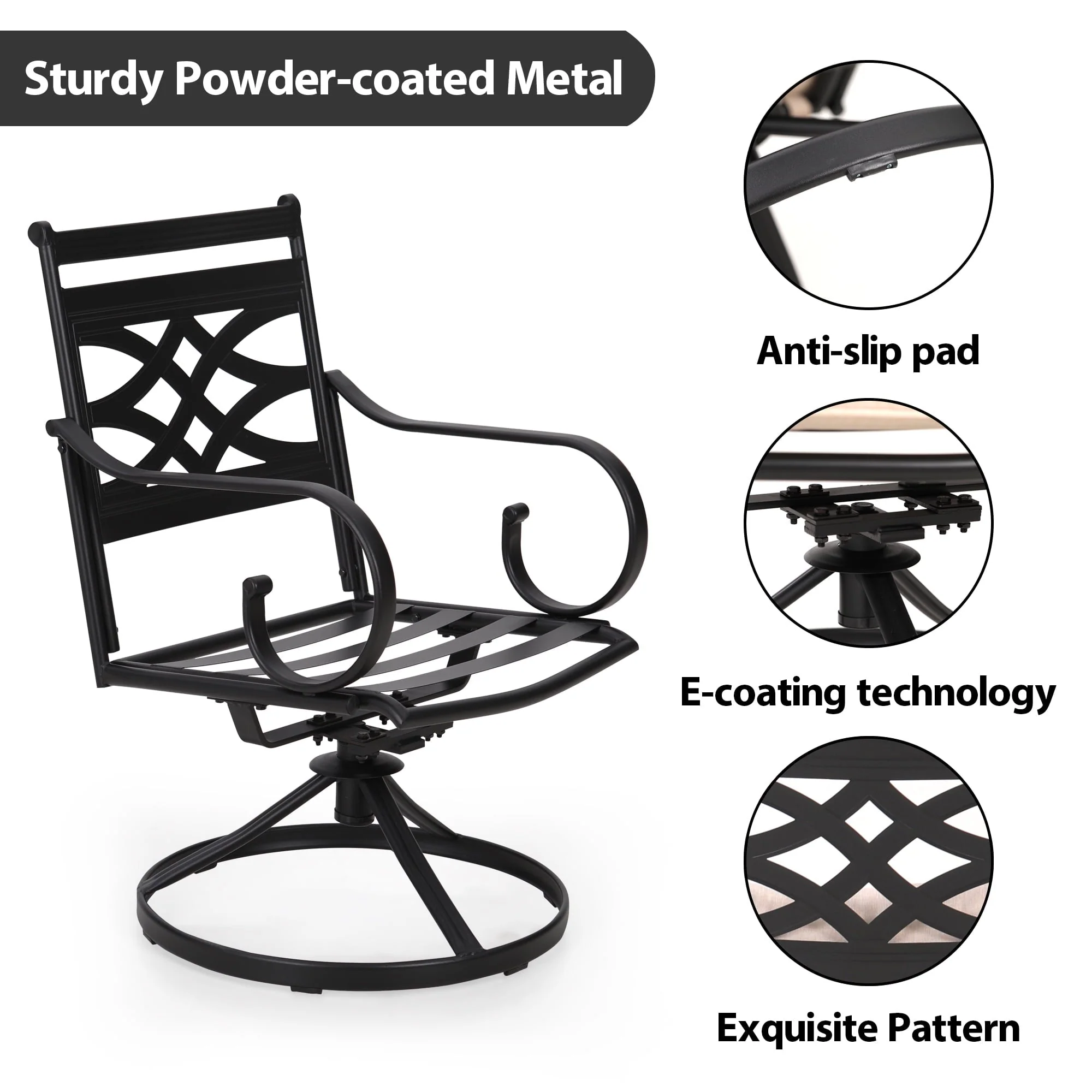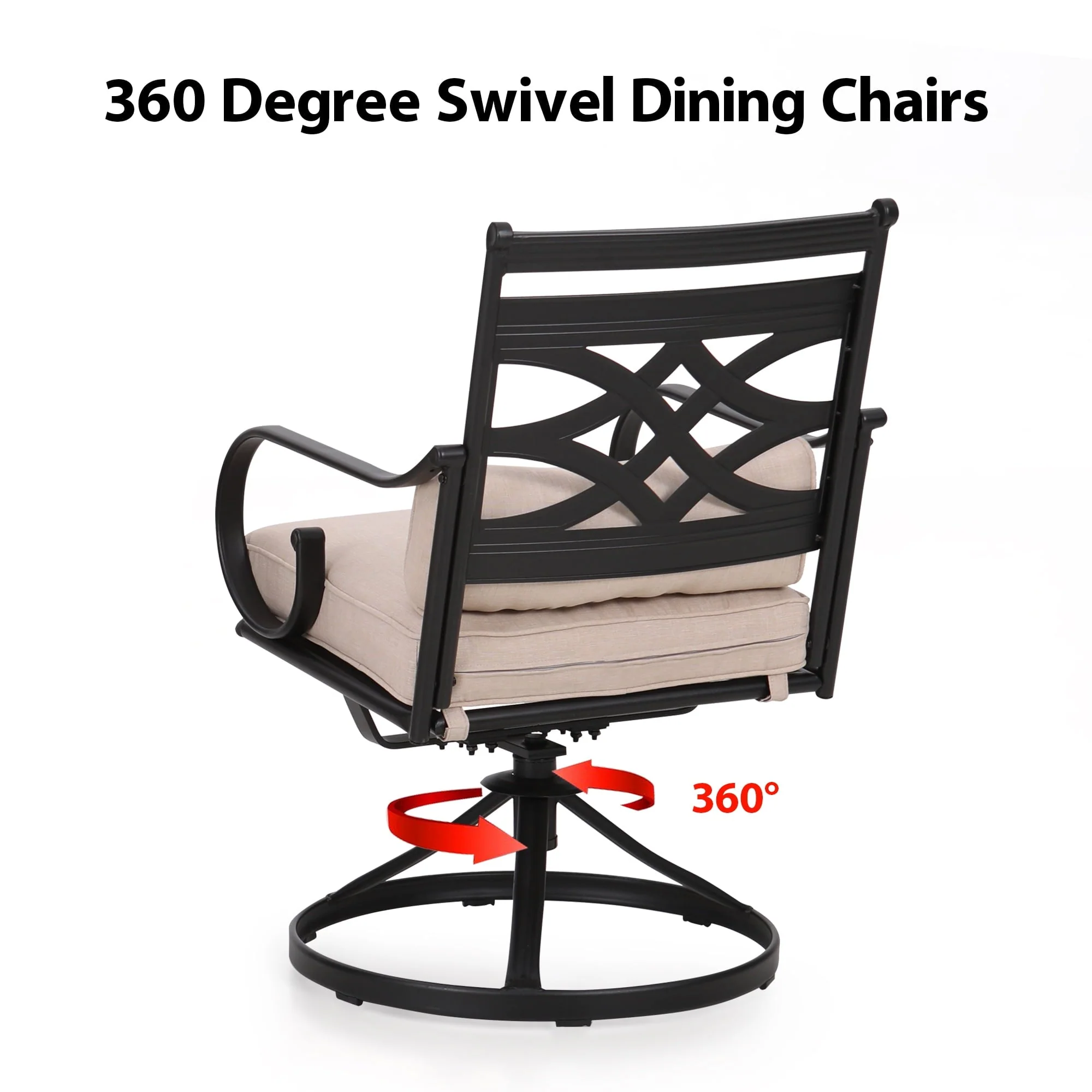 This MF Studio 5 Piece patio outdoor dining set, included 4 Piece 360-degree swivel chairs and 1 Piece metal dining table. MF Studio is a designer's brand and manufacturer which indicates to provide high-quality leisure garden furniture to meet the continuously expanding market. The chairs feature a high-quality steel frame with an e-coating technology that can support 360 degrees swivel, rust-resistant, weather-resistant, anti-deformation, and long-time use. Meanwhile, we also provide a cushion & pillow with a high-density sponge. The round & slat metal table is made of powder-coated steel, which is all-weather and rust-resistant. Don't hesitate to take them home.