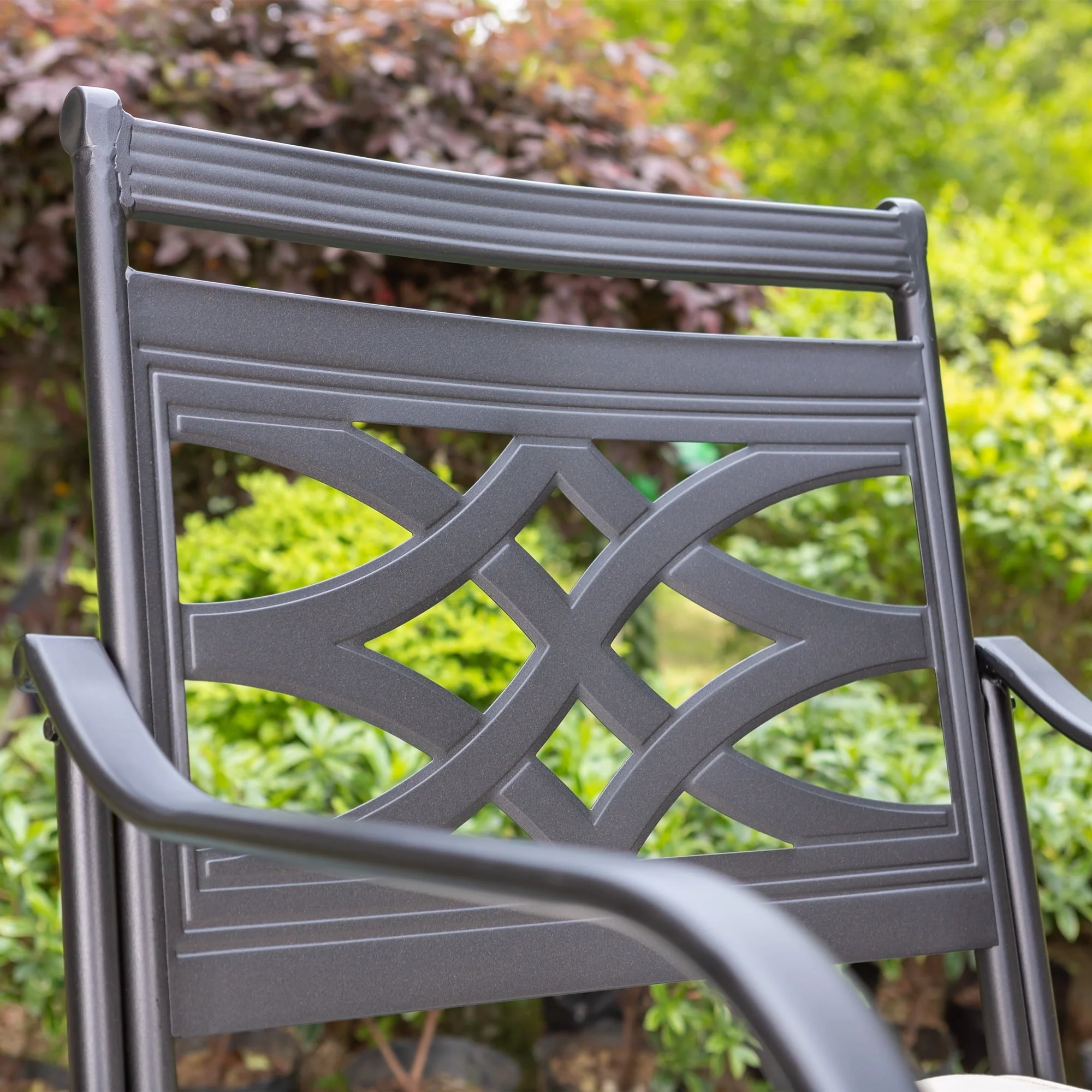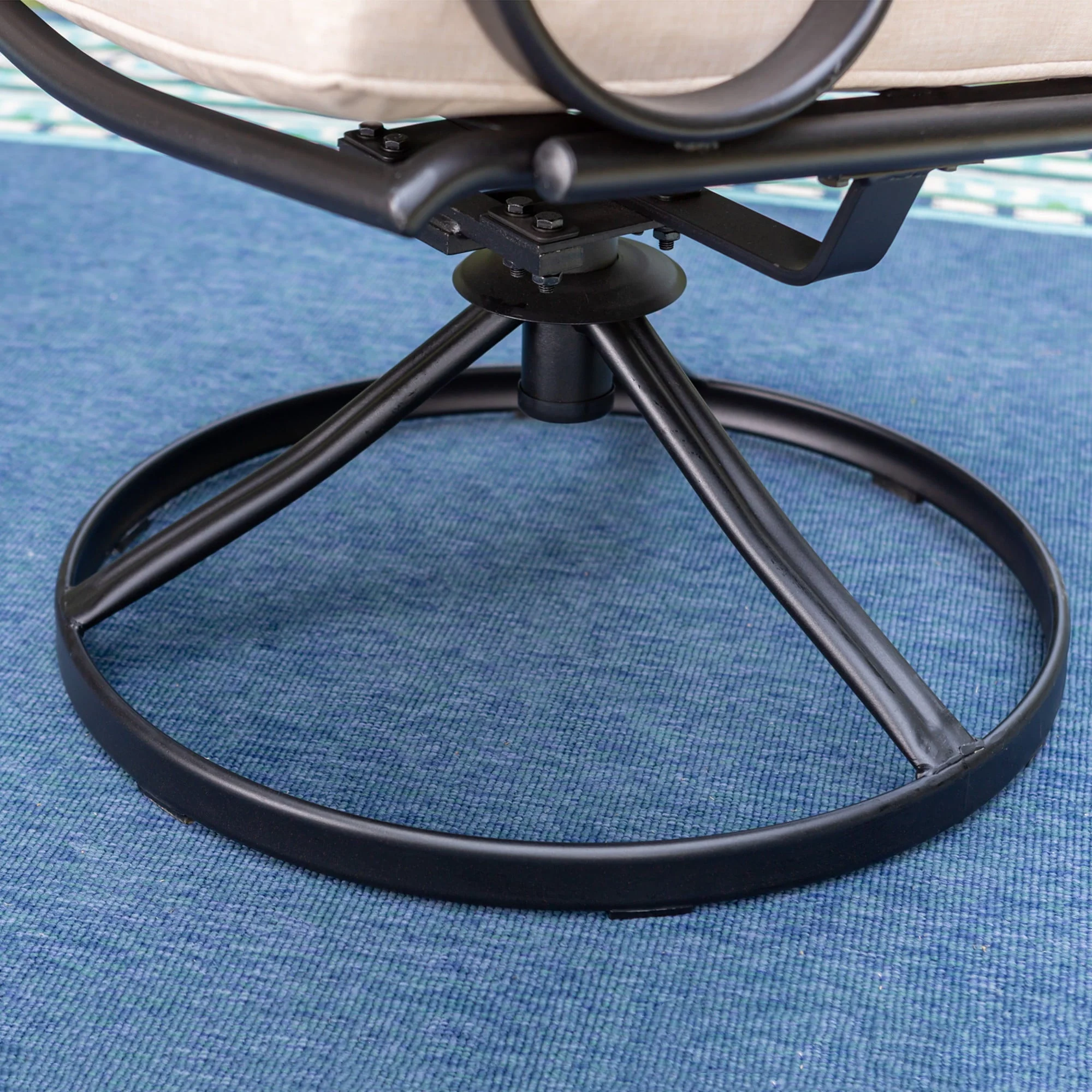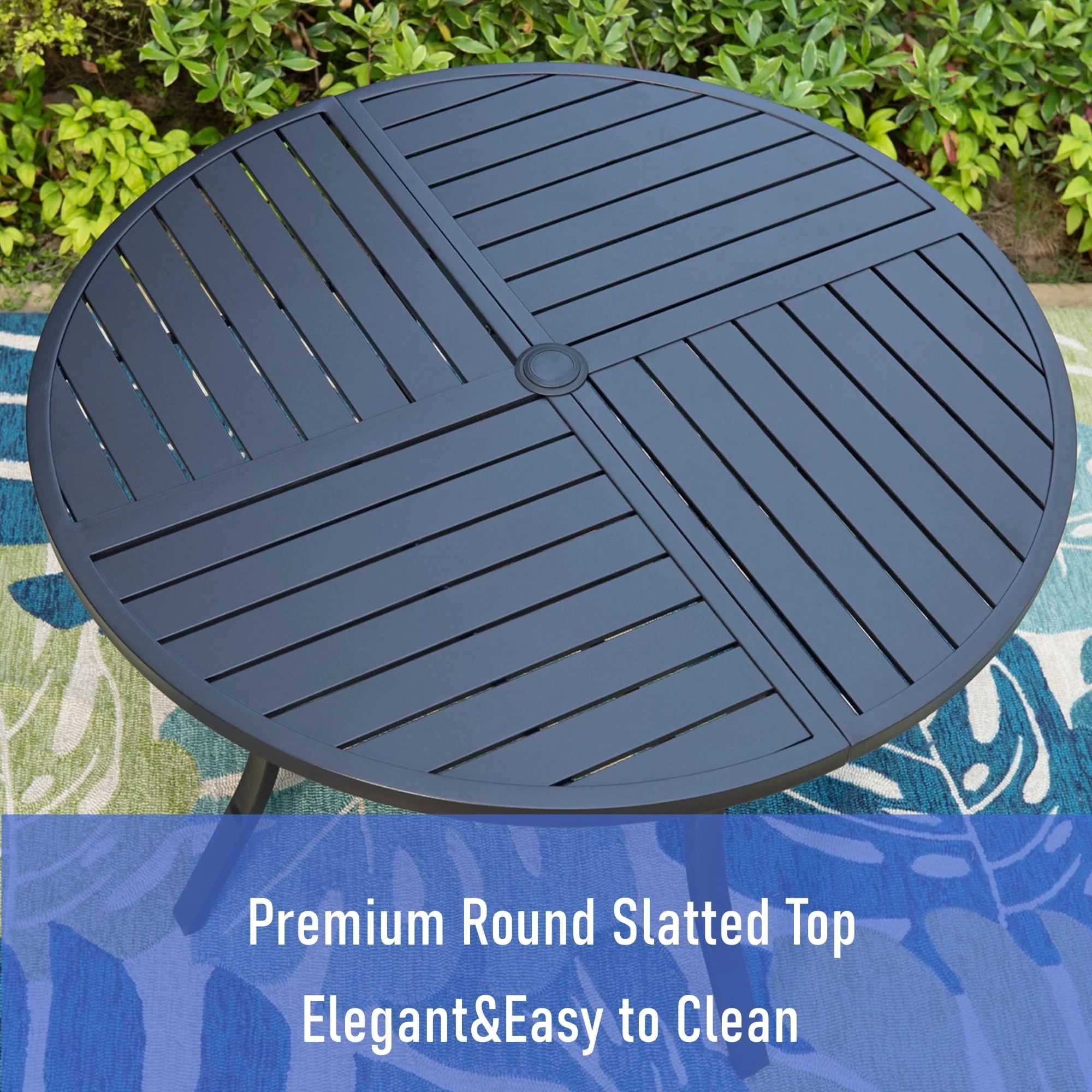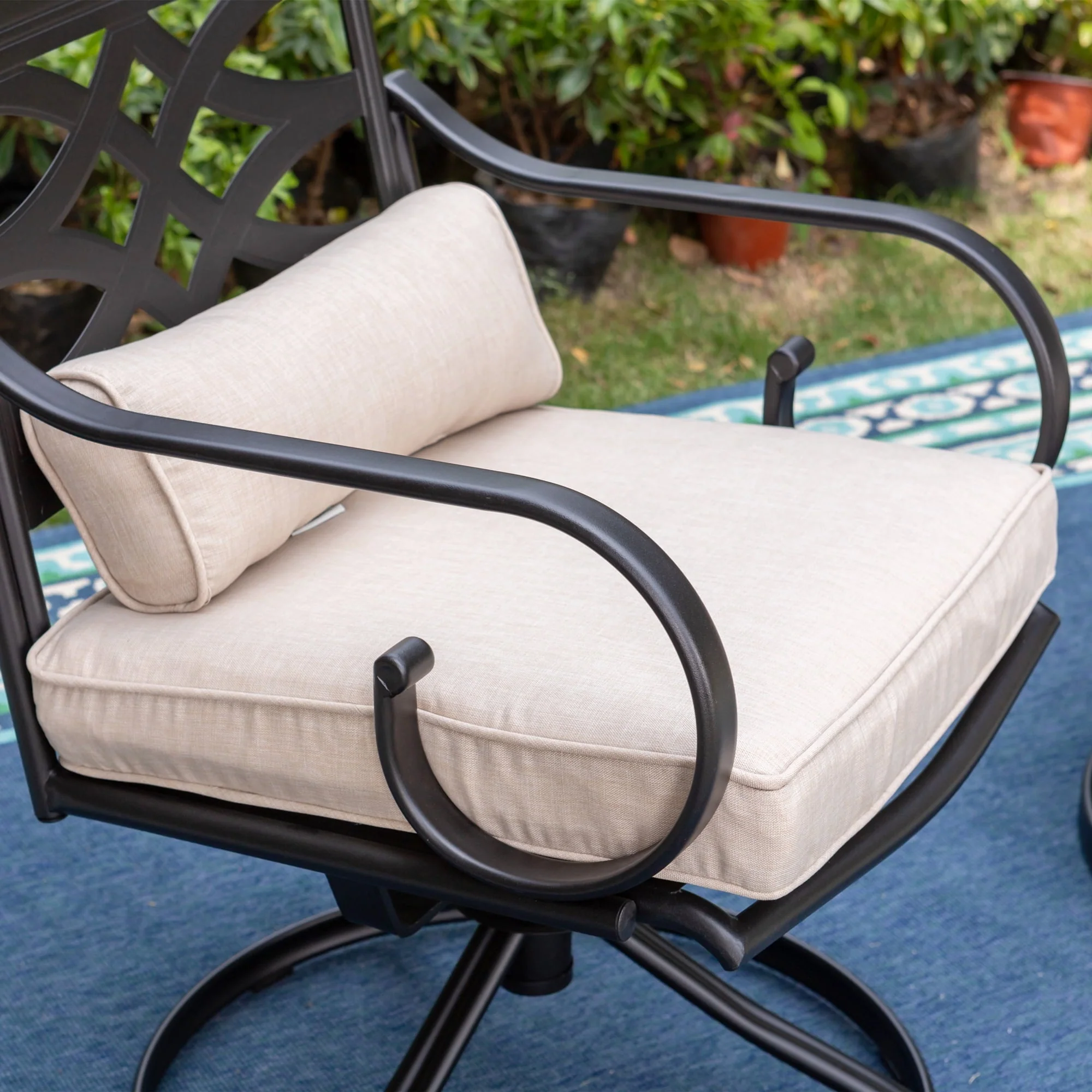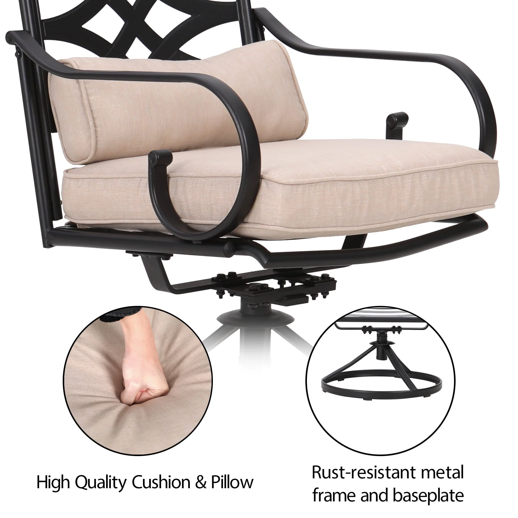 This MF Studio 5 Piece patio outdoor dining set, included 4 Piece 360-degree swivel chairs and 1 Piece metal dining table. MF Studio is a designer's brand and manufacturer which indicates to provide high-quality leisure garden furniture to meet the continuously expanding market. The chairs feature a high-quality steel frame with an e-coating technology that can support 360 degrees swivel, rust-resistant, weather-resistant, anti-deformation, and long-time use. Meanwhile, we also provide a cushion & pillow with a high-density sponge. The round & slat metal table is made of powder-coated steel, which is all-weather and rust-resistant. Don't hesitate to take them home.