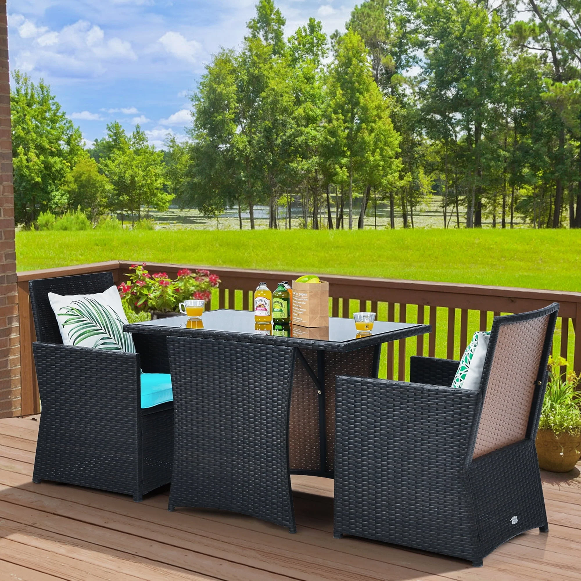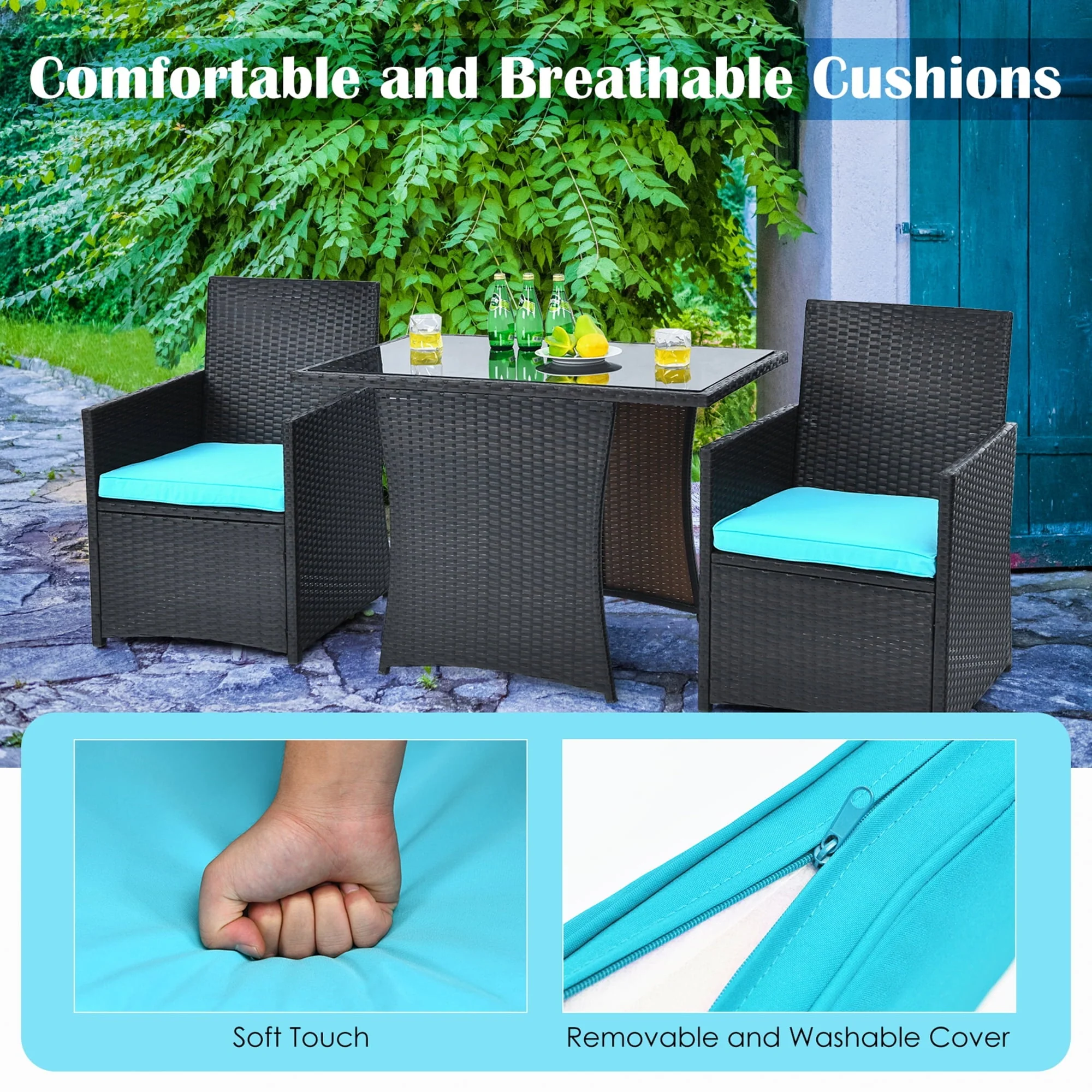 This 3-piece outdoor wicker bistro set will bring more beauty and happiness to your life! Composed of anti-rust steel frame and PE wicker, this outdoor rattan furniture set is very stable and can be used for a long time. The soft and comfortable seat cushion and ergonomic backrest give you the ultimate comfort experience and relieve your fatigue to a certain extent. Besides, the practical coffee table with tempered glass allows you to place beverages, cups, snacks and other items, providing convenience for you and your friends to enjoy a comfortable outdoor life. What's more, the modern and beautiful design makes this table and chair set suitable for different places, so you can put it in the living room, patio, courtyard, poolside and other places.