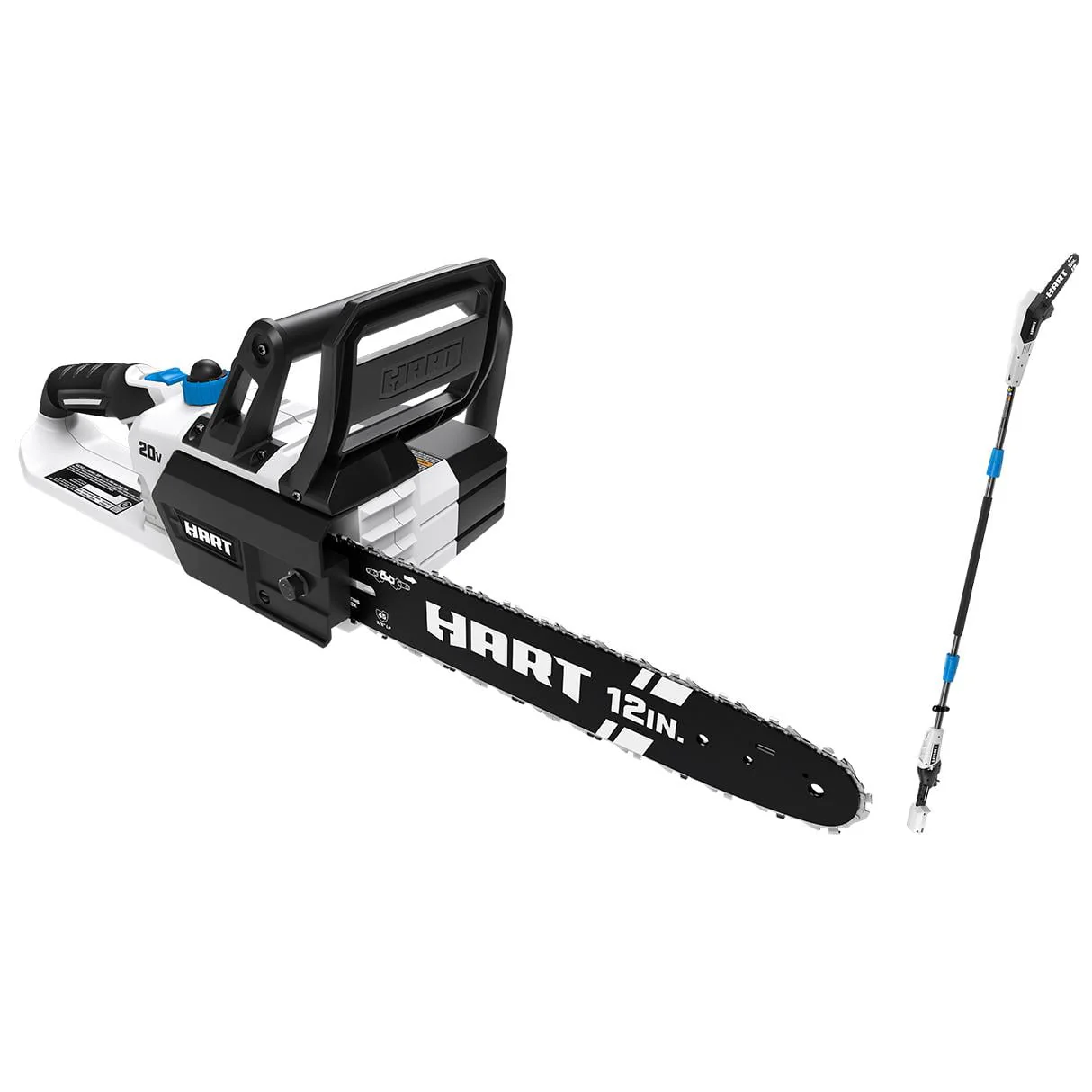 With no oil required, HART’s 20V Cordless 8�?Pole Saw is the hassle-free way to keep your trees looking well maintained. The saw’s 8.8 lbs. weight makes it easy to maneuver as well as control, so you can reach those high hanging limbs with ease. It has a very sturdy pole with a reach of 6.5�?or you can adjust the length with an extension pole up to 9.5’—and its 8�?bar and chain cuts branches up to 6�?in diameter. The tool also includes a shoulder harness for reduced user fatigue during extended periods of use and a rear grip handle for enhanced user comfort. The HART 20V 12-inch Brushed Chainsaw provides the perfect solution for your light trimming and pruning needs. The HART 20V 12-inch Brushed Chainsaw is ideal for light limbing and trimming small trees and bushes around the yard. The rear comfort grip provides enhanced user comfort and reduced user fatigue during extended periods of use. The push button oiler instantly lubricates your chainsaw blade, ensuring fast and smooth cuts during every use. The HART 20V 12-inch Chainsaw provides a 10-inch maximum cutting diameter, which is perfect for cutting through small limbs and trees around the house. The HART 20V Brushed Chainsaw, Pole Saw and HART 20V Battery are covered by 3-year limited warranties.