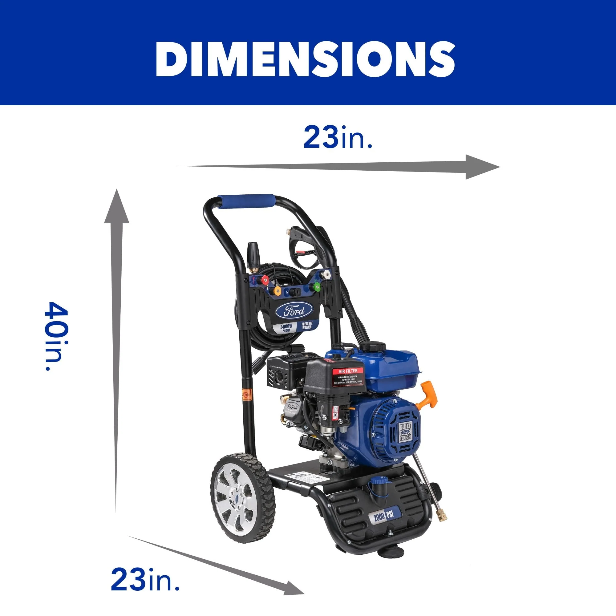 Built with an axial cam high-pressure pump and heavy-duty powder-coated frame, the Ford FPWG3400H is not just tough, it's Built Ford Tough. Upgrade to the Ford FPWG3400H pressure washer today and experience the power, durability, and reliability that Ford is known for.