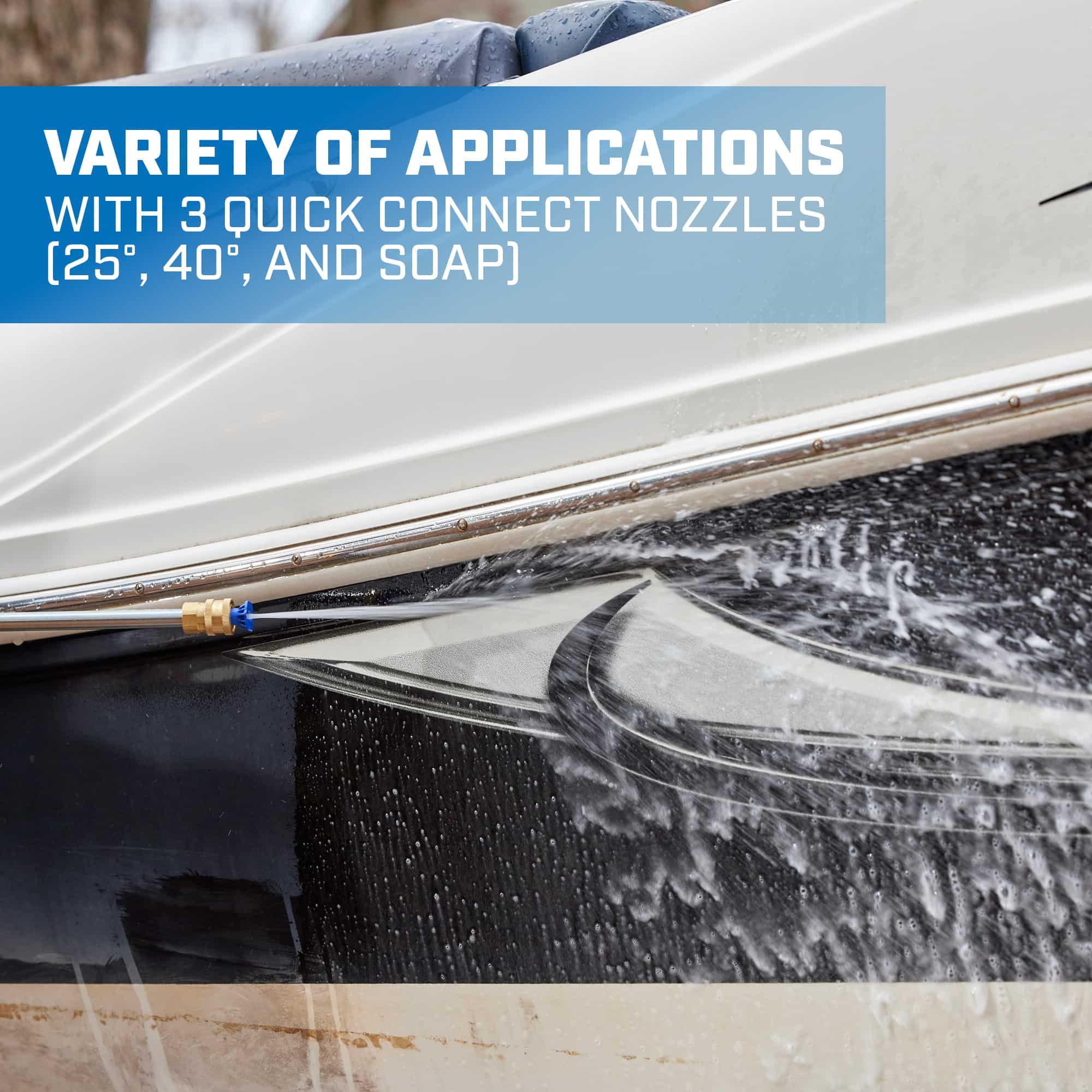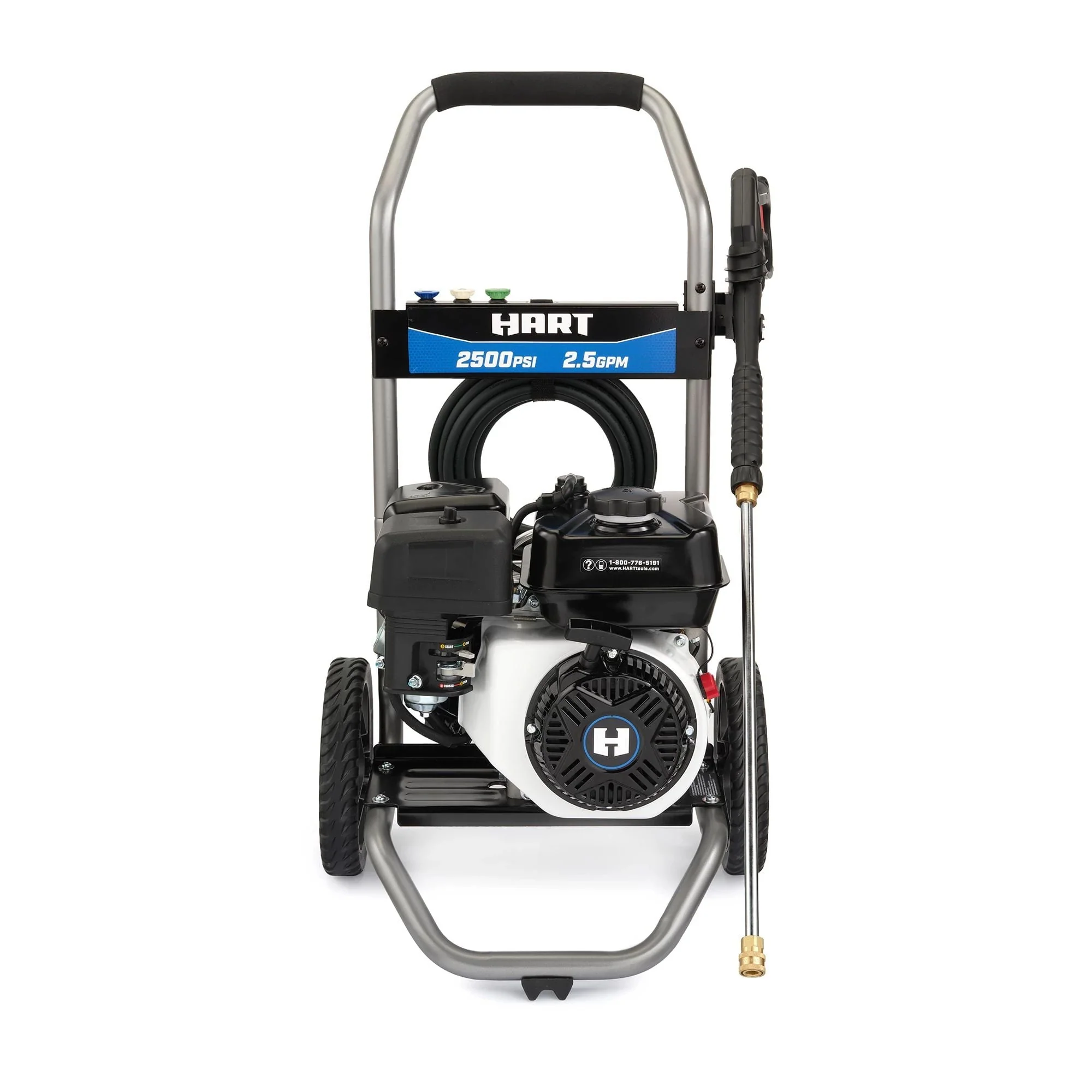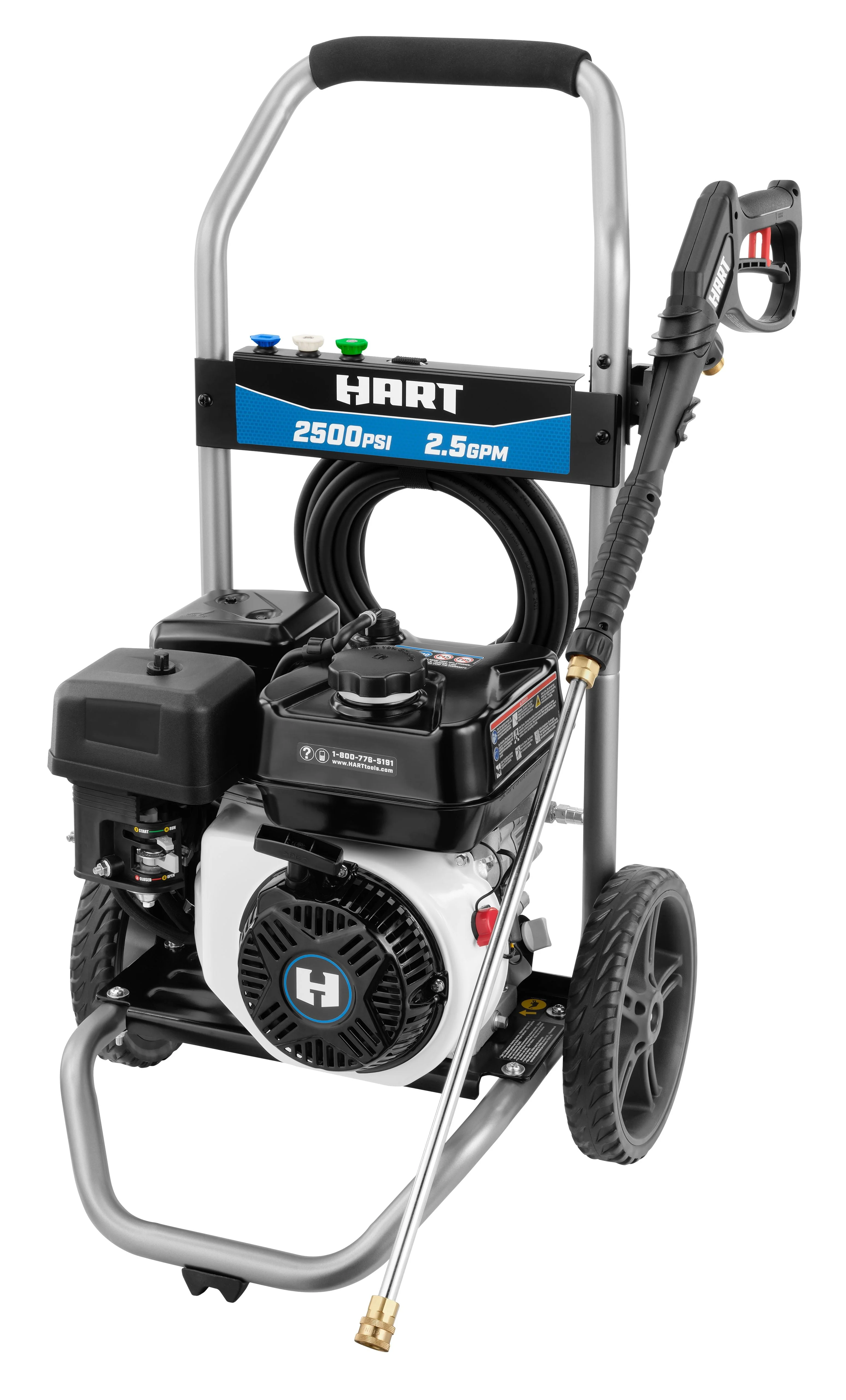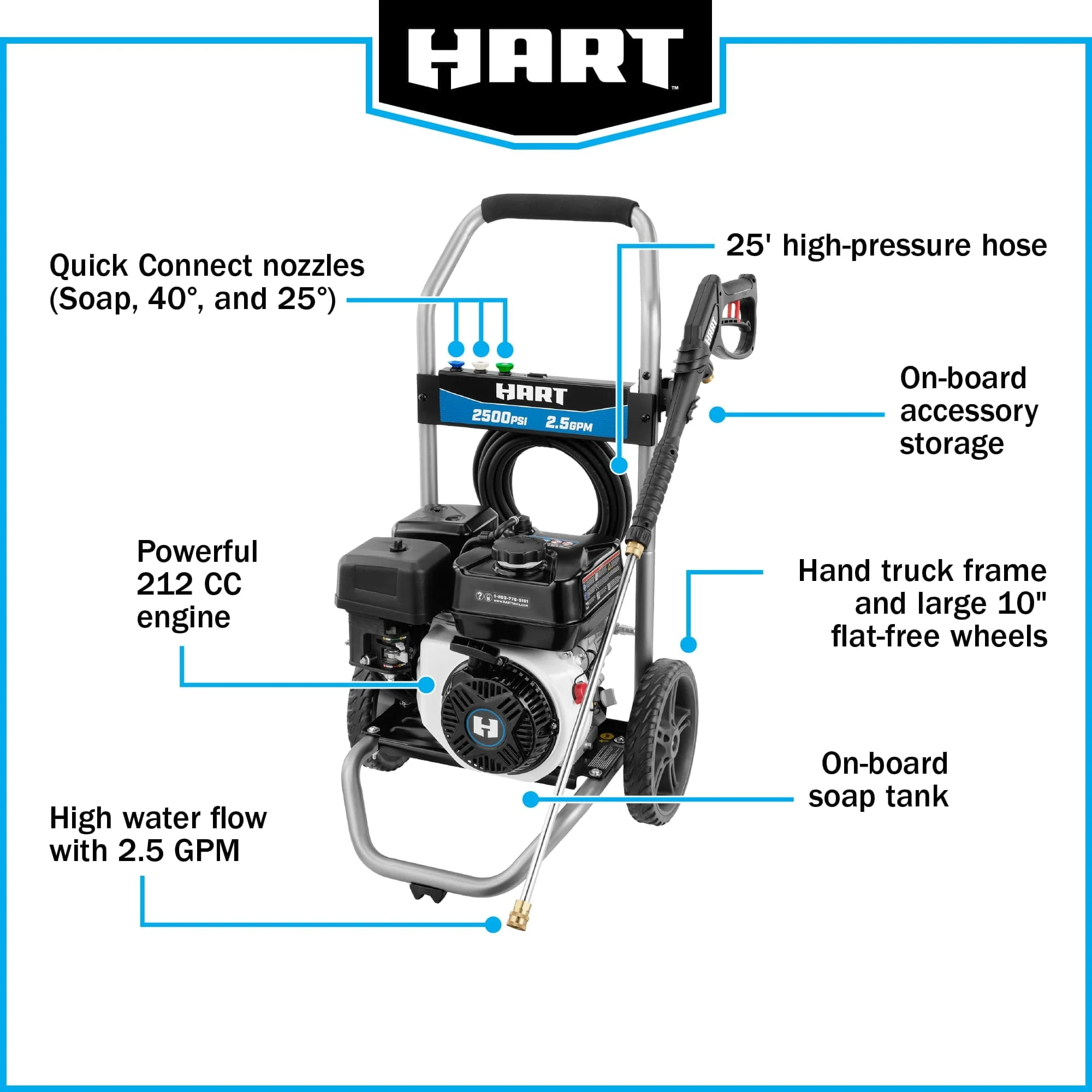 HART 2500 PSI Gas Pressure Washer is designed for heavy-duty cleaning, it features a powerful 212CC engine and 2.5 GPM water flow for maximum performance. With its 25' high pressure hose you can reach tight spots, and with three quick connect nozzles (25°, 40°, soap) you have everything you need to get any hard-to-reach dirt easily removed. Not to mention on-board accessory storage and 10" flat free wheels that make it easy to move anywhere you need it around your home. It's the perfect combination of strength and convenience in one product; plus covered by our limited 3 year warranty so you know you’re getting reliable quality.