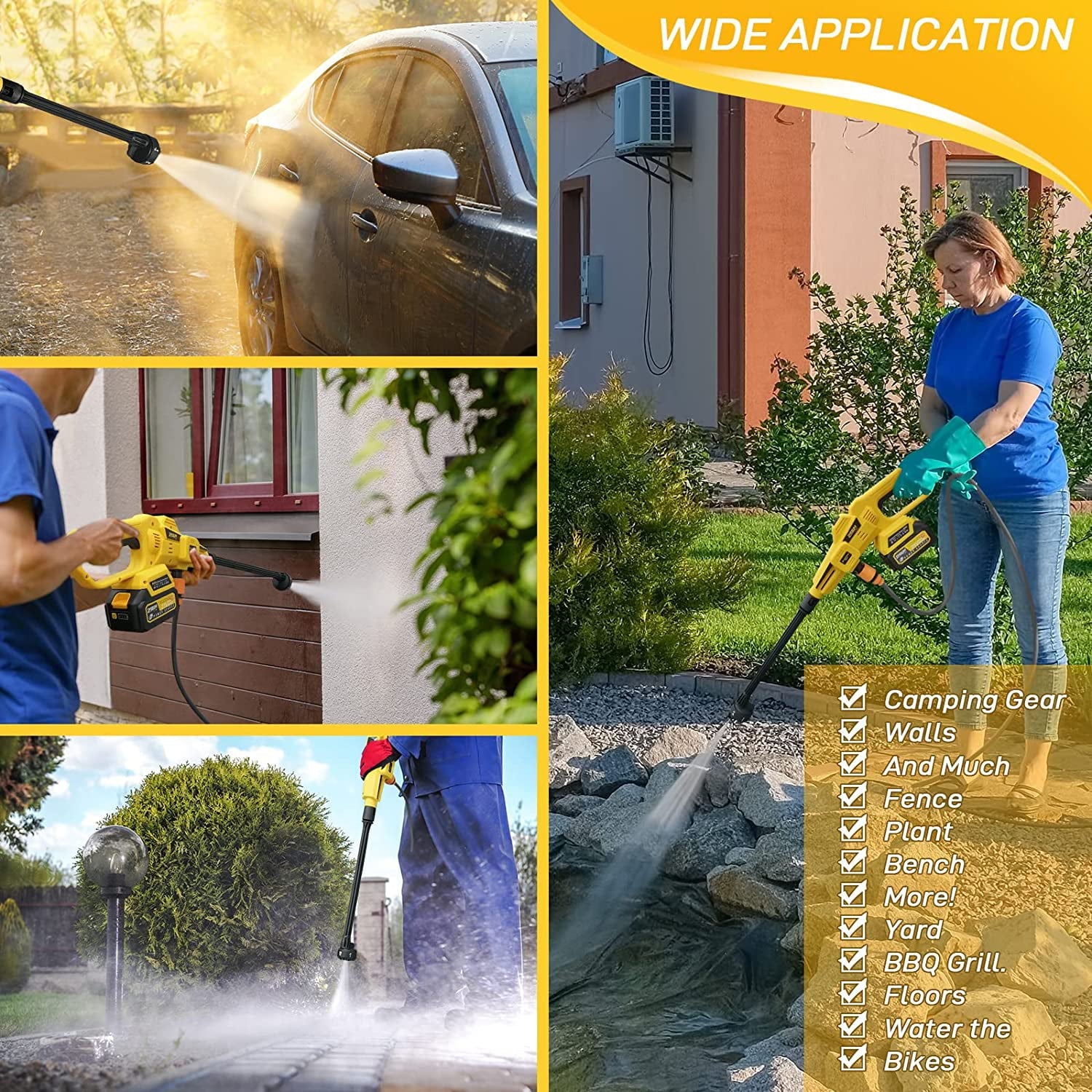 ãMultiple UsesãThe portable pressure washer can be used to clean not only all kinds of cars, bicycles, motorcycles, etc., but also balconies, windows, decks, exterior walls, floors, fences, house walls, and garden furniture.