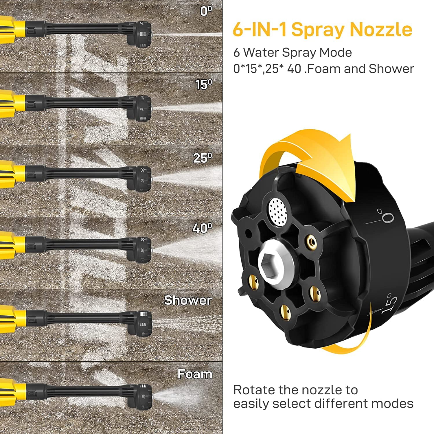 ã6-in-1 Nozzleã Rechargeable pressure washer is equipped with a 6-in-1 nozzle (0°, 15°, 25°, 40°, foam spray, rain mode). Unlike traditional quick-connect nozzles, you can change and adjust different water discharge patterns by simply rotating the nozzle, be careful not to rotate the nozzle during the water discharge.