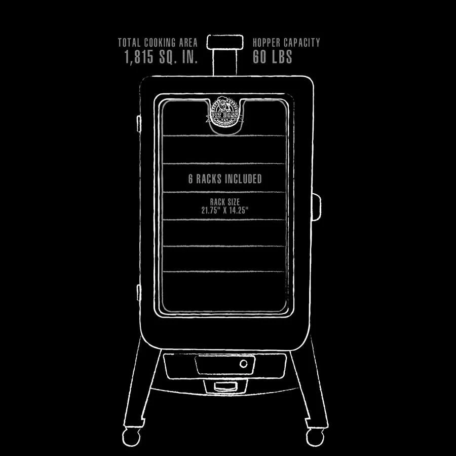 Innovation meets the outdoors with Pit Boss�?all new 7 Series Vertical Pellet Smoker. Never before has smoking been this versatile. With the PB 7 Series Pellet Smoker there is no need to fret about cooking lengths �?its 55 pound plus hopper allows you to cook for up to 24 hours! Its sleek design is not only unique, it is also functional. The multiple position racking system ensures you’ll have enough room to smoke anything your heart (or stomach) desires. Experience how Pit Boss is redefining the smoker industry in your own backyard!