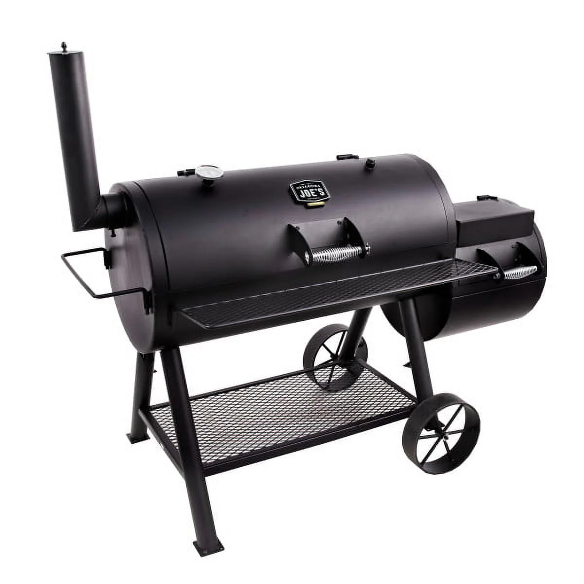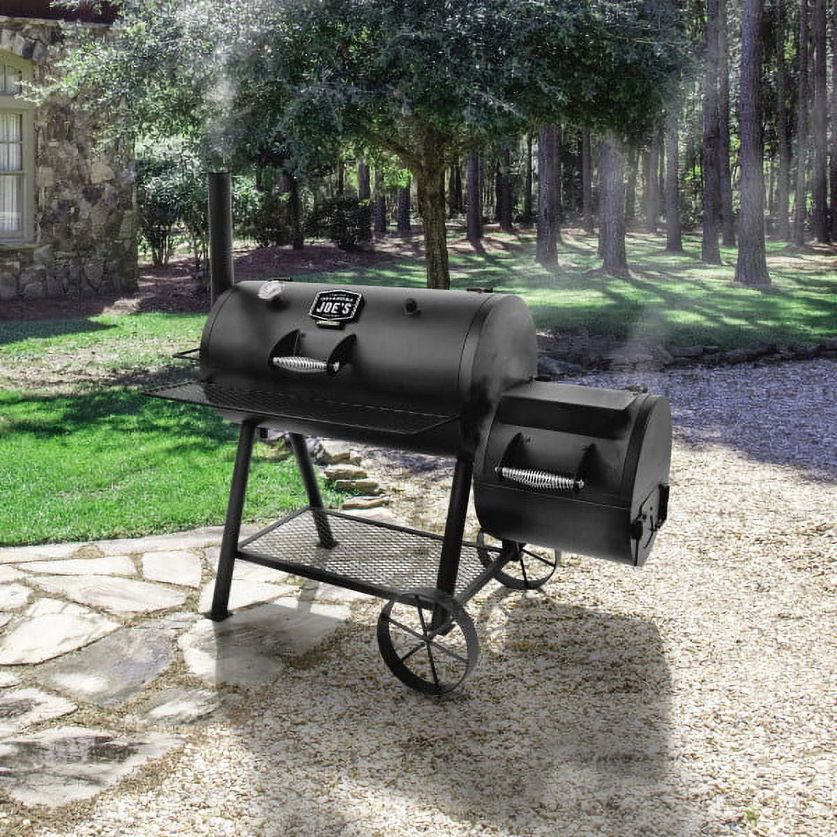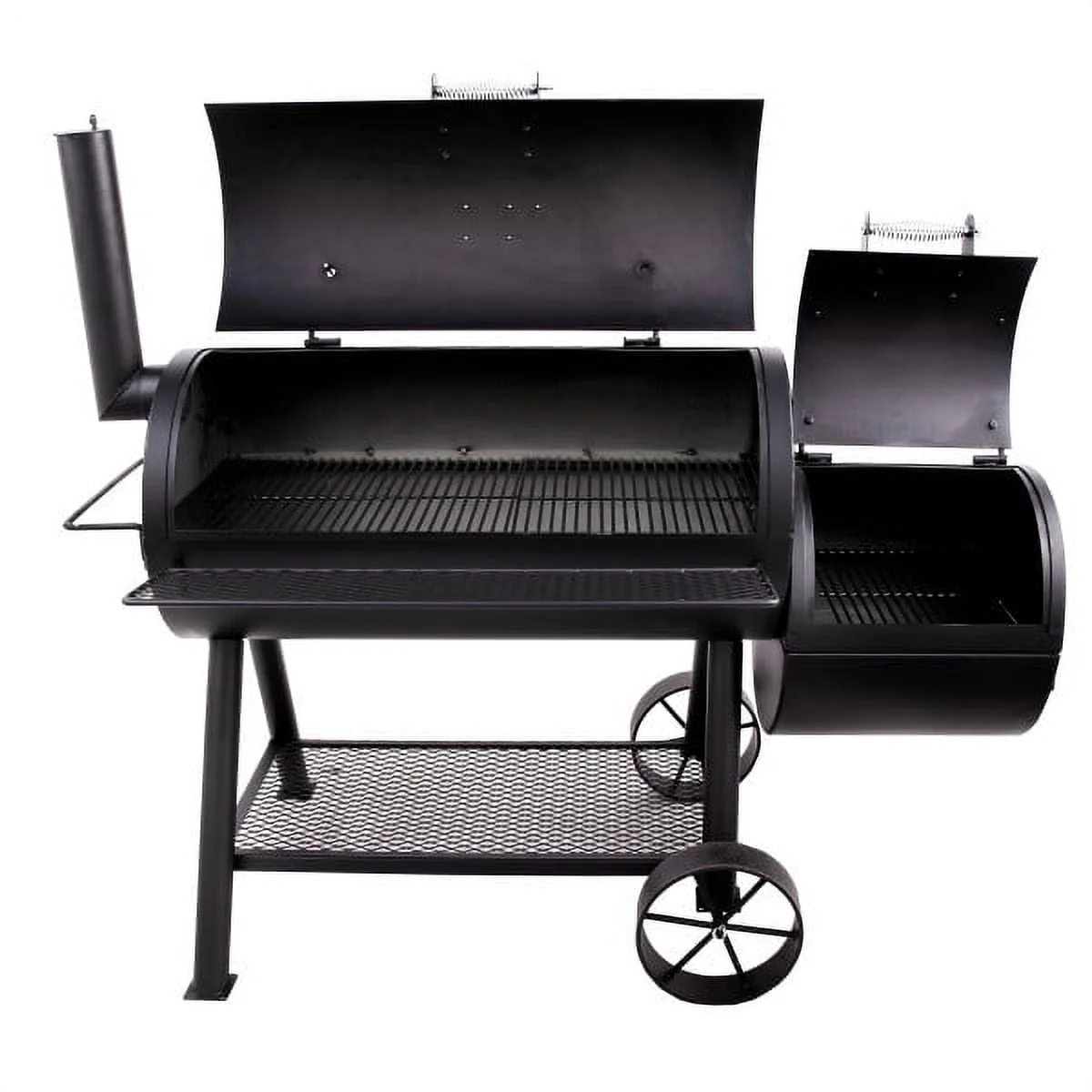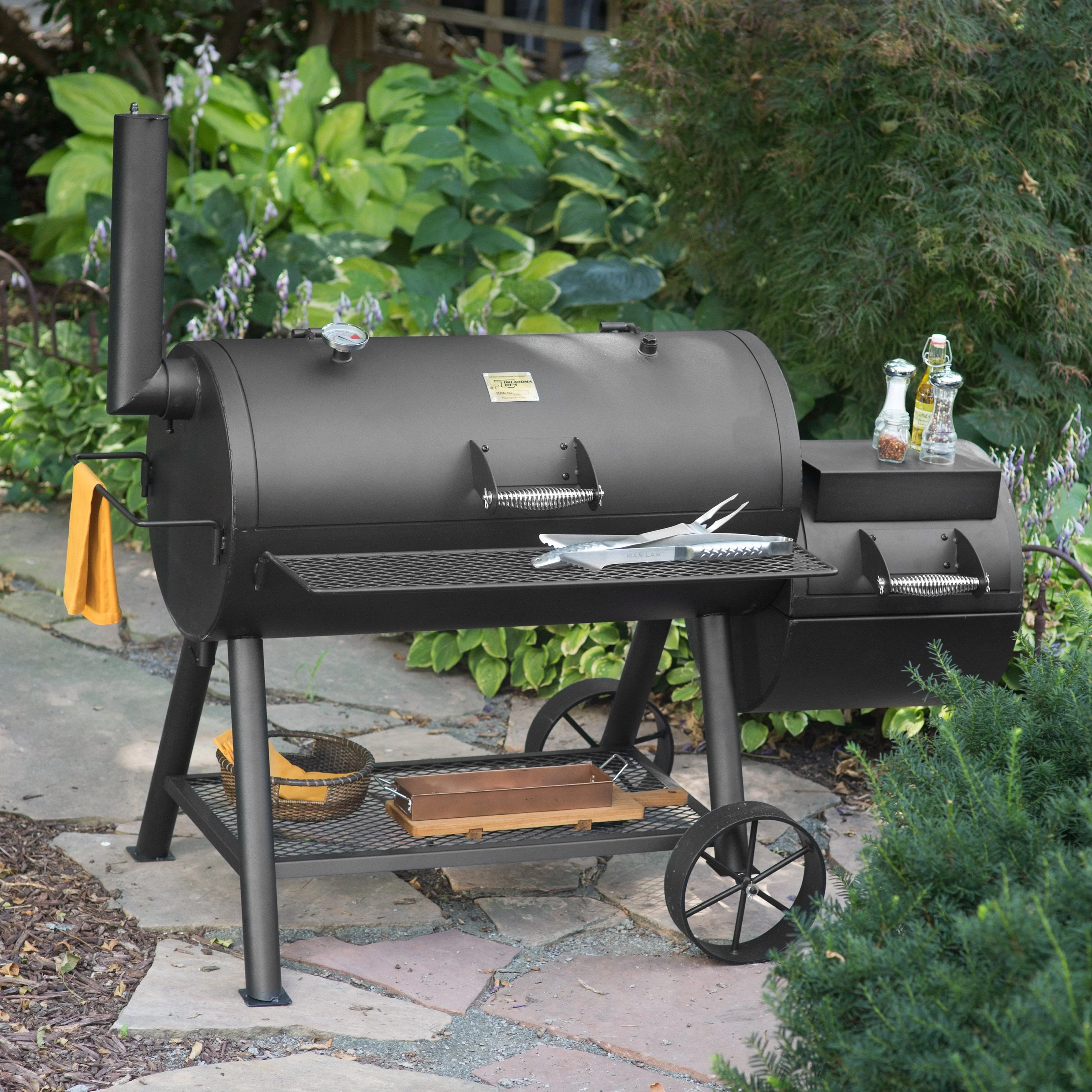 Features: -Heavy-gauge all-steel construction combination smoker and charcoal grill for the smoking and grilling enthusiast. -Cook up to 40 burgers at once with 1060 total sq. in. of cooking space, with 751 sq. in. of main chamber and 309 sq. in. of firebox chamber. -Multiple dampers, 3-in. professional temperature gauge, and convenient firebox access door allow precise heat control. -Clean-out door on firebox makes for easy ash removal and simple cleaning after cooking. -3 large 10-in. wheels provide mobility and convenient front and bottom shelves offer work area and storage space. Product Design: -Barrel. Side Shelf or Table Included: -Yes. Porcelain-Coated Grate: -Yes. Thermometer Included: -Yes. Smoker Included: -Yes. Grate Material: -Steel. Dimensions: Warming Rack Included: -Yes. Overall Height - Top to Bottom: -55.5". Overall Width - Side to Side: -64.3". Overall Depth - Front to Back: -36.5". Overall Product Weight: -237.7 lbs. Specifications: Commercial OR Re