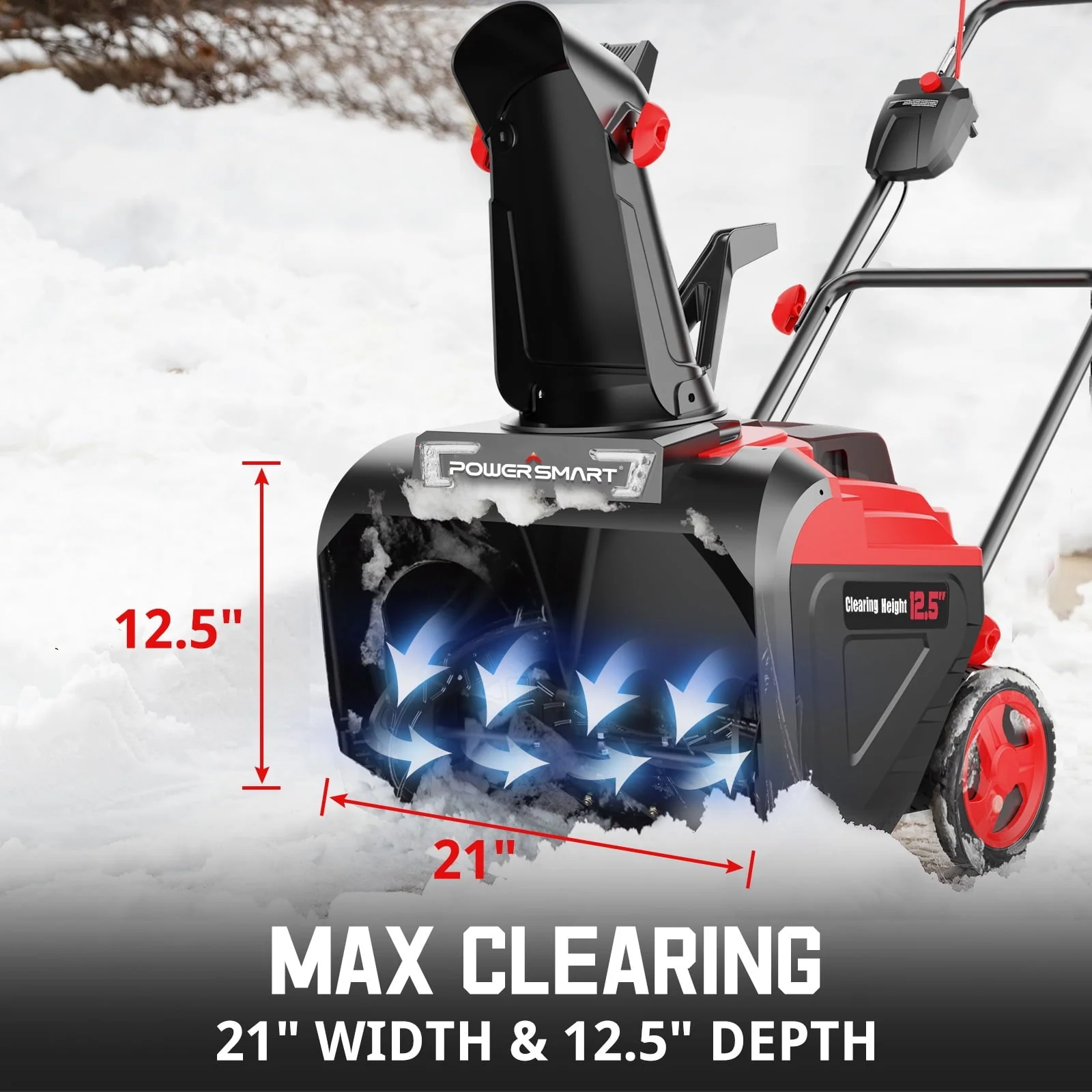 The PowerSmart 40V Snow Blower makes clearing snow a breeze. It's powered by a long-lasting 40V battery that runs for up to 40 minutes, even in heavy snow. With a wide 21-inch clearing path, it has a strong and quiet brushless motor, needing minimal maintenance. It's easy to store, with a folding design, and can throw snow up to 40 feet away. You can control the direction of snow with a 180° rotating chute and stay safe with built-in LED lights. The 8-inch rear wheels handle rough terrain, and our after-sales team is here to help. Experience the convenience and power of the PowerSmart 40V Snow Blower, your reliable winter companion.