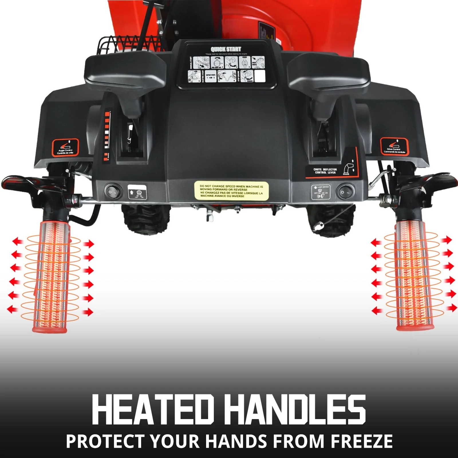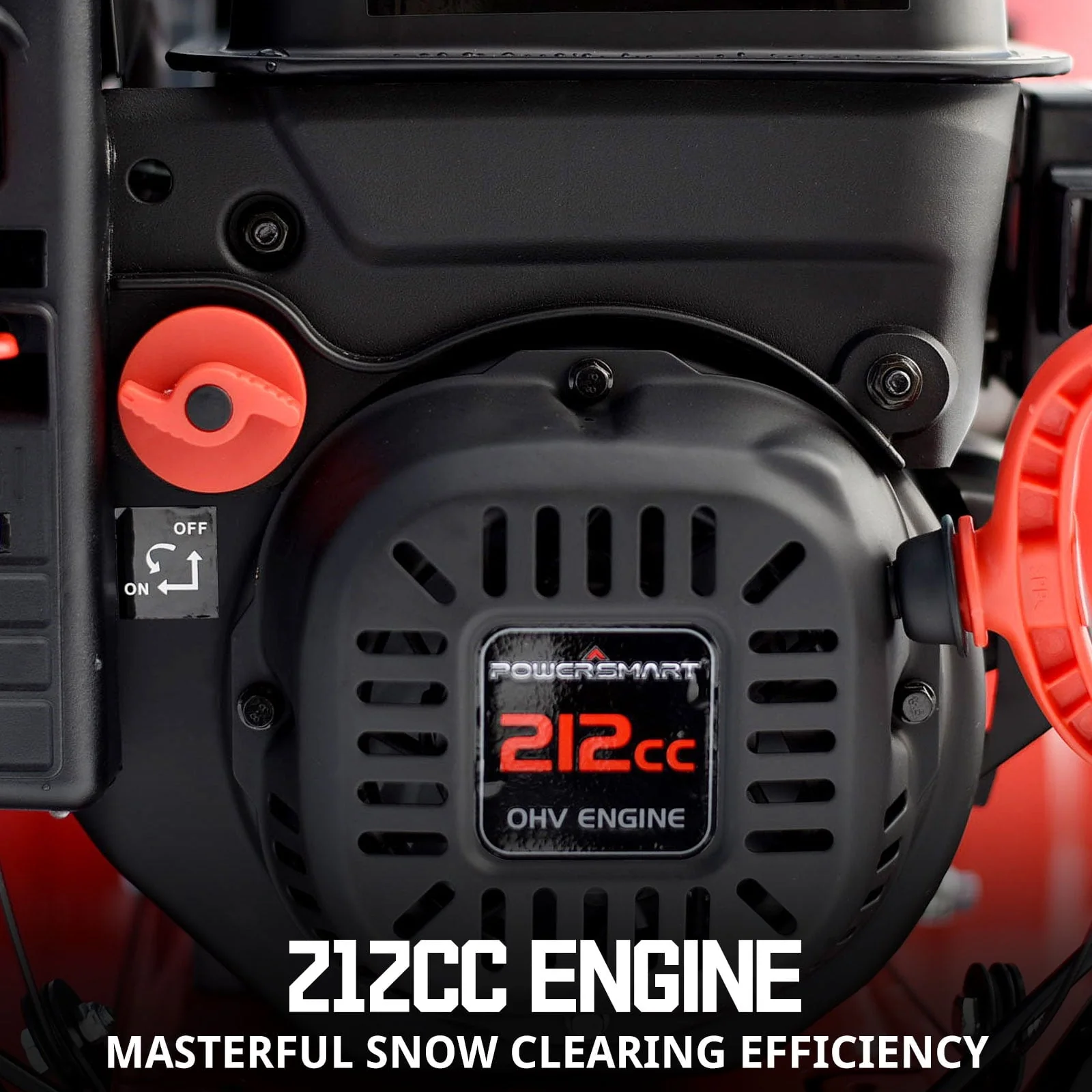 212cc PowerSmart engine delivers powerful snow-clearing action. Equipped with recoil start, just pull to start; electric start, attach your extension cord, just push button to start.