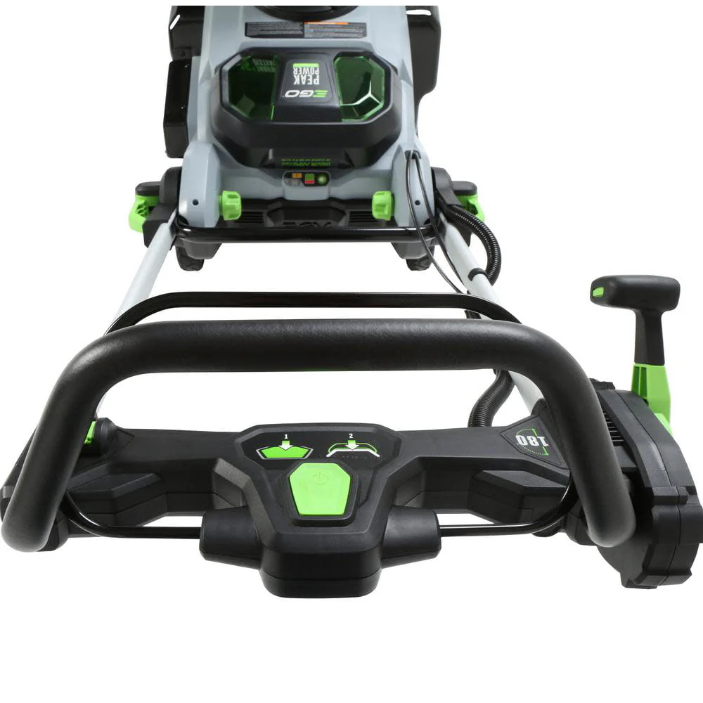 The new Ego power+ snow blower is the only cordless snow blower that delivers the power and performance of gas without the noise, fuss and fumes. Featuring peak power technology, it combines the power of any two Ego 56 Volt arc lithium batteries for superior clearing power, even in heavy, wet snow. Built with a high-efficiency brushless motor and a 21 in. wide intake, the Ego power+ snow blower can handle it all, even what the city snow plow leaves behind. Easily adjust the variable-speed auger to control how far the snow is thrown, up to 35 ft., for maximum control. A robust handle-mounted chute-adjustment lever puts the user in control when re-directing the snow up to 180? from side to side. 2 bright LED lights make it convenient for use early in the morning or at night and the robust steel chassis is built for aggressive use in demanding conditions. The Ego power+ snow blower kit includes two (2) 5.0 Ah batteries and the rapid charger, the industry's fastest, to recharge a 5.0 Ah battery in just 40 minutes. All Ego tools, batteries and chargers are 100% compatible so owners can build the combinations they need and maximize their value. Experience power beyond belief with the Ego power+ snow blower and the entire Ego power+ lineup.