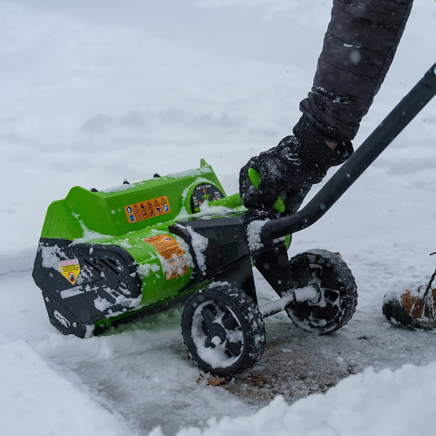 This Earthwise Cordless 40 Volt snow thrower features a push button start, 16-inch clearing width and up to eight-inch clearing depth. A powerful blower that handles up to 300 pounds per minute snow capacity. It also blasts snow up to 30 feet in distance. A durable dual blade curved rotor and an adjustable support handle are why it's reliable and easy to use. This snow shovel is light weight and small compared to other snow throwers and is powerful enough for all your around the house snow needs. No Fuel, No Fumes. The Clean Air Choice.