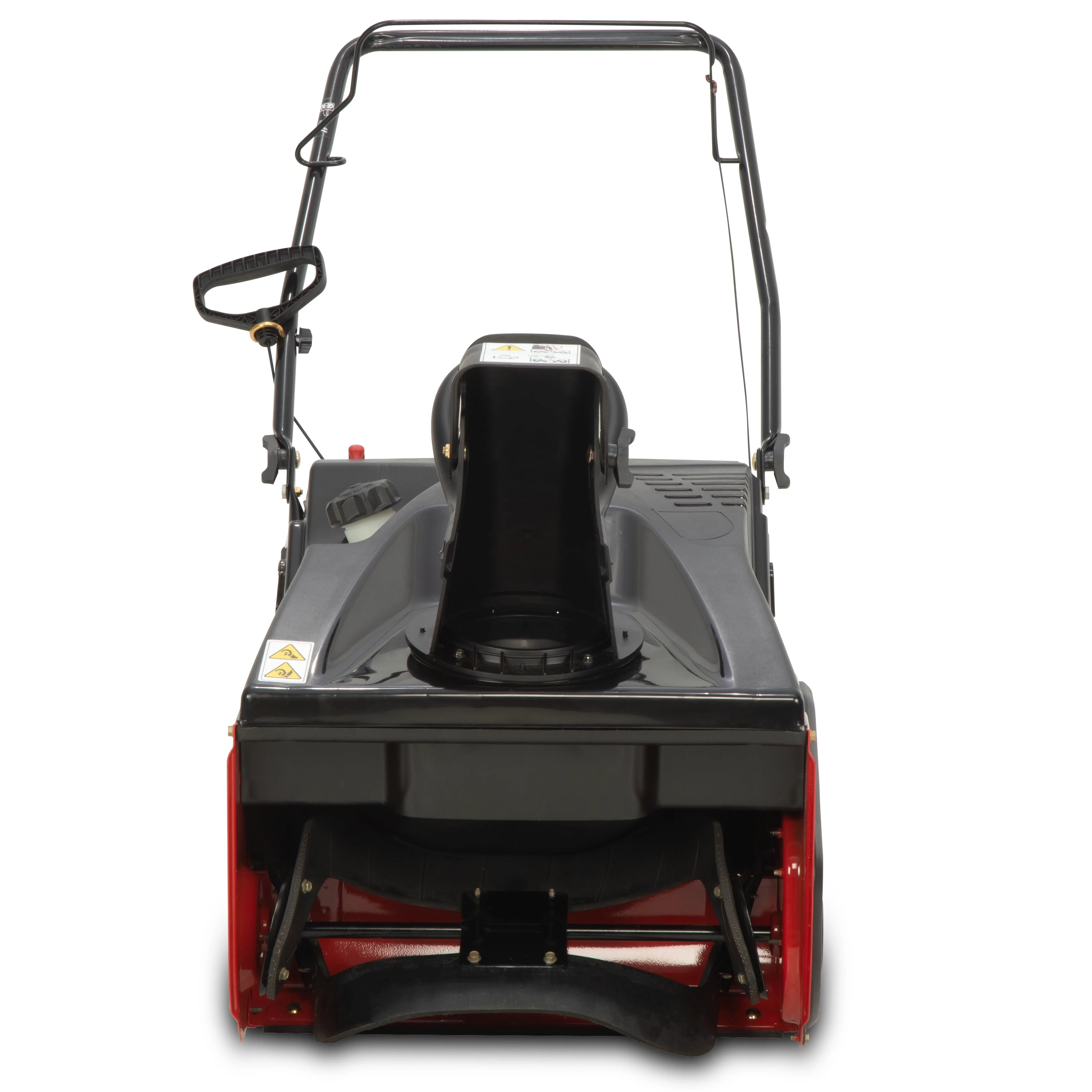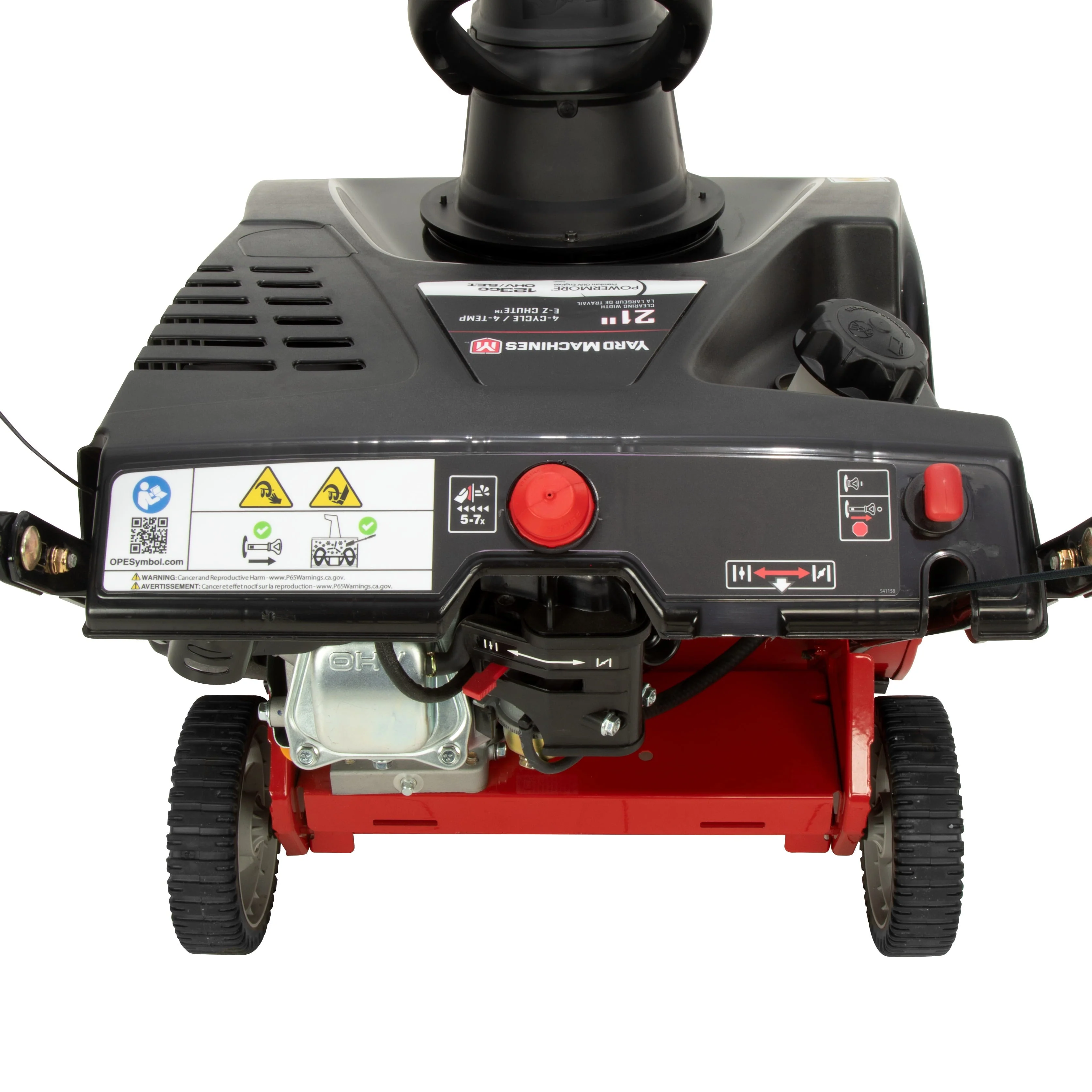 Compact and convenient, this Yard Machines gas powered single-stage snow blower will help you easily clear snow from your driveway. A 123cc Powermore engine with a 21-inch clearing width and 13-inch intake height will effectively handle up to 6-inches of snowfall. Efficiently clear paths with 9-inch steel augers built for durability. An auger-propelled drive system lets you work at your pace, and the E-Z Chute�?control system allows you to easily adjust the chute up to 190 degrees. Backed by a 2-year warranty for peace of mind, Yard Machines is here to help you get the job done right.