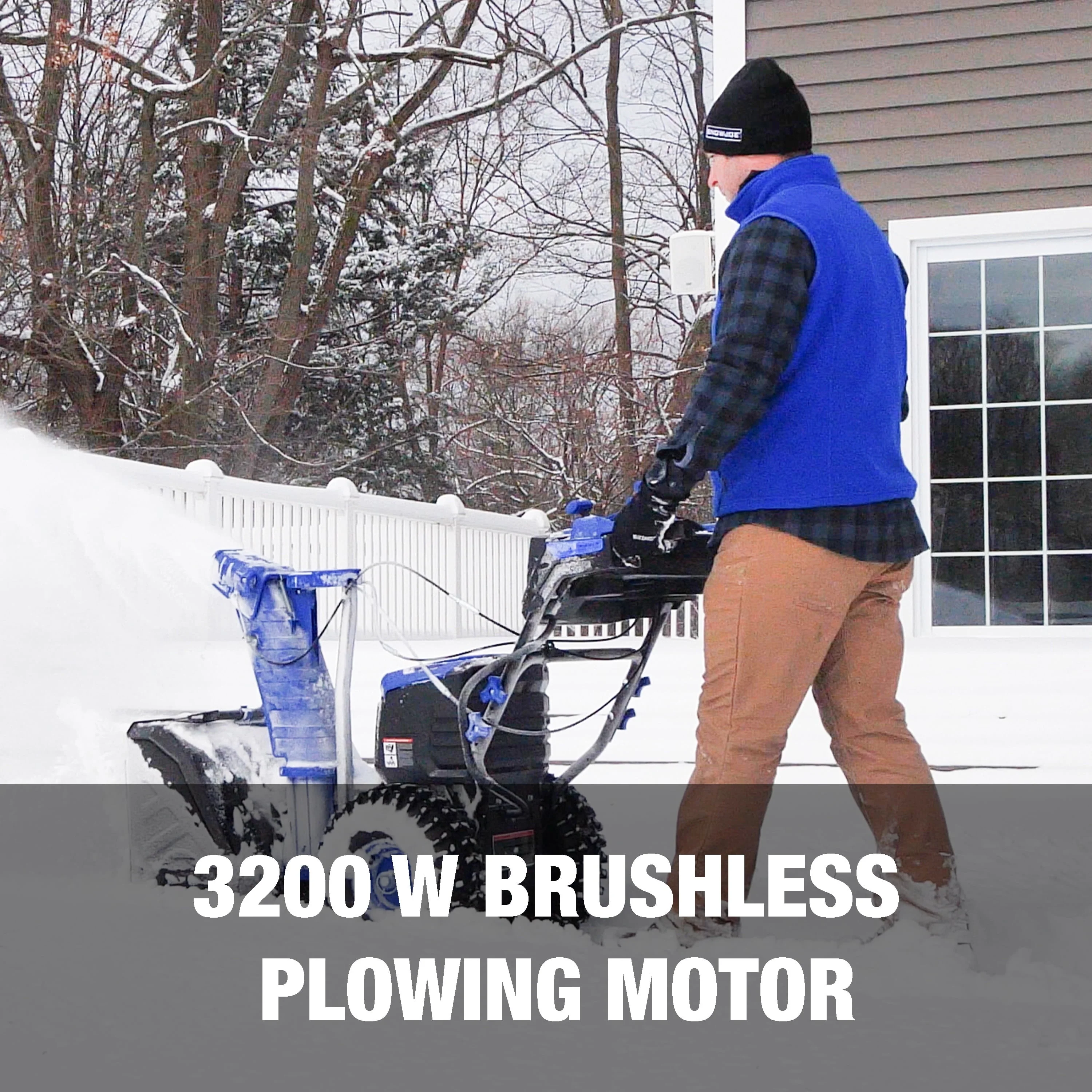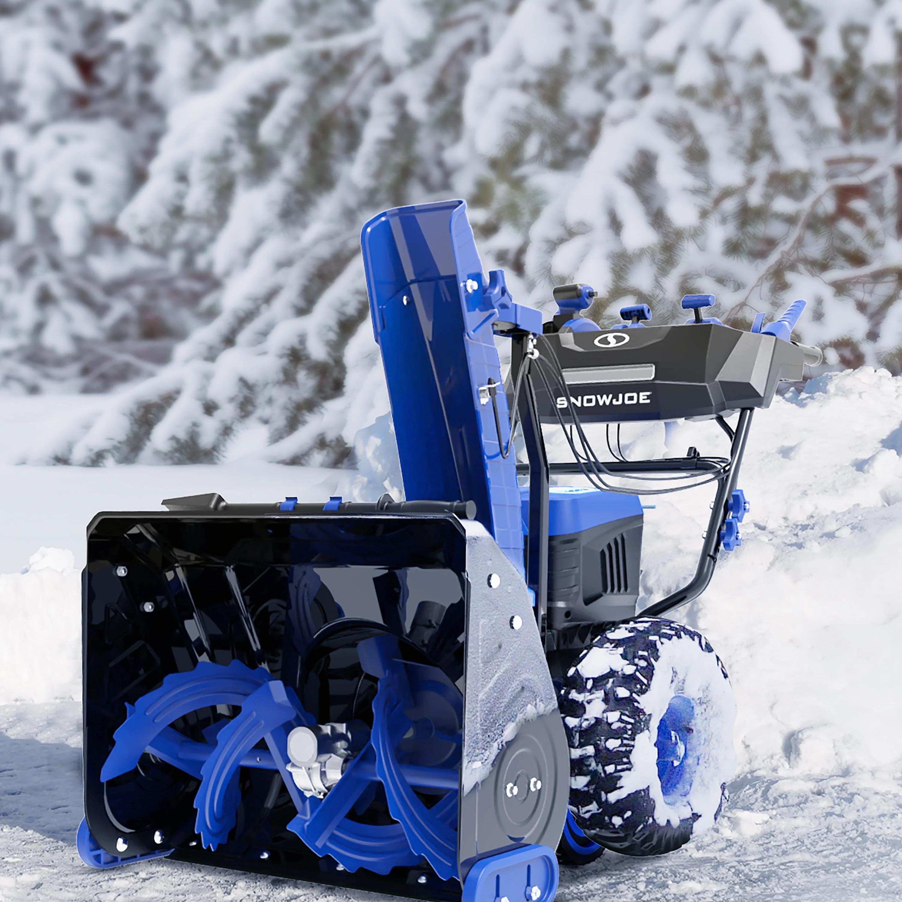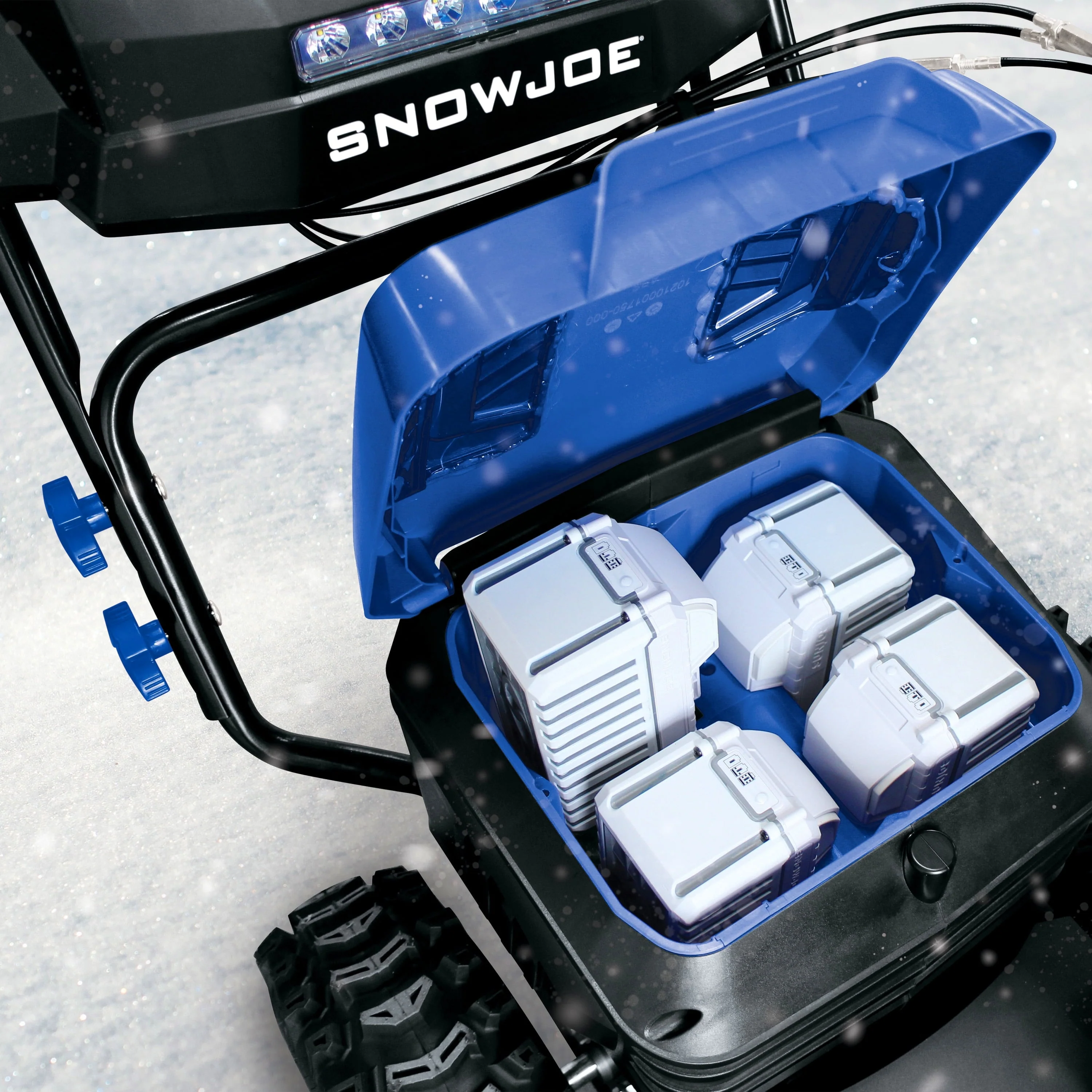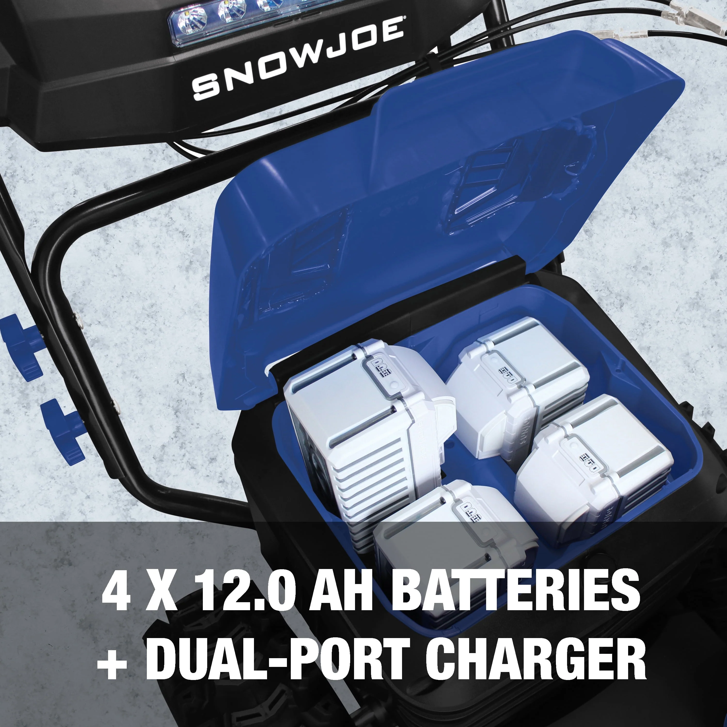 WAGE WAR ON WINTER. The latest revolution in snow-clearing technology meets the 24V IONMAX Battery System with the 24-inch 96V Max Cordless Battery-Powered Self-Propelled Dual-Stage Snow Blower from SNOW JOE®. Driven by Snow Joe's exclusive 24-Volt battery series, the self-propelled SNOW JOE features four high-capacity 24-volt, 12.0-Ah lithium-ion batteries that deliver up to 96 volts of max power + performance, with zero carbon emissions for cleaner air. SNOW JOE boasts a variable drive speed lever featuring forward and reverse settings, a powerful 3200-watt brushless plowing motor + 400-watt brushless drive motor, and 2 serrated steel blades that quickly clear a 24-inch wide by 17.5-inch deep path in a single pass. Plus, the 180º auto-rotate chute throws snow up to 40 feet away, and the integrated scraper bar at the base of the unit clears right to the ground without damaging your deck, driveway or pavement. After dark, the six 3-watt LED lights brighten the way for safer nighttime clearing. And when the work is done, the two high-speed, dual-port chargers can recharge in as fast as 6 hours so you're ready to tackle even more snow!