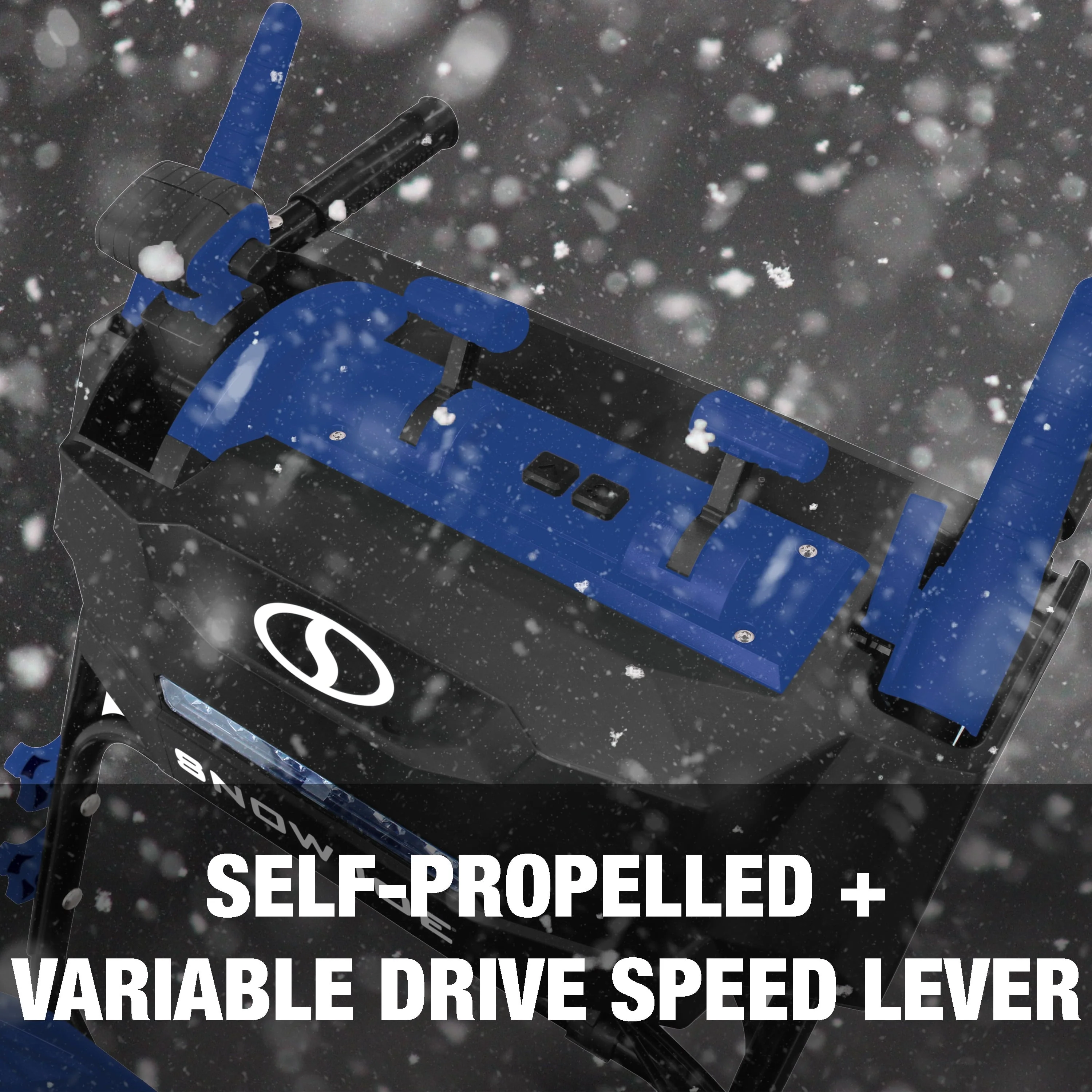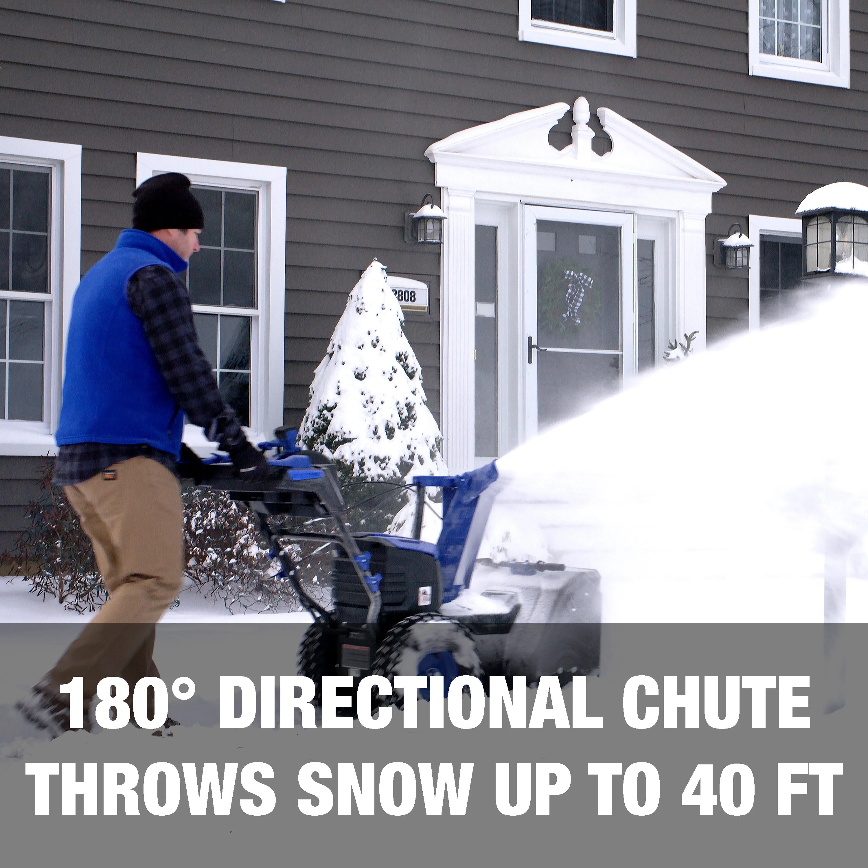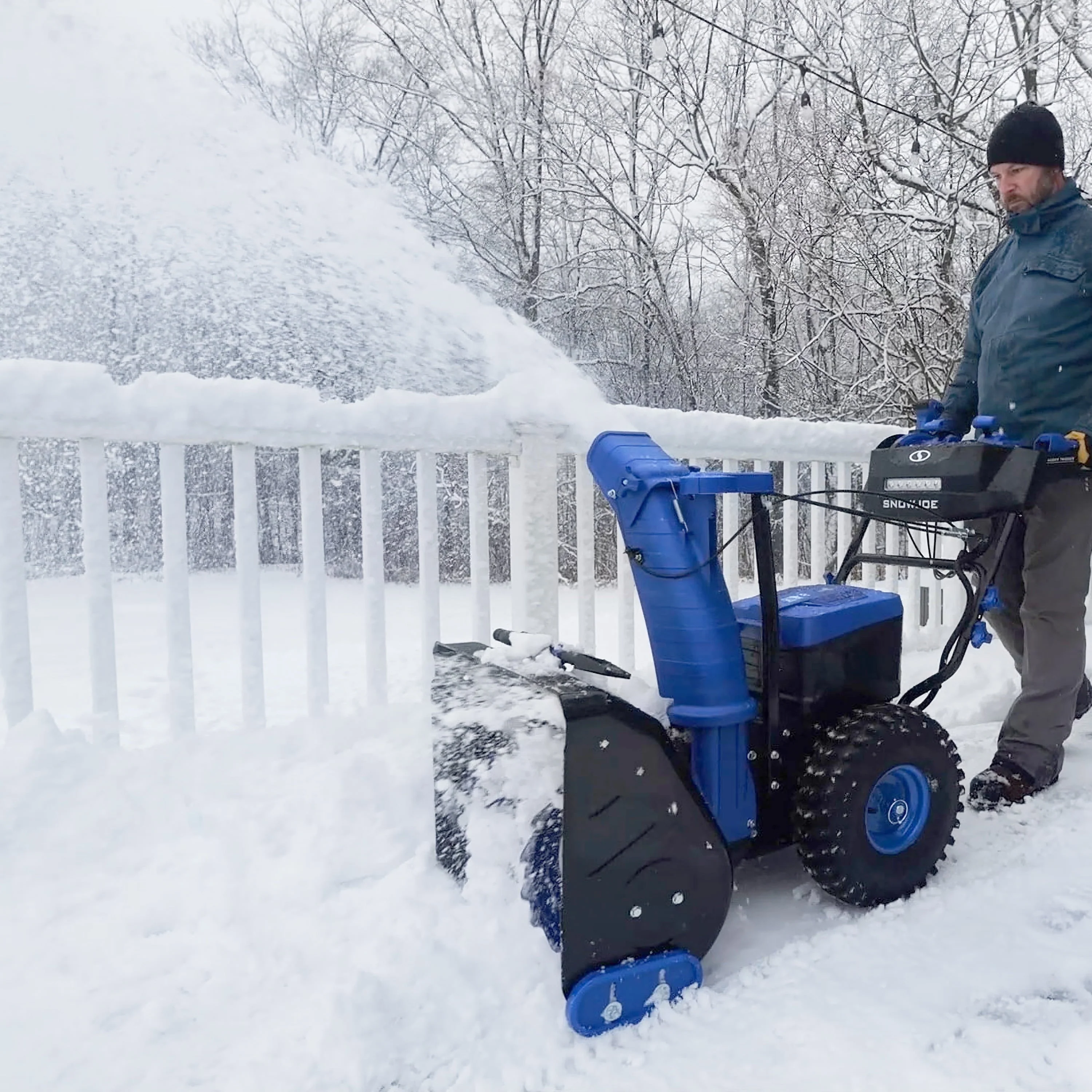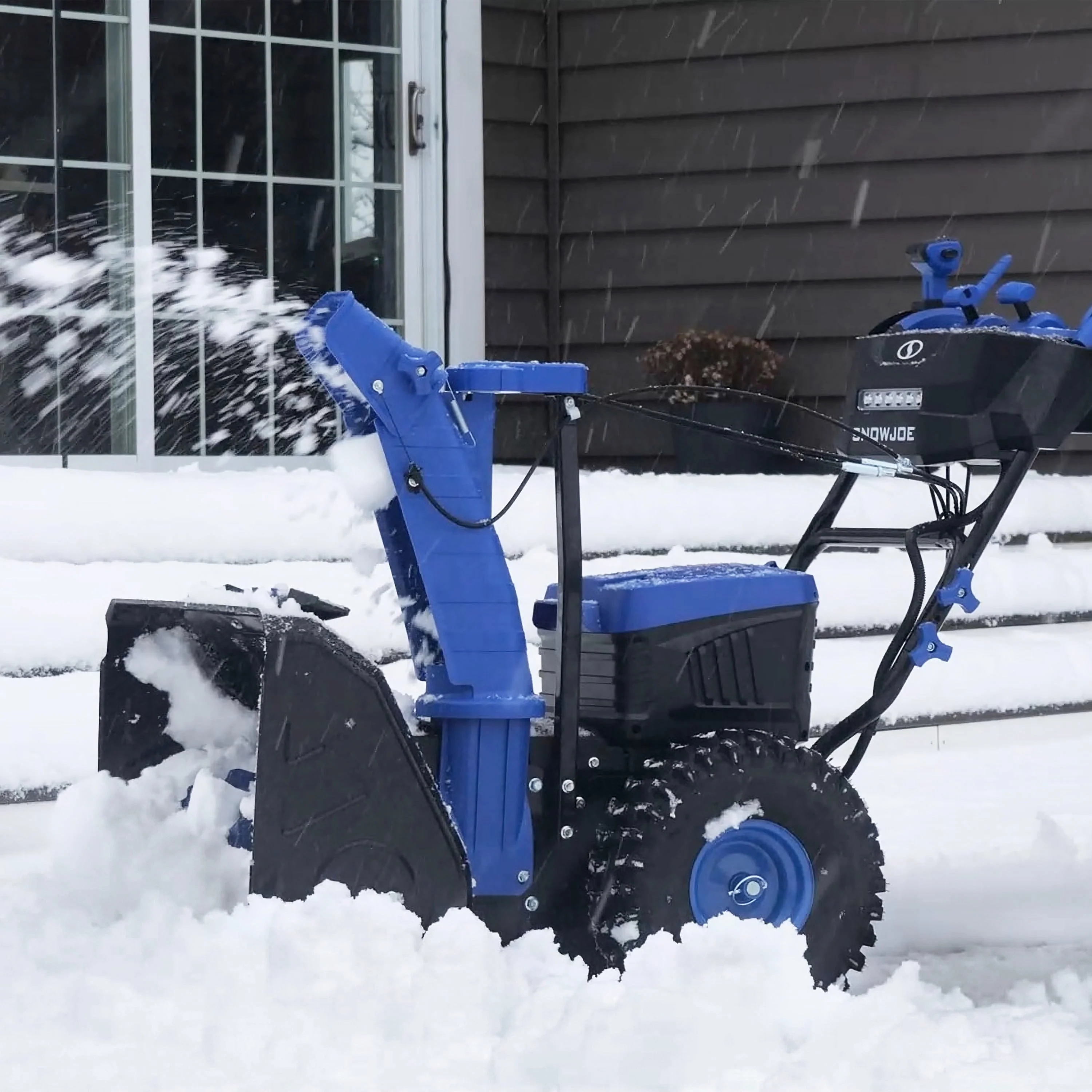 WAGE WAR ON WINTER. The latest revolution in snow-clearing technology meets the 24V IONMAX Battery System with the 24-inch 96V Max Cordless Battery-Powered Self-Propelled Dual-Stage Snow Blower from SNOW JOE®. Driven by Snow Joe's exclusive 24-Volt battery series, the self-propelled SNOW JOE features four high-capacity 24-volt, 12.0-Ah lithium-ion batteries that deliver up to 96 volts of max power + performance, with zero carbon emissions for cleaner air. SNOW JOE boasts a variable drive speed lever featuring forward and reverse settings, a powerful 3200-watt brushless plowing motor + 400-watt brushless drive motor, and 2 serrated steel blades that quickly clear a 24-inch wide by 17.5-inch deep path in a single pass. Plus, the 180º auto-rotate chute throws snow up to 40 feet away, and the integrated scraper bar at the base of the unit clears right to the ground without damaging your deck, driveway or pavement. After dark, the six 3-watt LED lights brighten the way for safer nighttime clearing. And when the work is done, the two high-speed, dual-port chargers can recharge in as fast as 6 hours so you're ready to tackle even more snow!