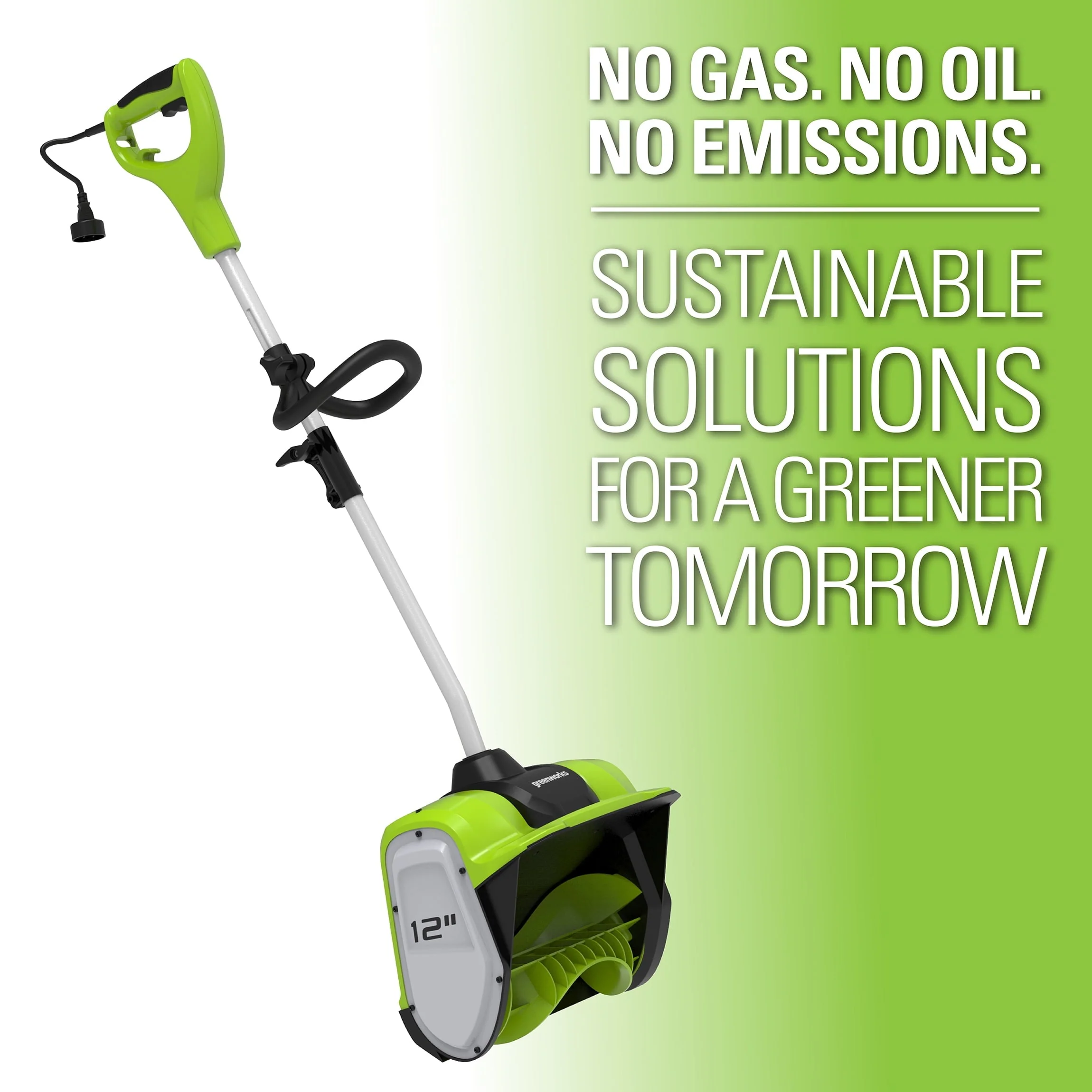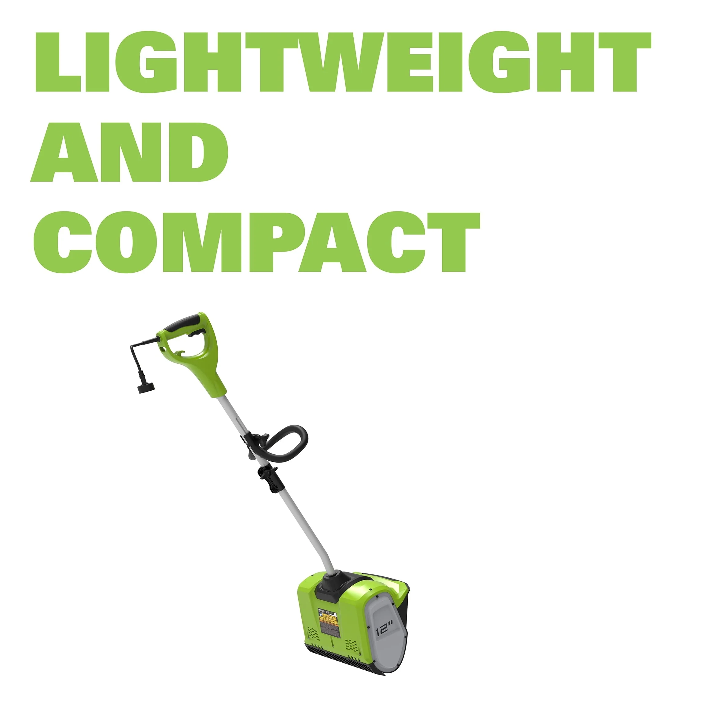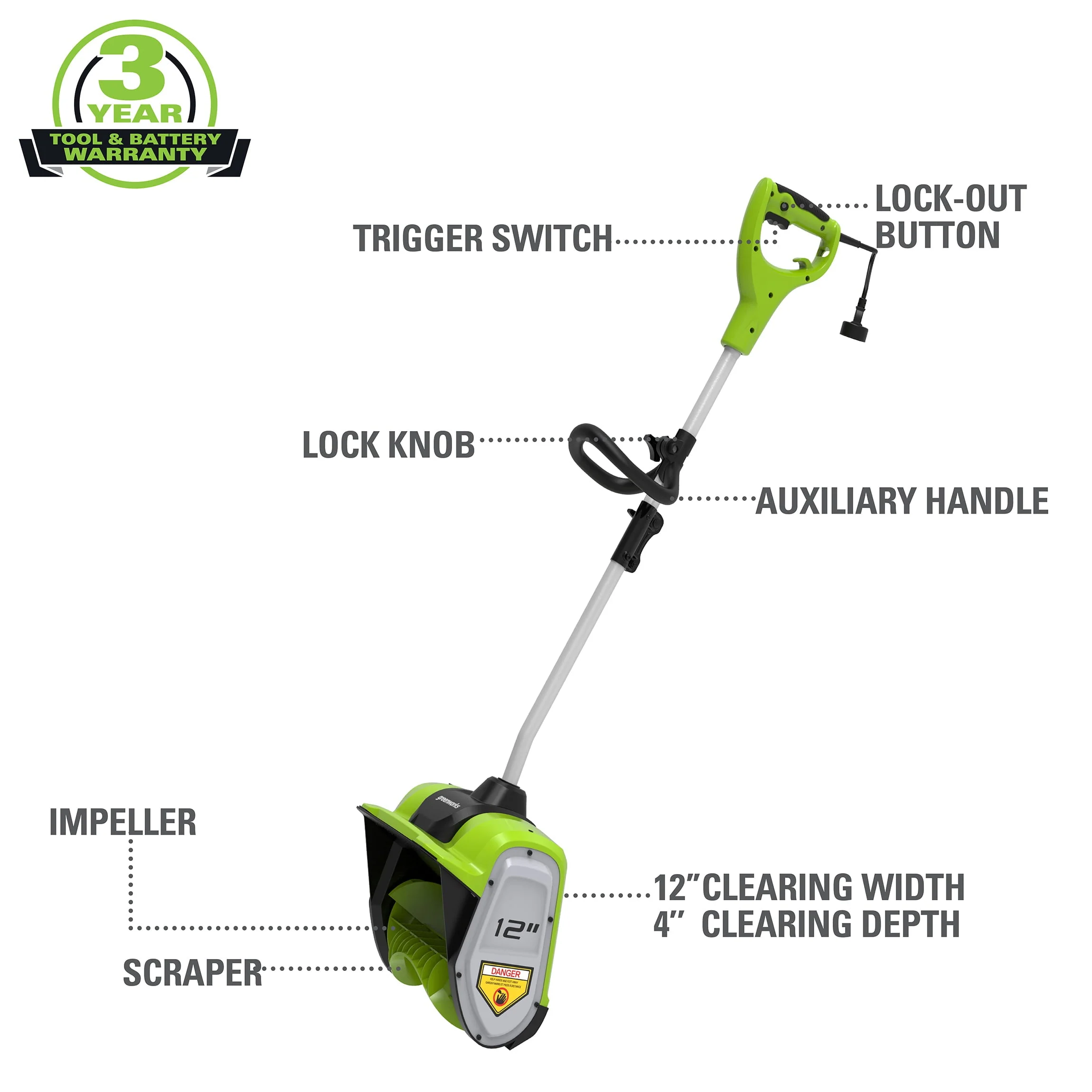 Combining innovation and functionality, the Greenworks 8 Amp 12-inch Corded Electric Snow Shovel provides an easy, convenient, and eco-friendly solution to get snow out of your way this winter. Lightweight and easy to maneuver, the 12-inch snow shovel powers through snow on the porch, patio, steps, sidewalk, and more. Simply plug-in and power-up. The ergonomic handle design eliminates the need to bend while the 2-blade paddle auger clears snow from your path and pavement, reducing the pain and strain of shoveling. Clear a path 12 inches wide by 4 inches deep in a single pass, while the durable scraper blade at the base of the unit lets you clear right to the ground without damaging your deck or driveway. And when the job is done easily store inside of a hall closet or hangs easily on the wall for quick, convenient access. The Greenworks Corded Electric Snow Shovel is backed by a 3-year warranty. Assembled product weight - 14.8 lbs.