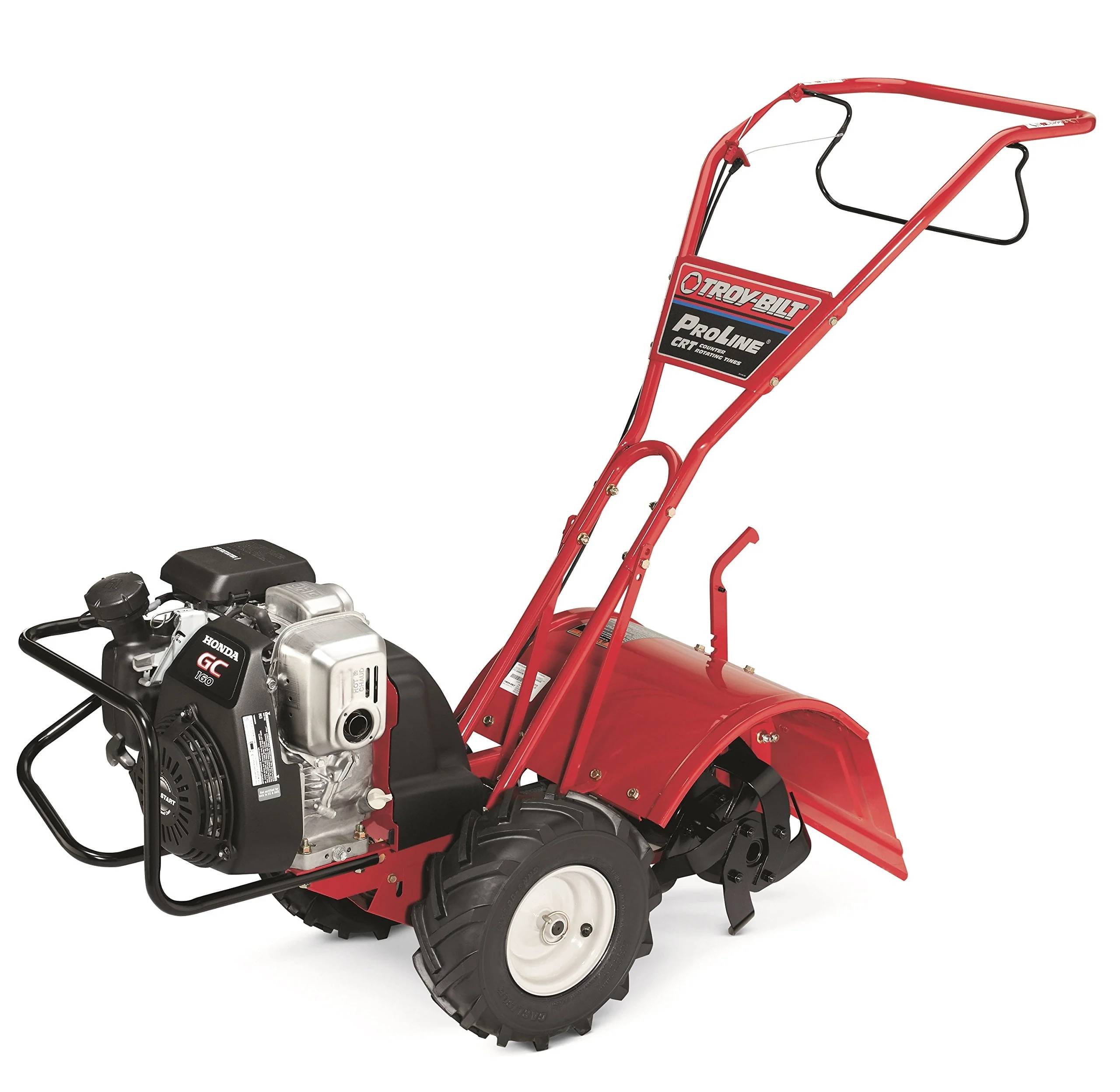 The Troy-Bilt Pro-Line CRT is a powerful counter-rotating garden tiller. A premium Honda 160cc GC engine provides the power to break up hard-packed soil quickly. Itâs also small enough to fit in between garden rows thanks to a tilling width of 16-in.