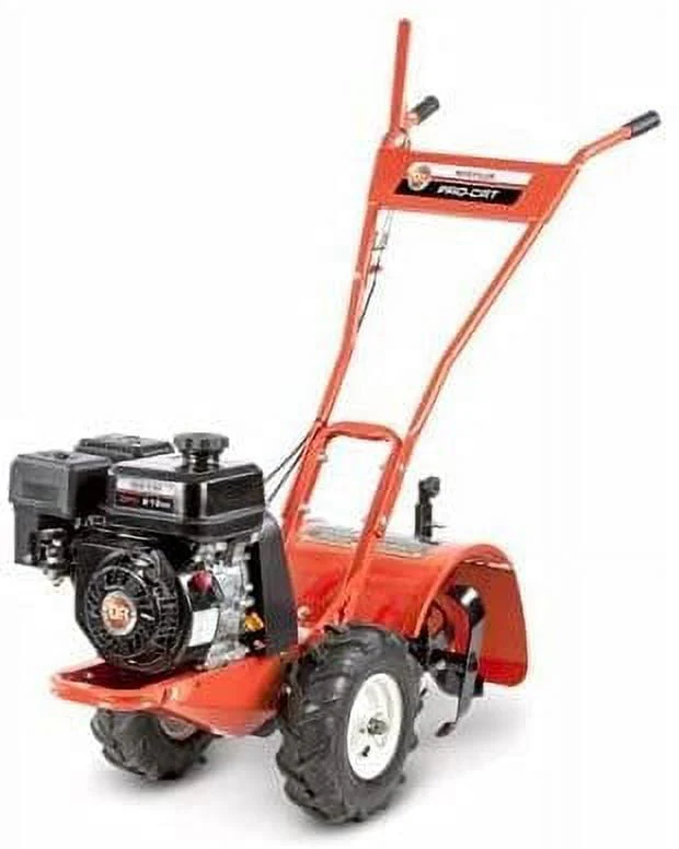 DR, Rear Tine Tiller, 212 cc 8.86 FPT, 10.2 FT/LB Gross Torque, Ohv Engine, 3700 RPM and Cast Iron Cylinder Sleeve, Tilling Width: 11", Tilling Depth: Up To 11", Tine Size: 11", Wheels: 13" Pneumatic, Power Driven Wheels. The tractor style pneumatic tires propel the tiller forward easily in almost any terrain. The wheels can be released with a pin for free-wheeling when needed to travel or maneuver the tiller. Counter Rotating Tines CRT rotate in opposition to the powered wheels, creating an aggressive tilling action. This helps hold the tiller back, preventing it from leap-frogging forward during heavier uses, like sod-busting or deep tilling in heavy clay soil. The drag stake provides extra resistance. When not needed, it can be raised and pinned in place. The debris shield protects operator from thrown soil. Easy-starting, OHV engine has 10.2 ft-lbs gross torque 212cc. 2 Year Warranty In Residential Use, 90 Days Commercial.