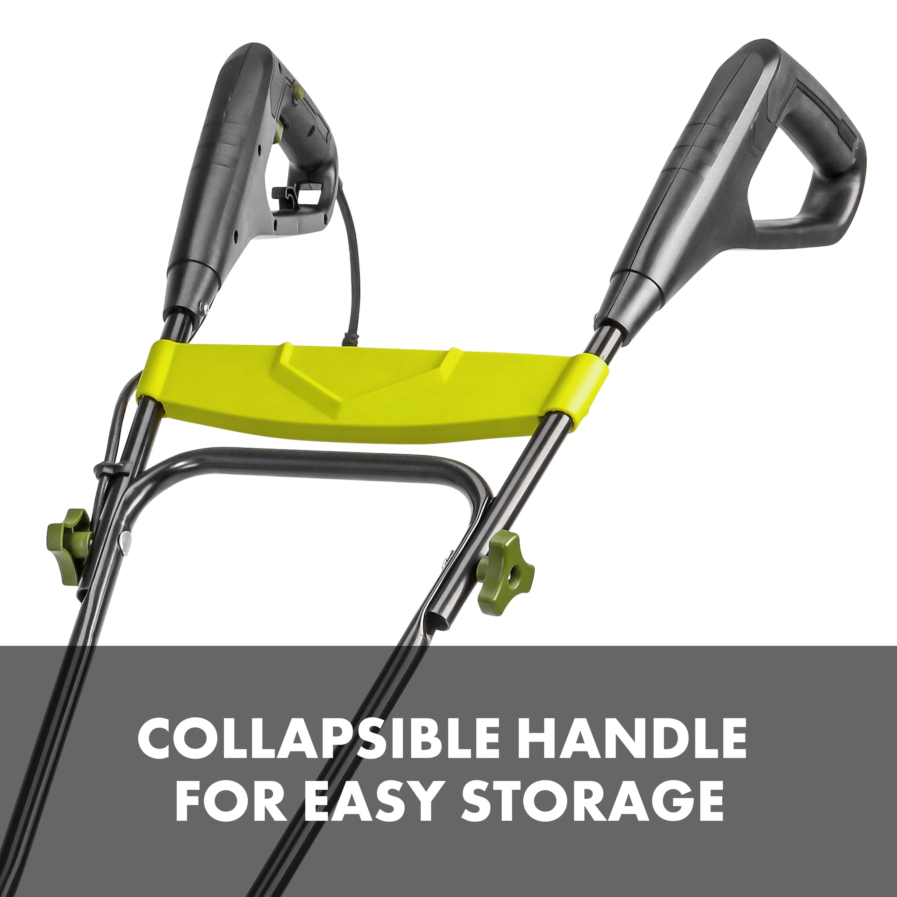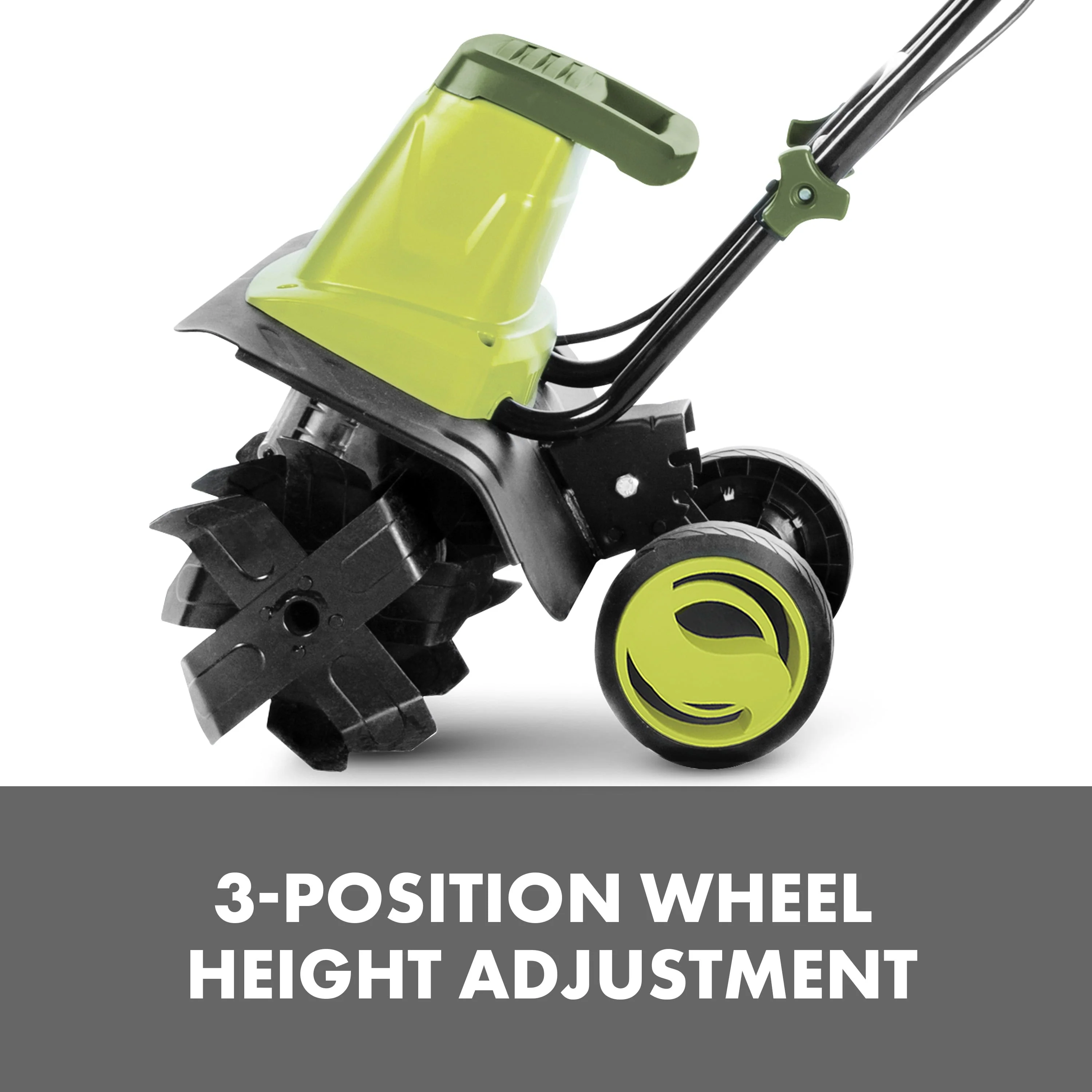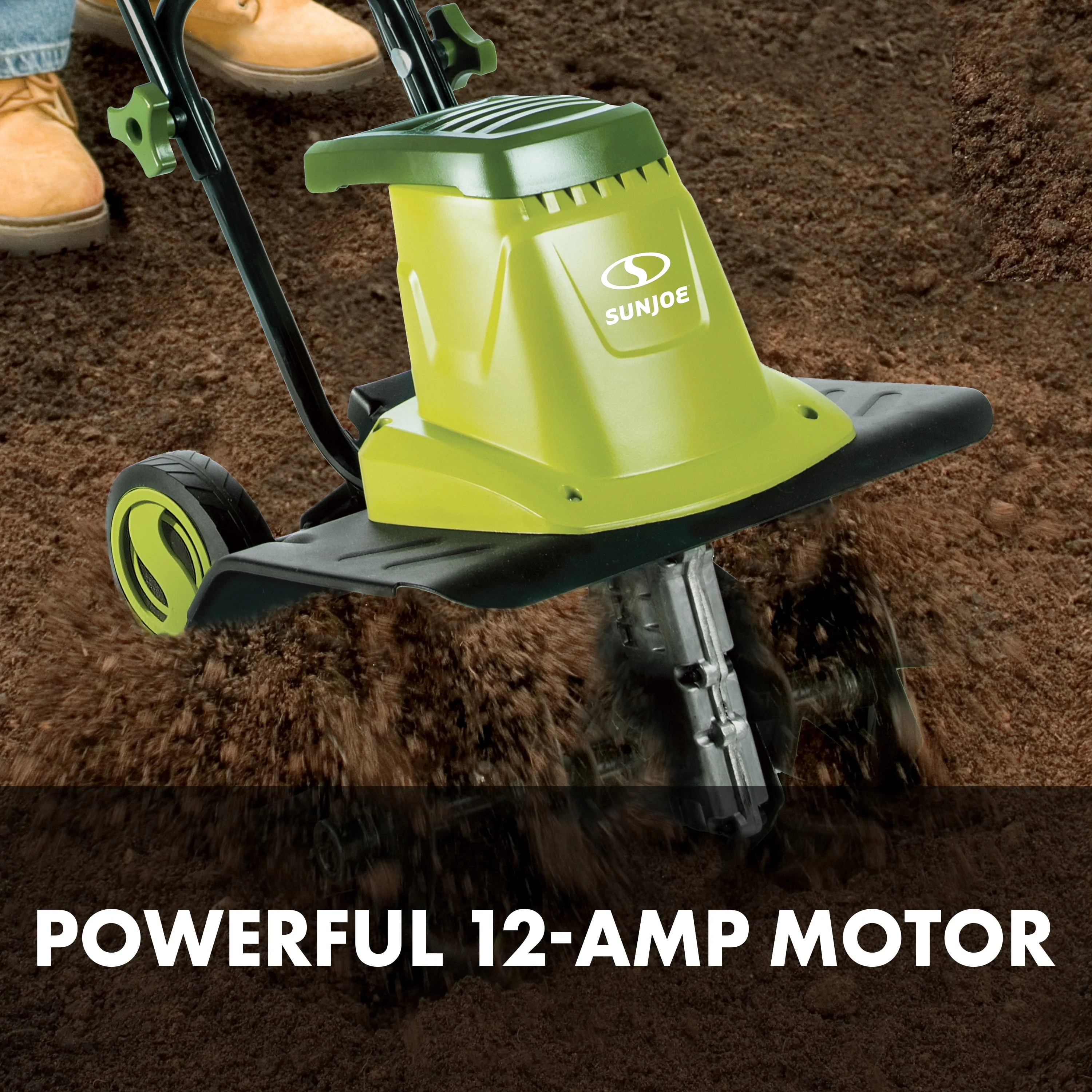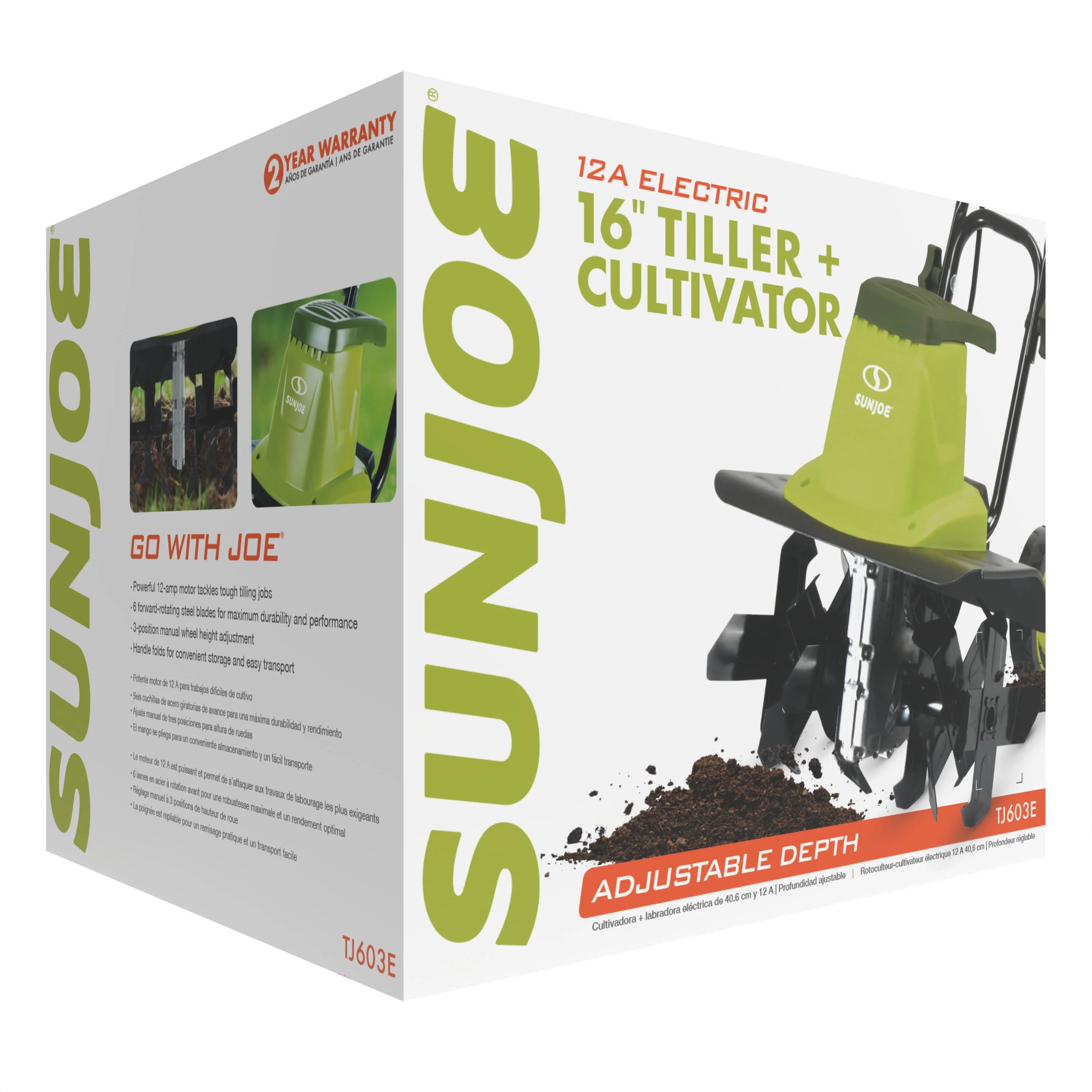 THE DIRTY LITTLE SECRET OF GREAT GARDENS. The Sun Joe® TJ603E Electric Tiller + Cultivator. Its mighty 12-amp motor effortlessly cuts through soil at 340 RPM, ensuring maximum aeration and an optimal seedbed for planting. Cover large areas with ease thanks to its 16-inch width and 8-inch depth capacity, saving you time and energy. Featuring six durable steel tines, this tiller delivers exceptional performance and durability. Tackle tough yard tasks and weed control effortlessly, while reducing strain and discomfort. The rear wheels enhance maneuverability, and the collapsible handle allows for convenient storage. Customize your experience with the three-position wheel adjustment, adapting to various soil types. Enjoy hassle-free operation with its maintenance-free design. Unleash the power of the Sun Joe TJ603E Electric Tiller + Cultivator and witness the transformation of your garden into a flourishing paradise. The Sun Joe Garden Tiller + Cultivator comes with a full two-year warranty and is ETL approved.