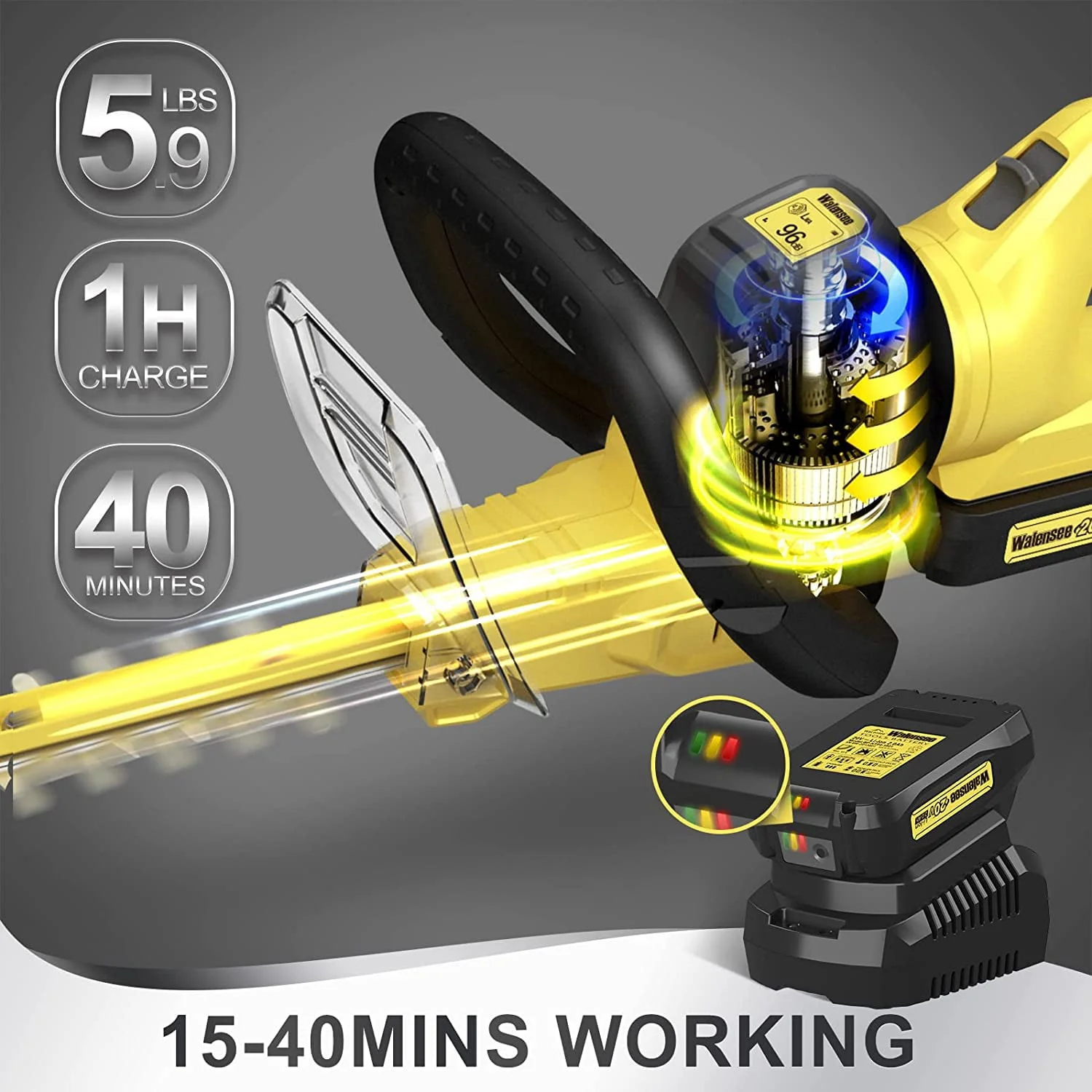 • Walensee 20V MAX Cordless Hedge Trimmer, 2.0ah Battery & Fast Charger Included