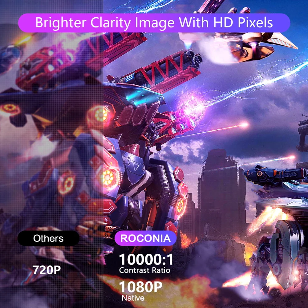Roconia Native 1920*1080P projector designed with the latest NTSC color technology with 13000 lumens brightness and has improved the color contrast ratio to 10000:1 to restore the real color content, which presents you with a real, dynamic, and color-vibrant projection image quality, provide you with a clearer and sharper visual feast.?The max 300" big screen brings you an immersive home theater viewing experience and better care for your eyes.(The projection comes with a 100" big screen)