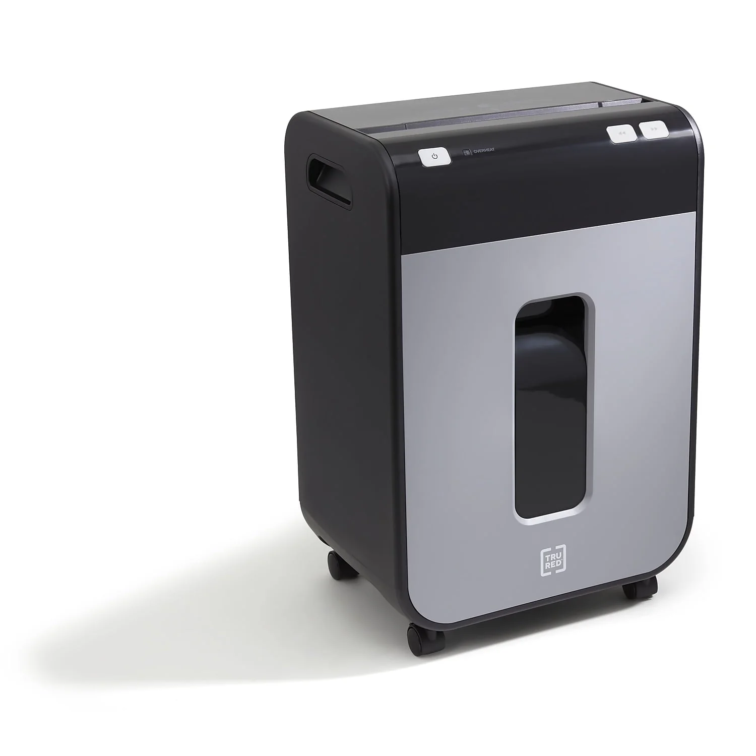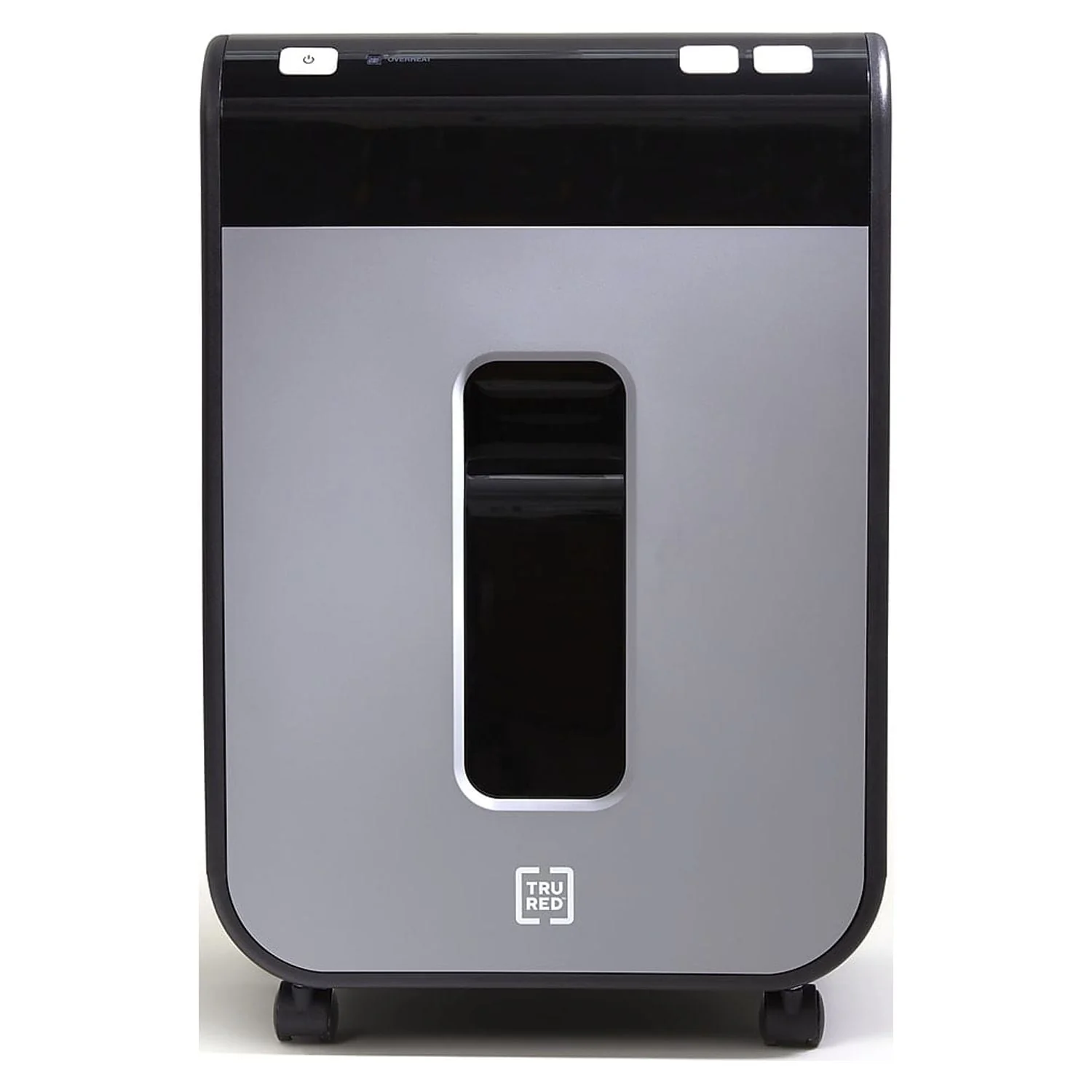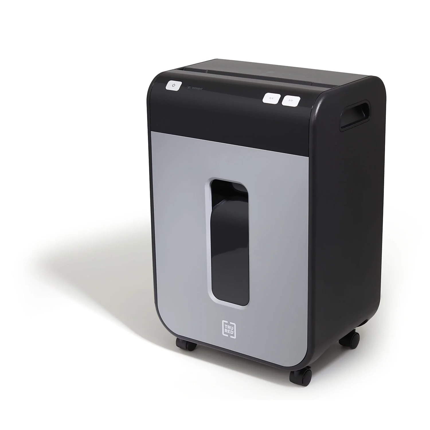 TRU RED??12-sheet micro-cut shredder reduces a standard letter sheet to up to 1200 particles.Financial statements, credit cards, personal data; today's homes and small offices are filled with personal correspondence that should be kept private. The TRU RED??12-Sheet Micro-Cut Shredder attends to your personal shredding needs, letting you dispose of papers safely and securely. The 12 sheet capacity lets you reduce papers to 4mm x 12mm particles, keeping sensitive information private. The built in handles and casters allow for easy movement and placement, perfect for moving out of the way when not in use. The Micro-cut takes your data down to 4mm x 12mm particles (up to 1200 per letter size sheet). Provides complete shredding for: credit cards, staples, and paper. P-4 Rating provides increased sensitive data security for financial, personal, and confidential information. Dimensions: 21.2"H x 14.3"W x 10"D. 10-minute continuous run time with a 40-minute cool down between cycles. Black/gray pull-out bin with 5.8 gal. capacity for easy emptying and disposal of shredded content alone or with Shredder Bags (sold separately). Interlocking Bin prevents operation of shredder if bin is not fully engaged. Essential safety features such as Anti-Jam, Auto Start-Stop, Auto-Reverse, and Overload protect the user as well as the shredder. Dual casters make shredder easy to move and lock once in place. 1-year limited warranty. WARNING: This product can expose you to chemicals including lead, which is known to the State of California to cause cancer and birth defects or other reproductive harm. For more information go to www.P65Warnings.ca.gov.Product Instructions. Sold as 1 Each.