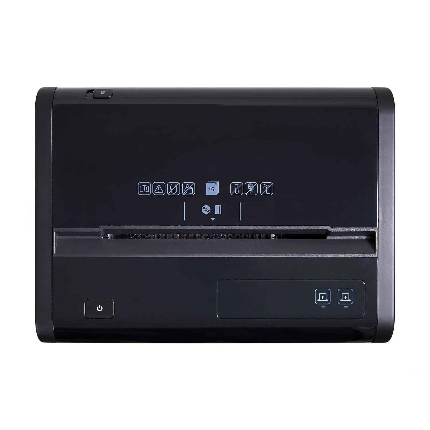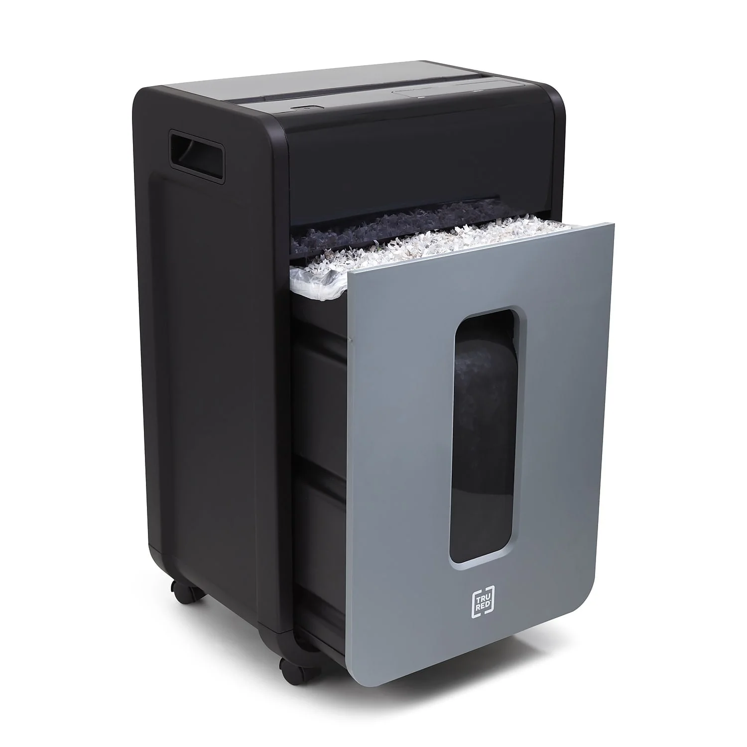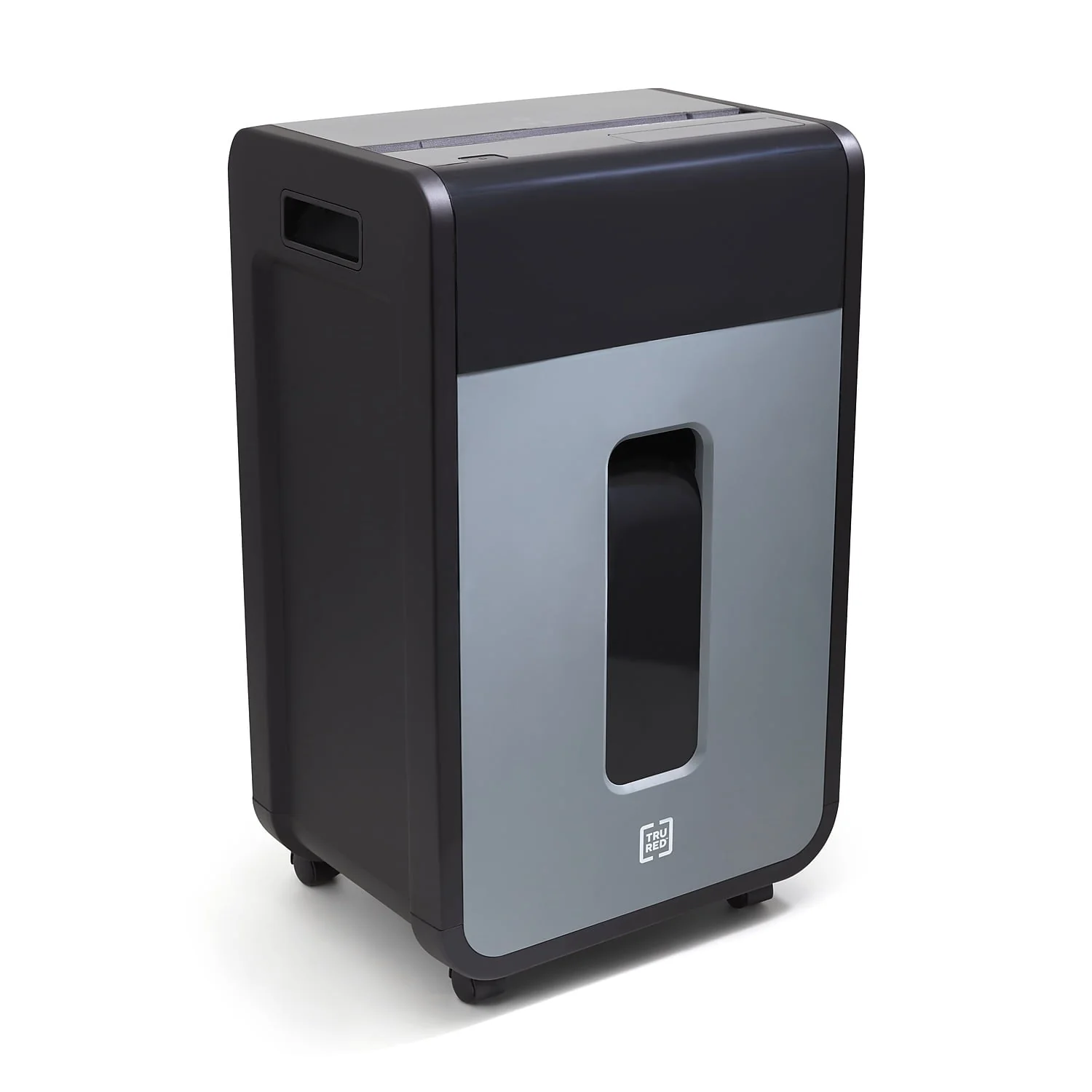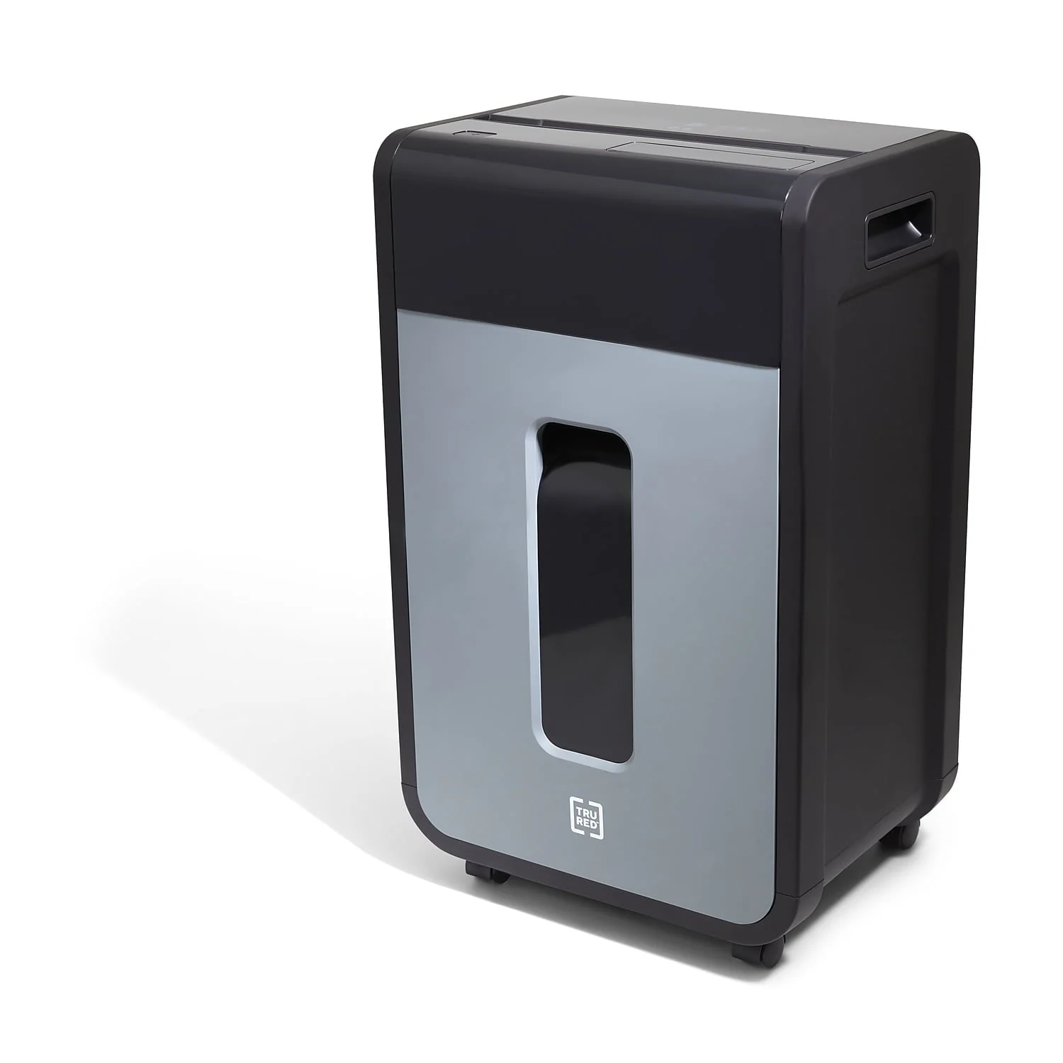 TRU RED??16-sheet cross-cut shredder reduces a standard letter sheet to up to 418 particles.Today's world makes protecting your data essential. This TRU RED??16-sheet crosscut shredder reduces a variety of paper and media to 4mm x 40mm particles, keeping your secure data just that, secure. Integrated jam protection and overload indicators protect not only your shredder, but the user as well. Smooth rolling casters and integrated handles allow you to position the shredder where you need it, when you need it. The Cross-cut takes your data down to 4mm x 40mm particles (up to 418 per letter size sheet). Provides complete shredding for: CDs, credit cards, staples, paper clips, paper, and DVDs. P-4 Rating provides increased sensitive data security for financial, personal, and confidential information. Dimensions: 24.4"H x 14.7"W x 11.5"D. 20-minute continuous run time with a 40-minute cool down between cycles. Black/gray pull-out bin with 8 gal. capacity for easy emptying and disposal of shredded content alone or with Shredder Bags (sold separately). Interlocking Bin prevents operation of shredder if bin is not fully engaged. LED Indicator for Bin Full allows you to see status at a glance. Essential safety features such as Anti-Jam, Auto Start-Stop, Auto-Reverse, and Overload protect the user as well as the shredder. Dual casters make shredder easy to move and lock once in place. 3-year limited warranty. WARNING: This product can expose you to chemicals including Di(2-ethylhexyl)phthalate which is known to the State of California to cause birth defects or other reproductive harm. For more information go to www.P65Warnings.ca.gov.Product Instructions. Sold as 1 Each.