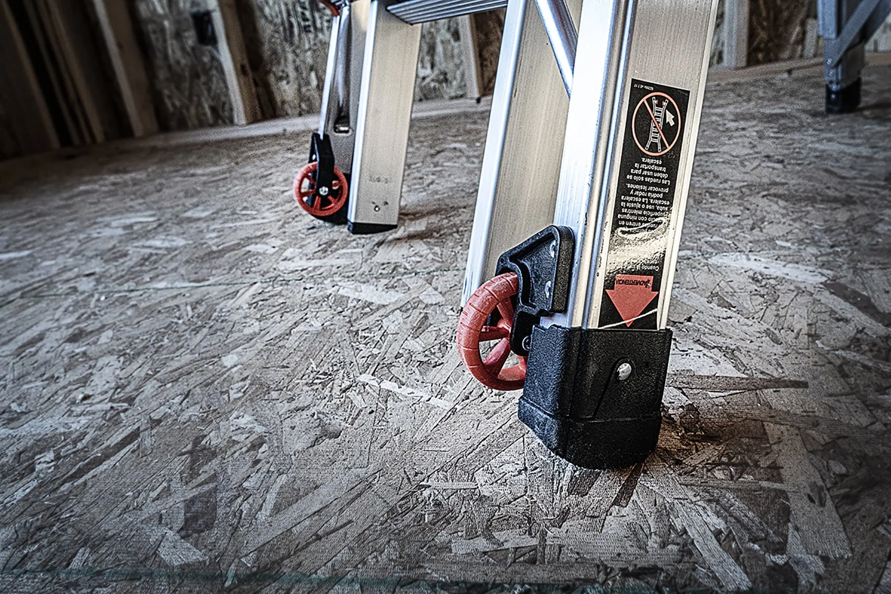 The Velocity is a lightweight, multi-position ladder with added features to make set up and take down simple. To adjust the height of the ladder, simply push in the Rock Lock adjusters and move the inner section to the height you need. When you need to move the ladder from place to place, tip the ladder on its wheels and roll it with the Tip & Glide wheels.