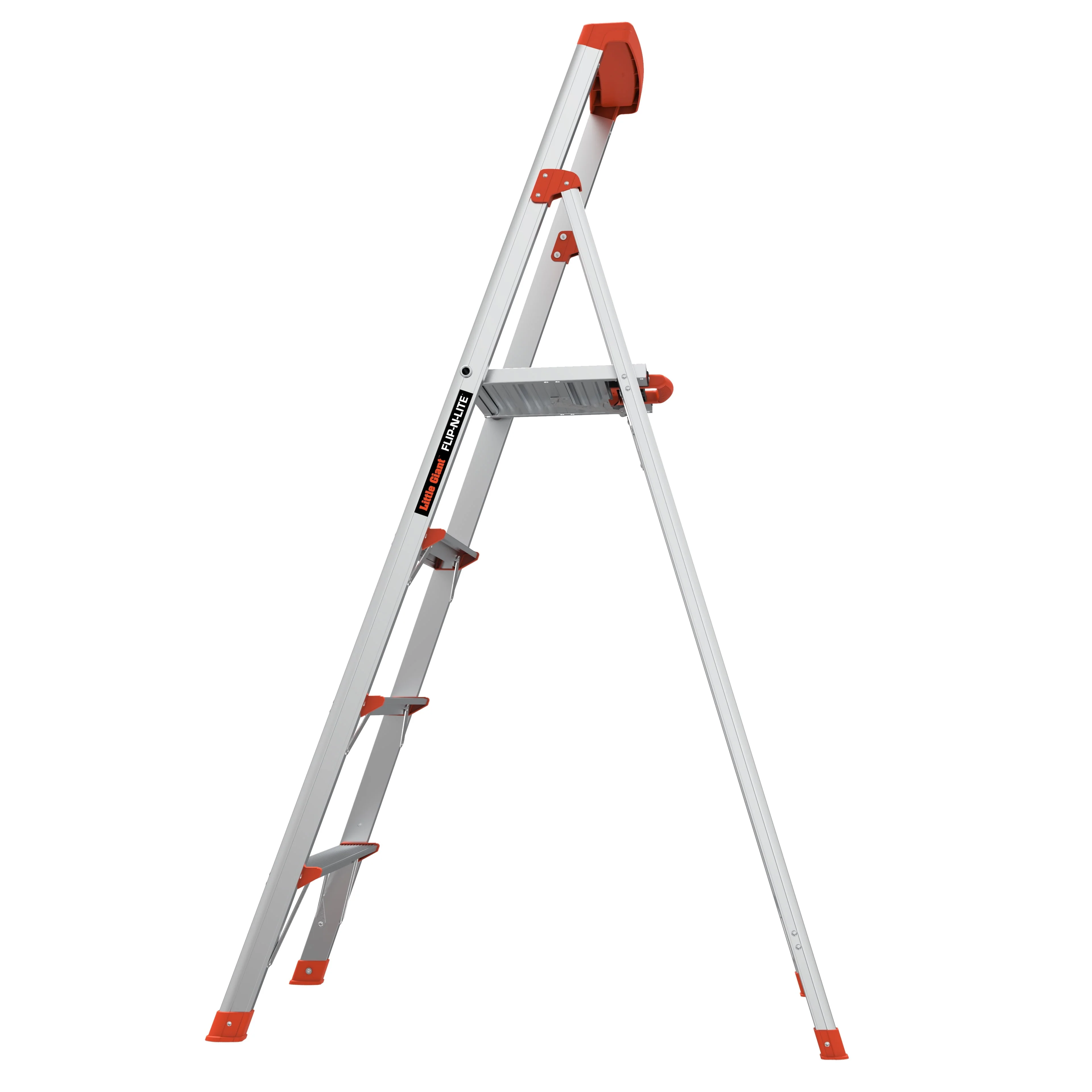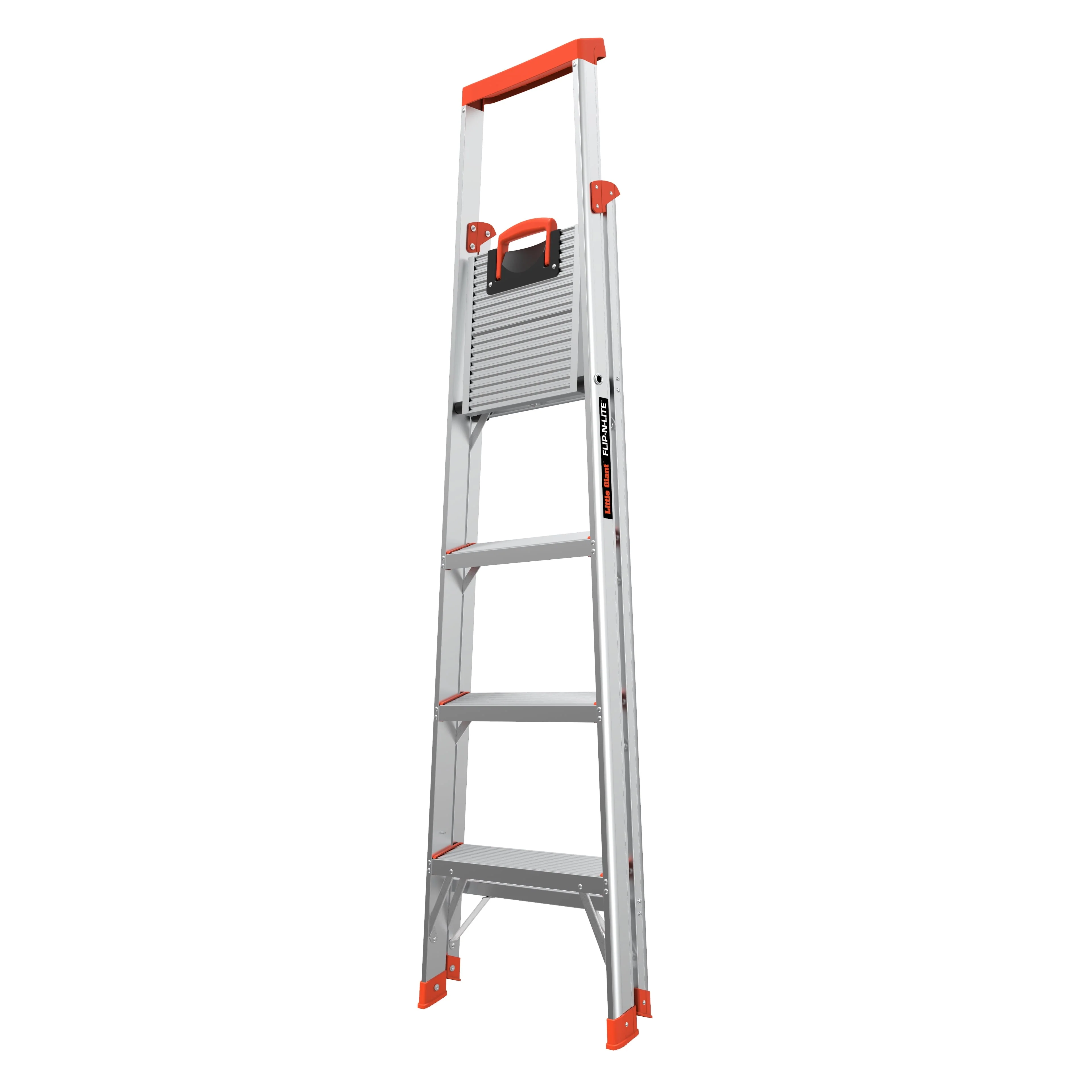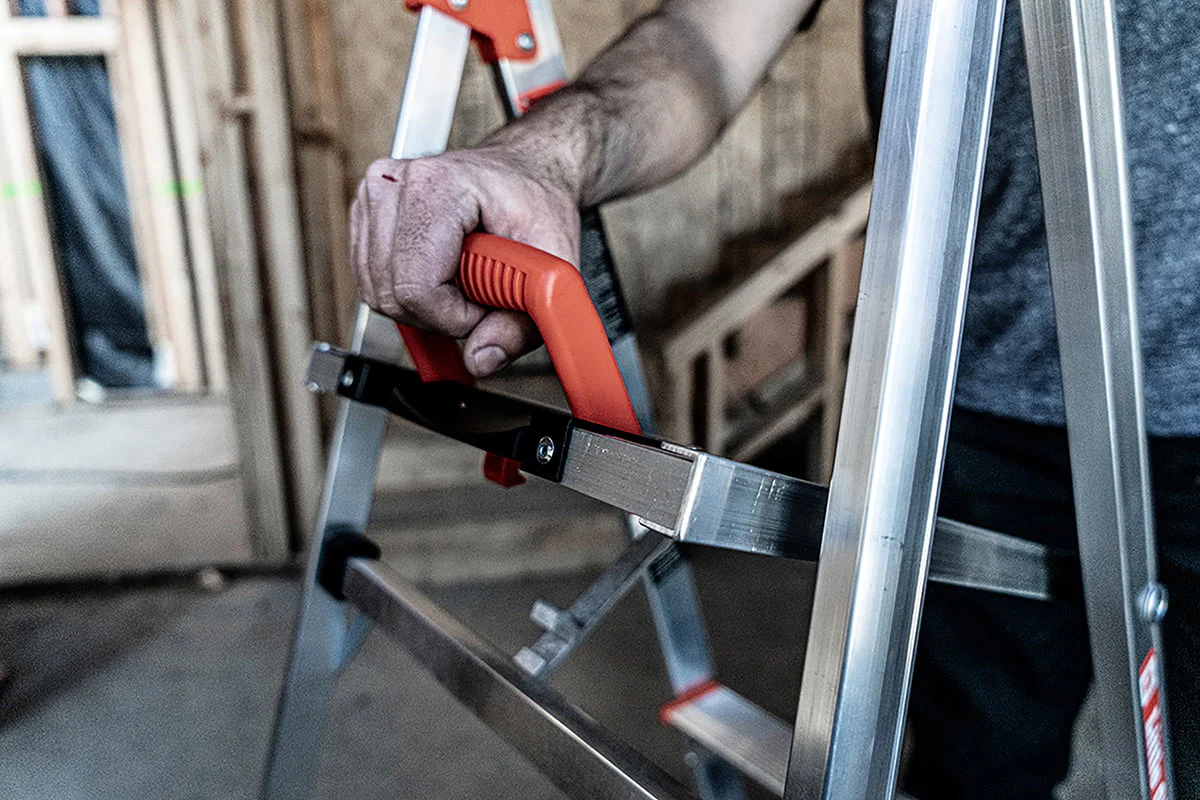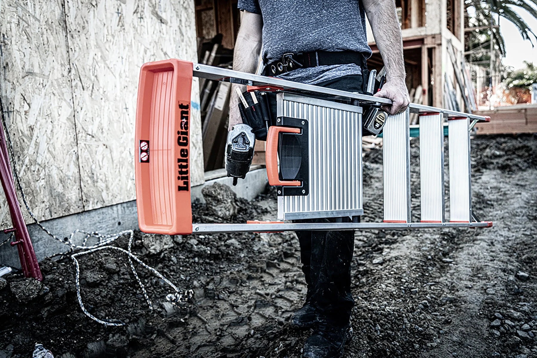 The Flip-N-Lite is the perfect stepladder to help you reach those out of reach areas at the job site. Transport and set up your ladder with ease. The Flip-N-Lite can be carried, set up and collapsed with one hand for simple operation. On a regular step ladder, for safety it is stated that you do not stand on the top cap or the top rung. Little Giant has removed that top rung to keep the user from standing on it, and in turn made a large standing platform at the highest standing level. Keeping the user safe and secure.
