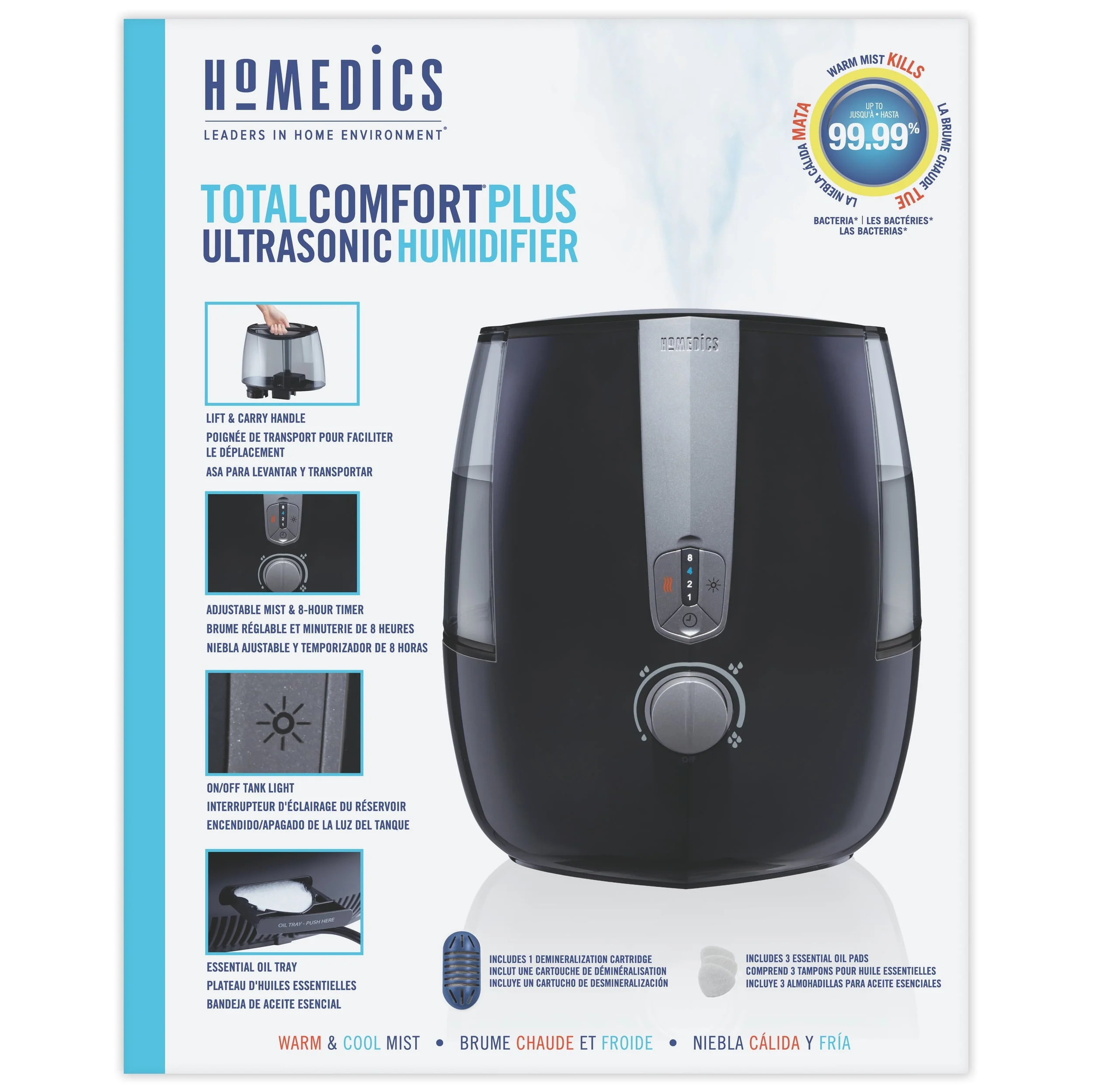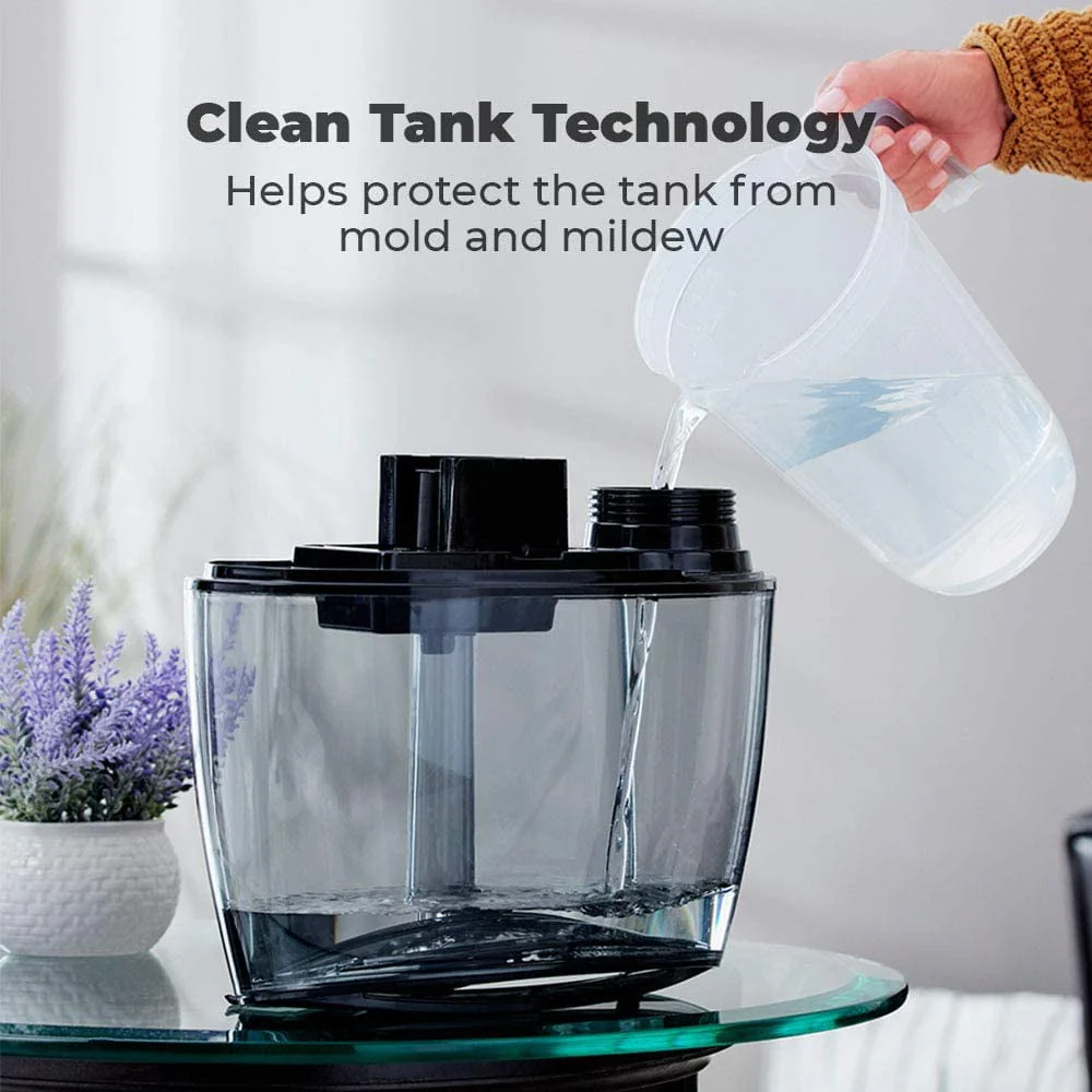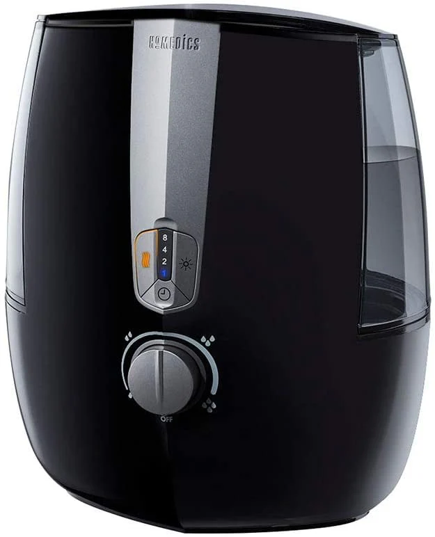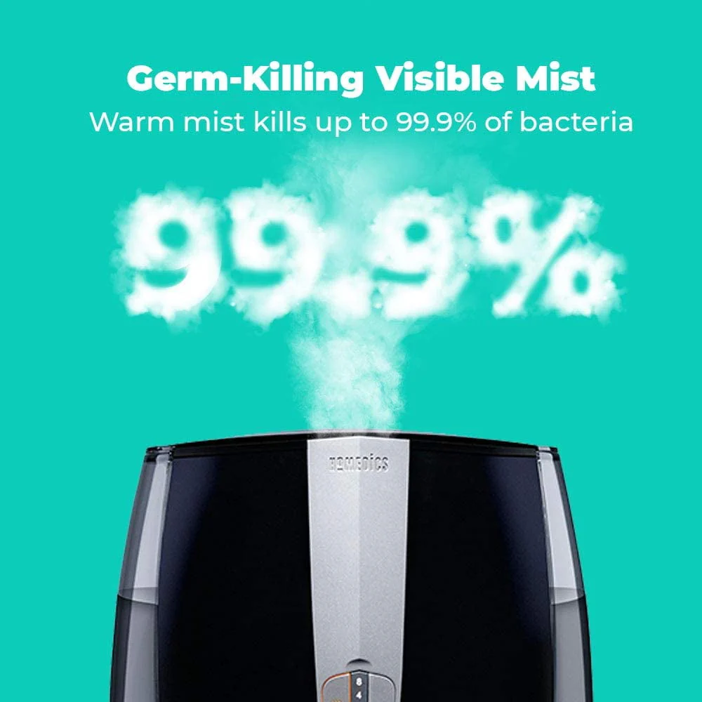 The HoMedics Total Comfort Plus Ultrasonic Humidifier is perfect for large sized rooms. Humidifies rooms up to 547 sq./ ft. it is Ideal for large bedrooms or living spaces and can easily be transported from room to room. It produces a visible warm or cool mist for up to 65 hours of runtime. The warm mist setting kills up to 99.9% of bacteria so you can breathe easier knowing you��re helping to protect against germs. Enjoy the benefits of aromatherapy with the included essential oil pads. A night-light, essential oil tray, and auto-off timer ensure ambiance and premium air quality control in large rooms up to 547 sq. ft. program this device to power down after 1, 2, 4 or 8 hours of use; Or if you forget to set the timer, your unit will power down automatically when it gets low on water. The 1.4-gallon tank features Clean Tank Technology helps prevent the growth of mold and mildew on the surface of the tank. Adding Humidity to your space can help reduce common allergy symptoms, soften dry, cracked skin during winter and beyond. Humidifiers in the home also help Keep houseplants healthier.