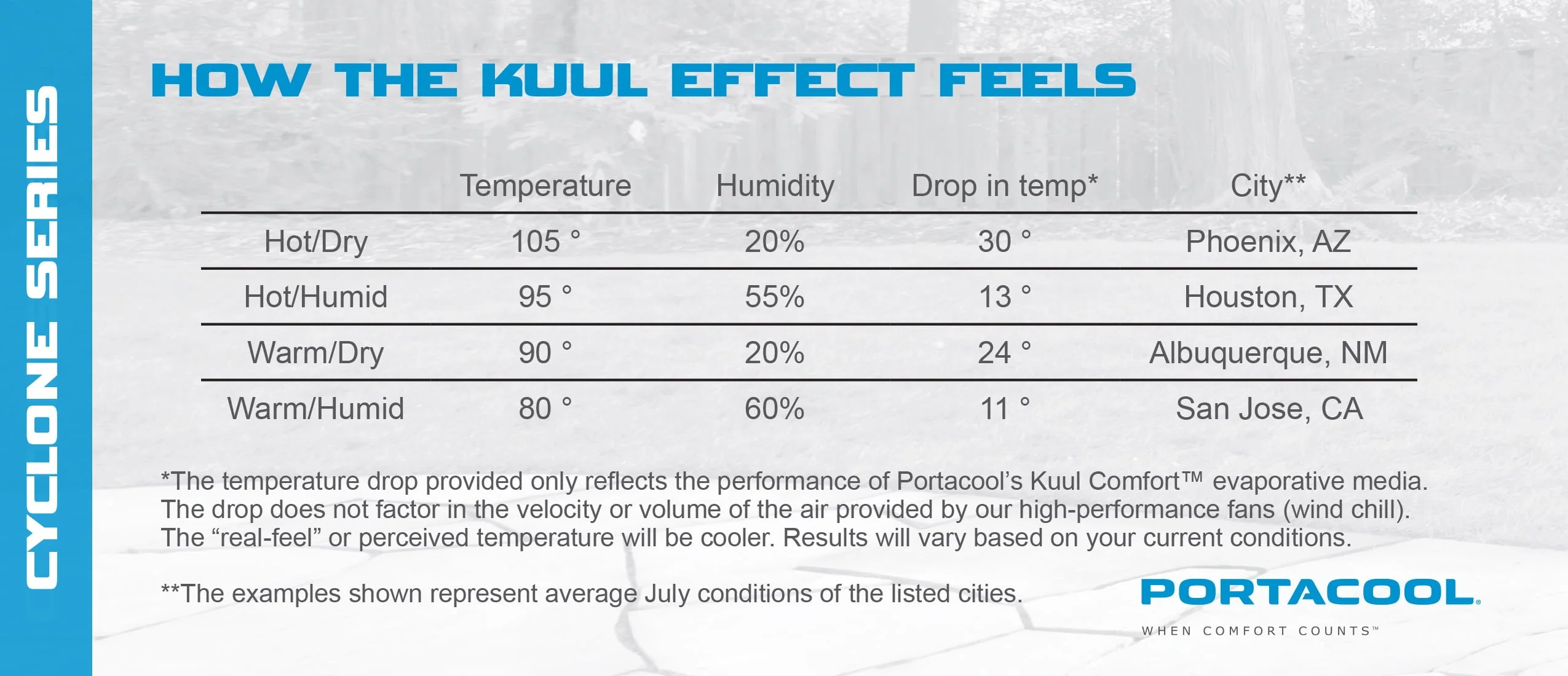 The Portacool Cyclone??series of portable evaporative coolers are powerful, affordable units that are designed for cooling spaces where traditional cooling methods are not practical. Equipped with rotational molded housings for extreme durability, Kuul Comfort??evaporative media for maximum cooling efficiency, and delivering powerful air velocity to quietly cool your space. These energy-efficient units provide an improved alternative to fans and misters.