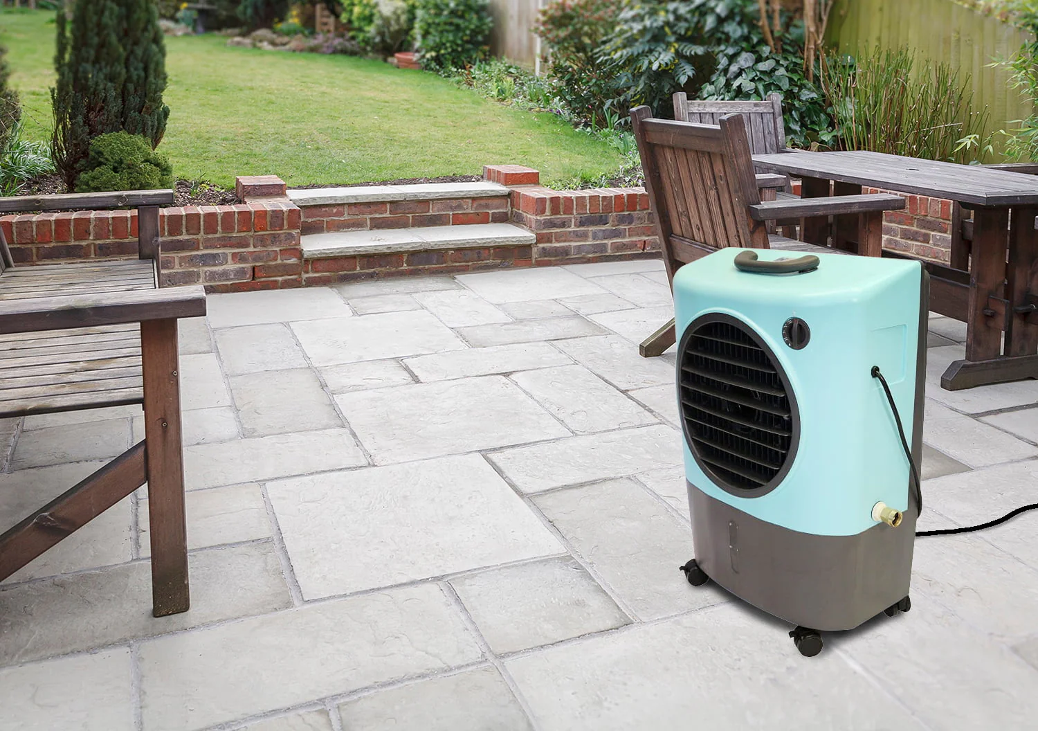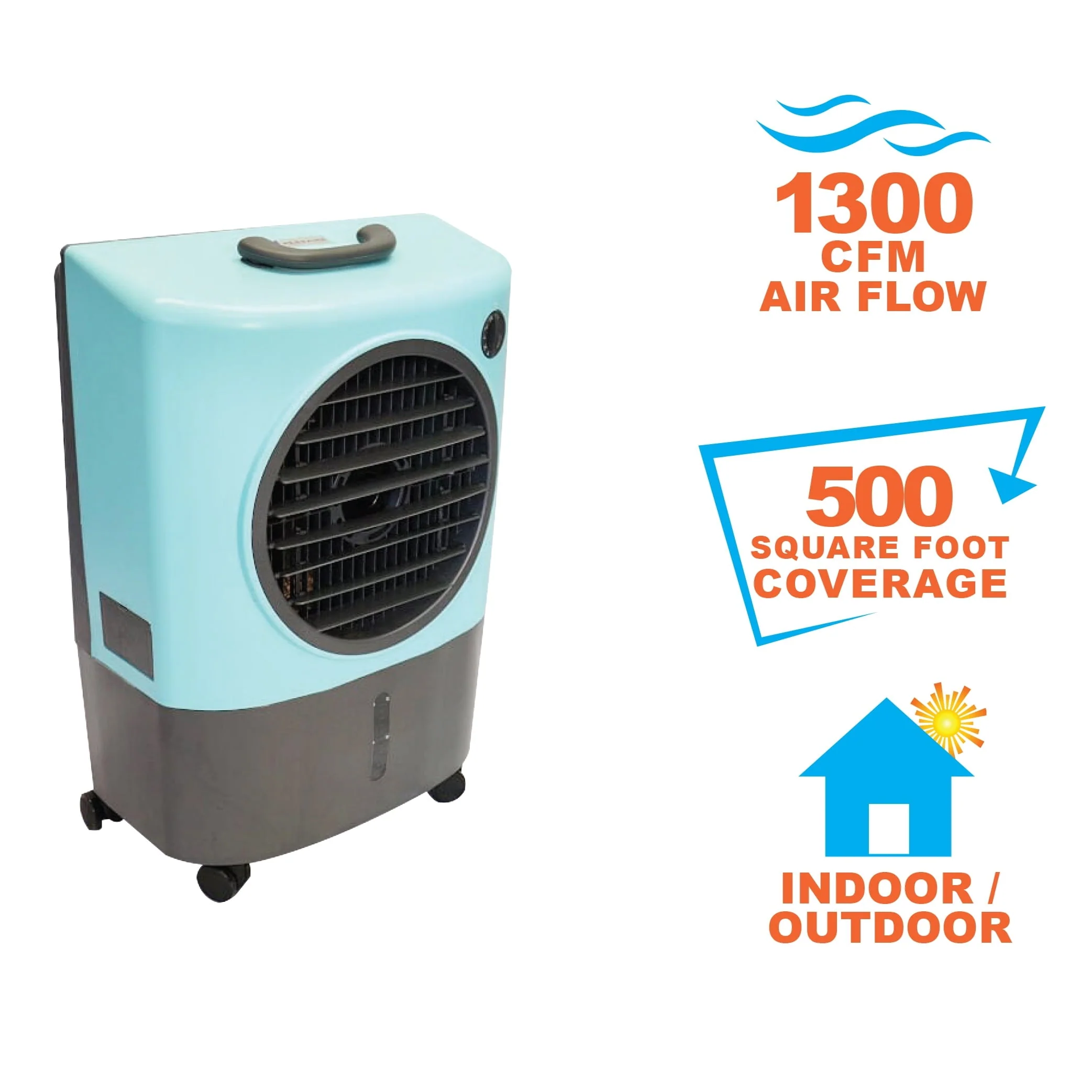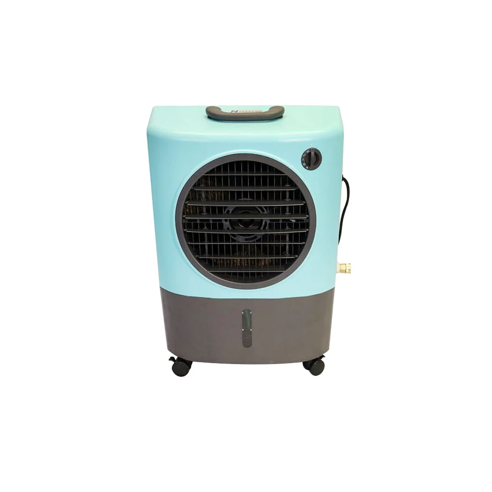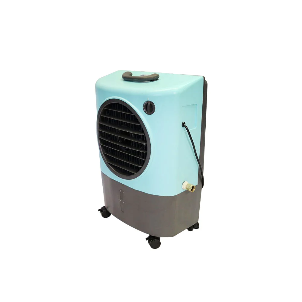 Keep the air around you cool inside and outside your home. With the Hessaire Portable Evaporative Air Cooler, you can stay cool inside your home, out on your patio, or at your campsite. Just plug it in and you're ready to chill.This air cooling system cools warm, stale air with natural evaporation. As the water inside the swamp cooler evaporates into the air circulating through the cooling system, the air lowers in temperature. The MC18V air cooler can cool areas as large as 500 square feet. The fan draws air in and circulates it back out at a rate of 1,300 cubic square feet per minute. This portable swamp cooler has a 4.8-gallon water reservoir that you can fill through the cooler's manual water fill or through your garden hose connected to its water hose adapter. This evaporative wet air cooler is ideal for areas with low humidity since water must be able to evaporate easily. The 2 fan-only settings, 2 evaporative settings, and 1 pump only setting allows you to adjust to the perfect temperature. This Hessaire Indoor/Outdoor Cooler Humidifier moves where you need it thanks to its lightweight design, heavy-duty wheels, and convenient handle.