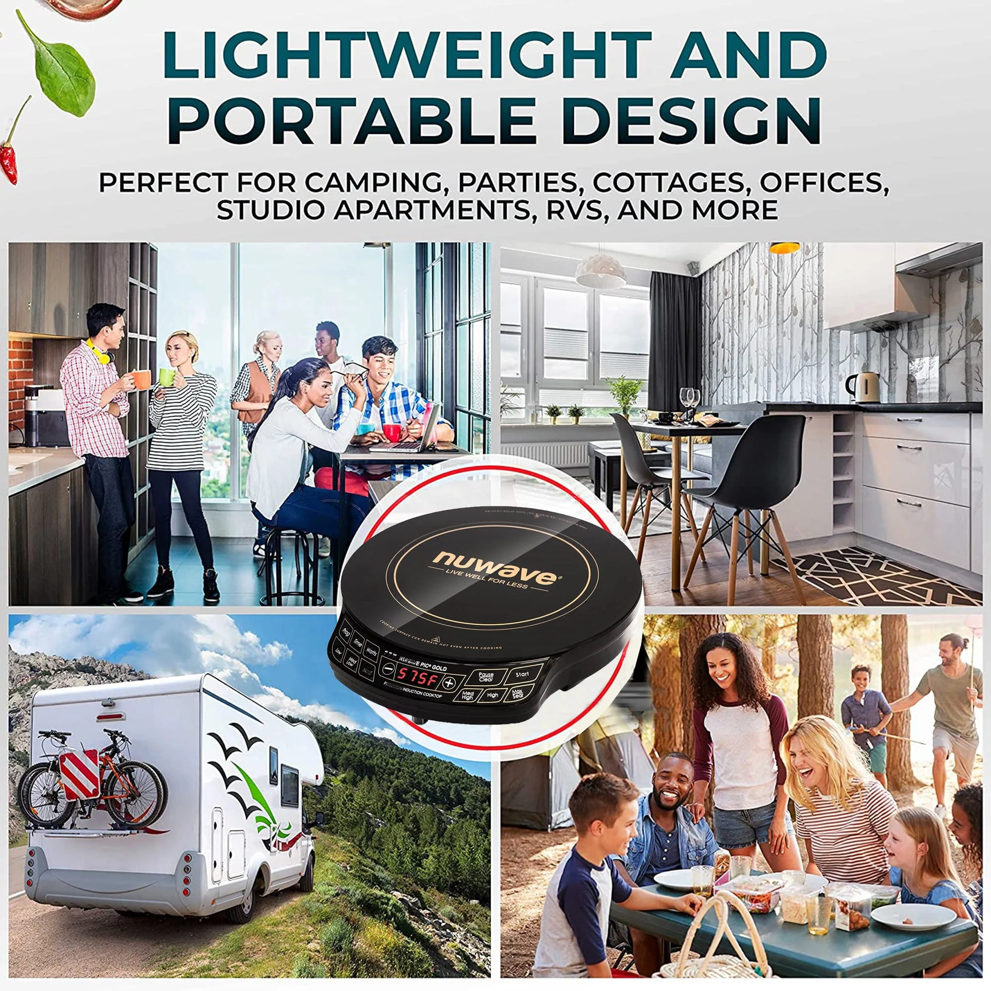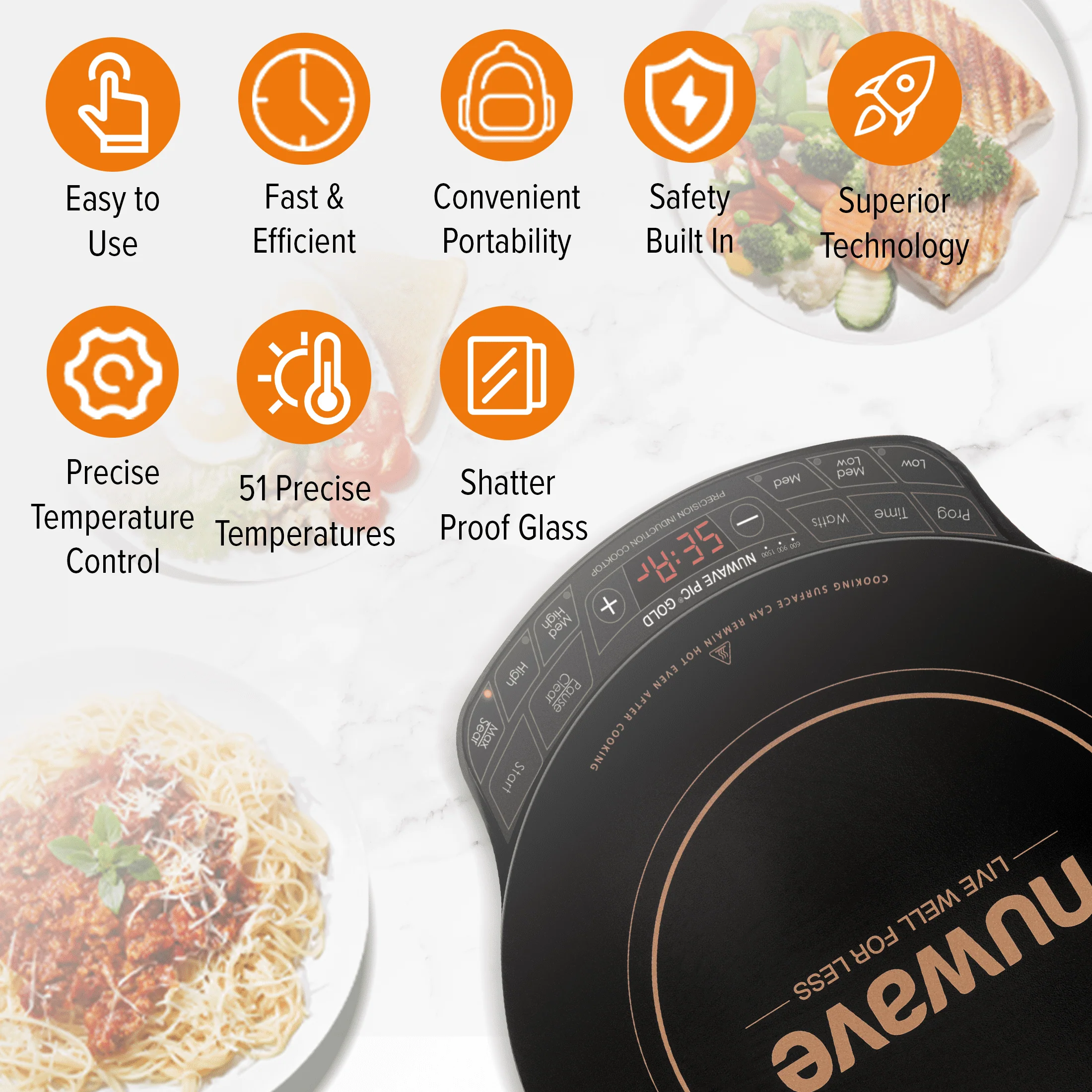 NuWave PIC Gold Precision Induction Cooktop Flex offers precise temperature control with the simple press of a button. You can adjust the cooking temperature in 10 Degree increments between 100��F to 575��F for a total of 51 precise temperature settings. The PIC's induction technology heats the cookware directly, no the surrounding area, making it incredibly safe. With no open flame or hot coil, there's virtually no risk of fire. Utilizing 1500 watts of power, the lightweight and portable PIC allows you to cook gourmet meals virtually anywhere. It even offers state-of-the-art programming technology that allow you to program your favorite cooking procedures.