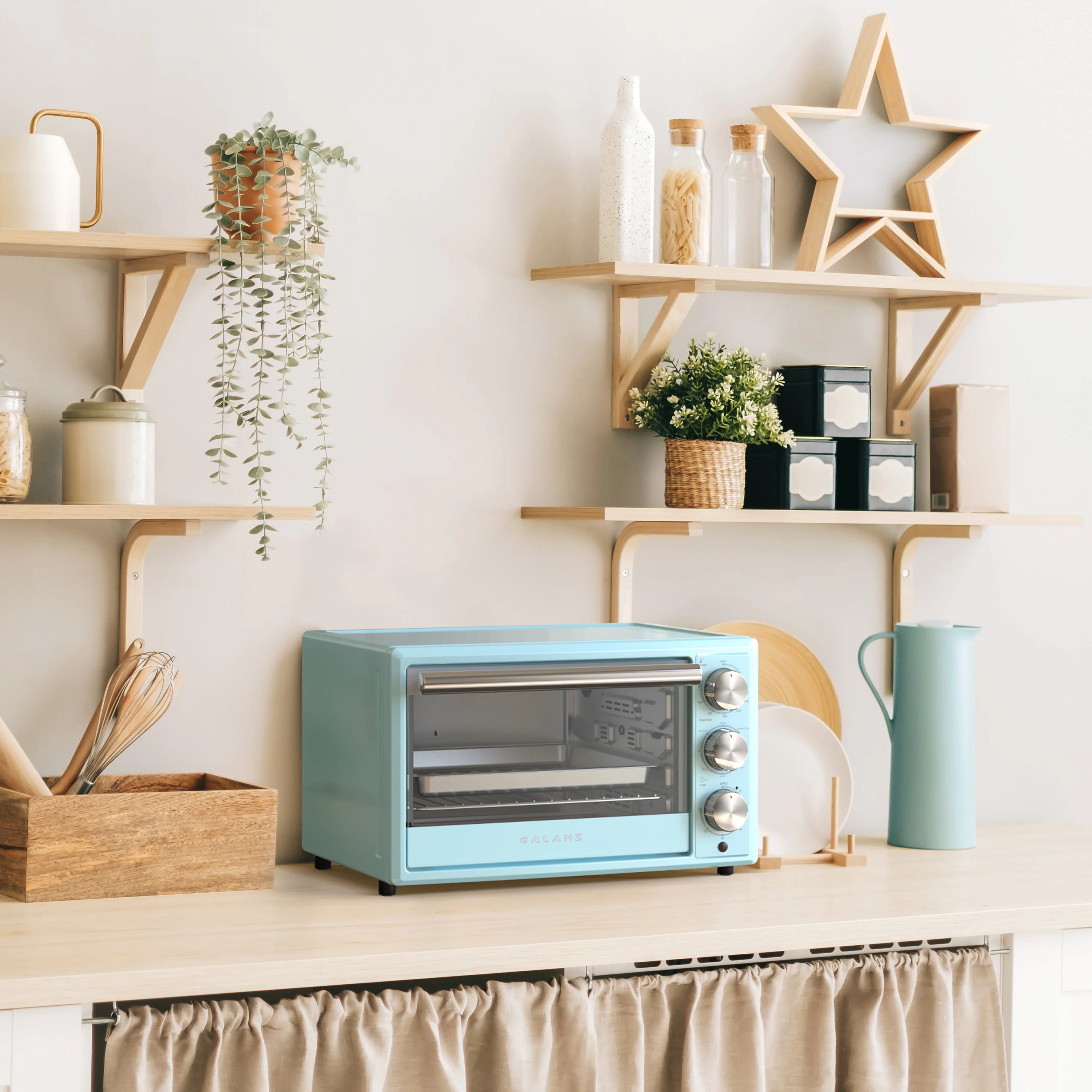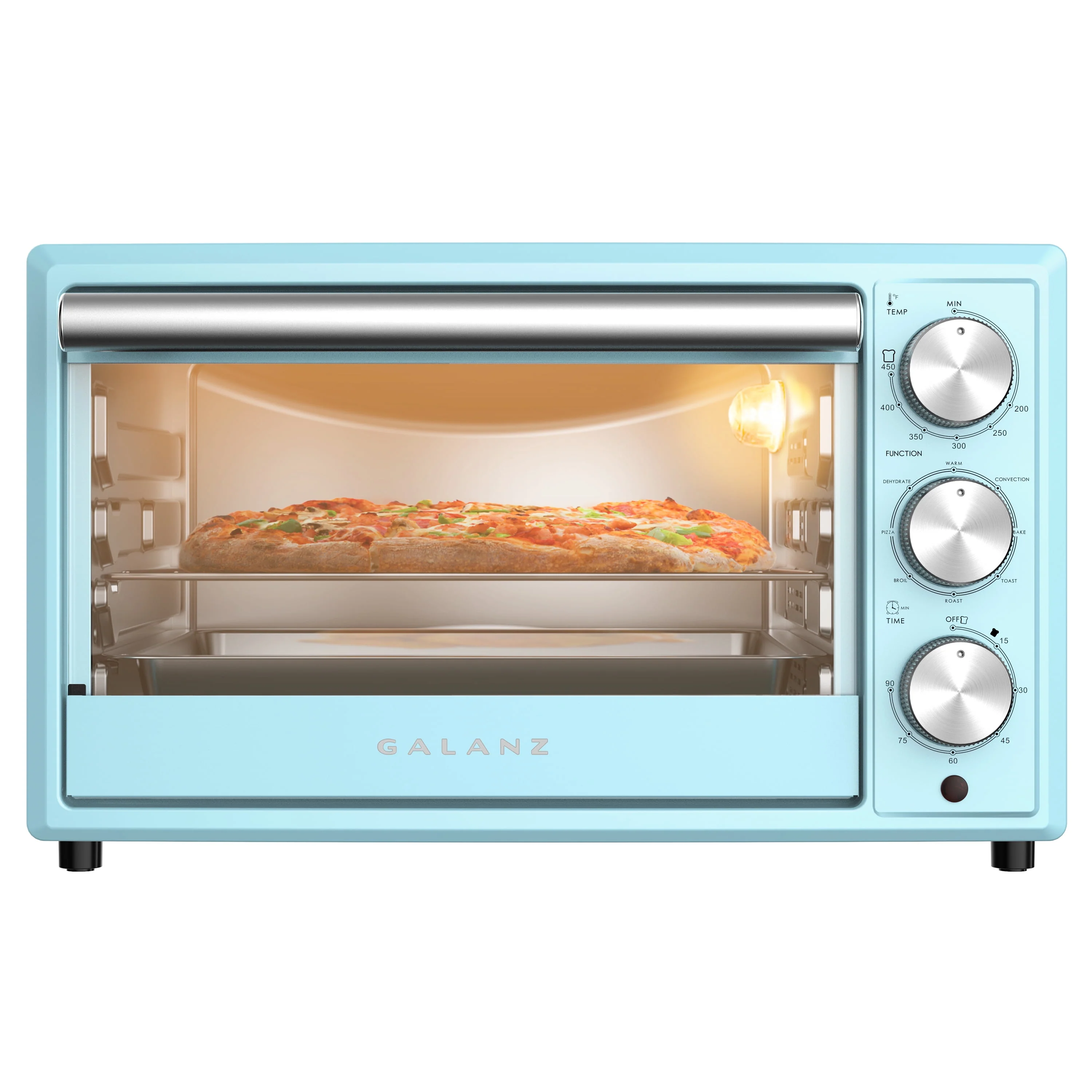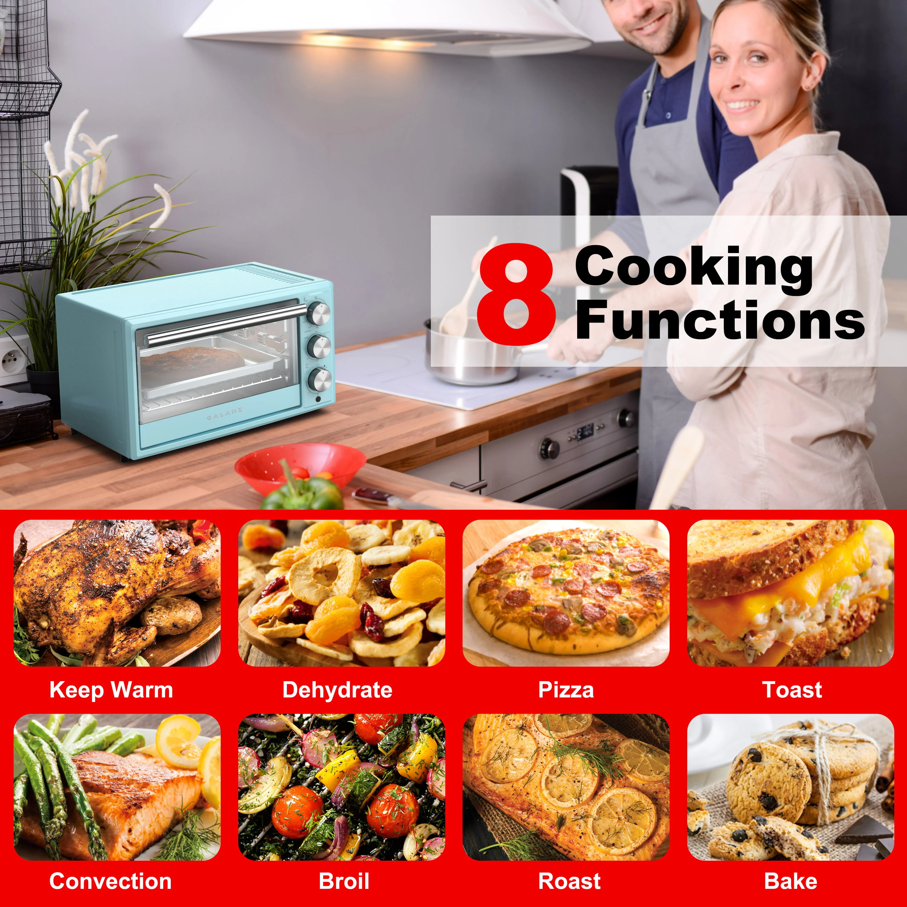 This Galanz 0.9 Cu. Ft., 1500 watts retro toaster oven with its Bebop Blue look can complement your kitchen with different styles. This thoughtful toast oven offers 8 cooking functions, including Bake, Toast, Roast, Broil, Pizza, Dehydrate, Keep Warm, Convection. It is also convenient for users to set the time and temperature. Besides, glass door provides better visibility while cooking without opening the door.
