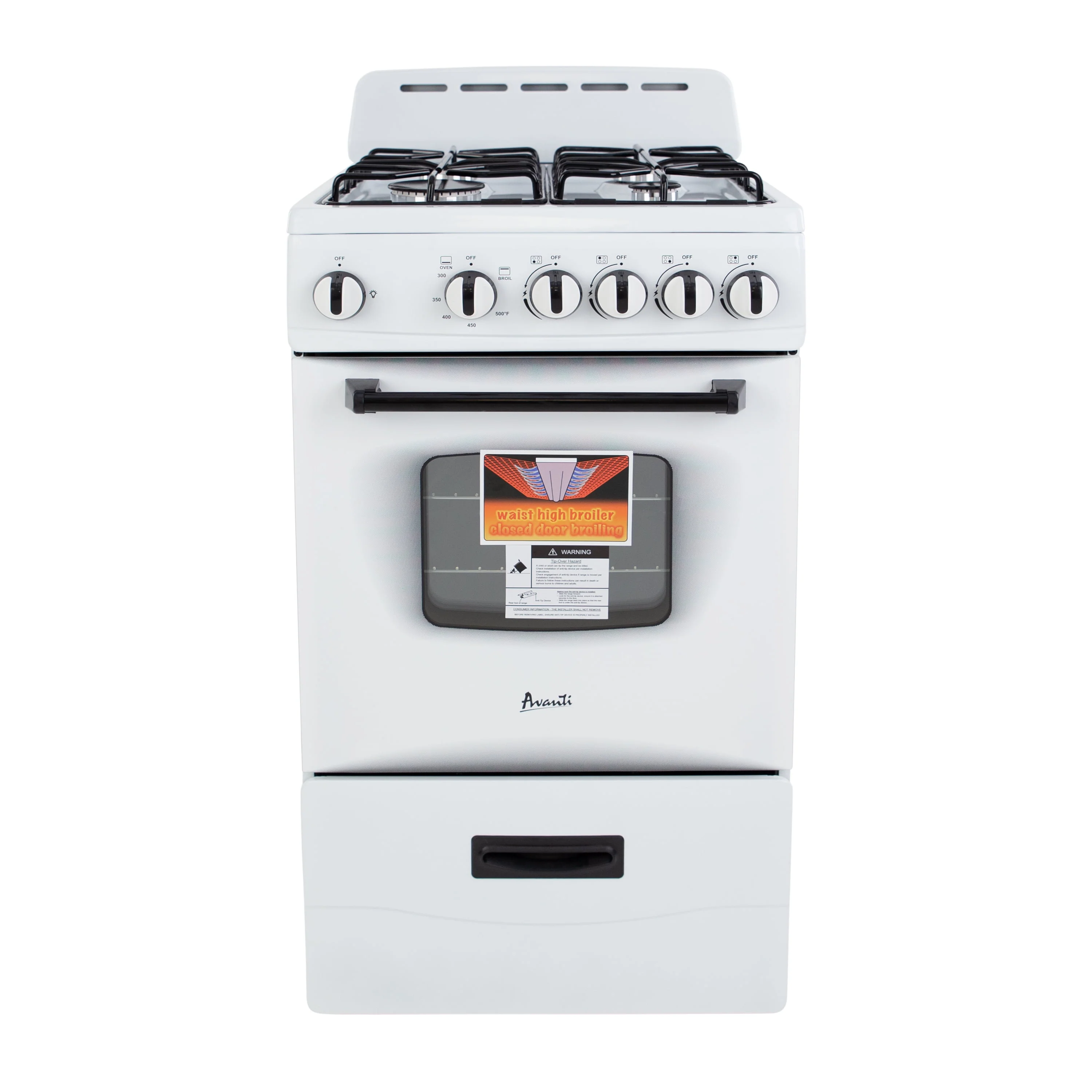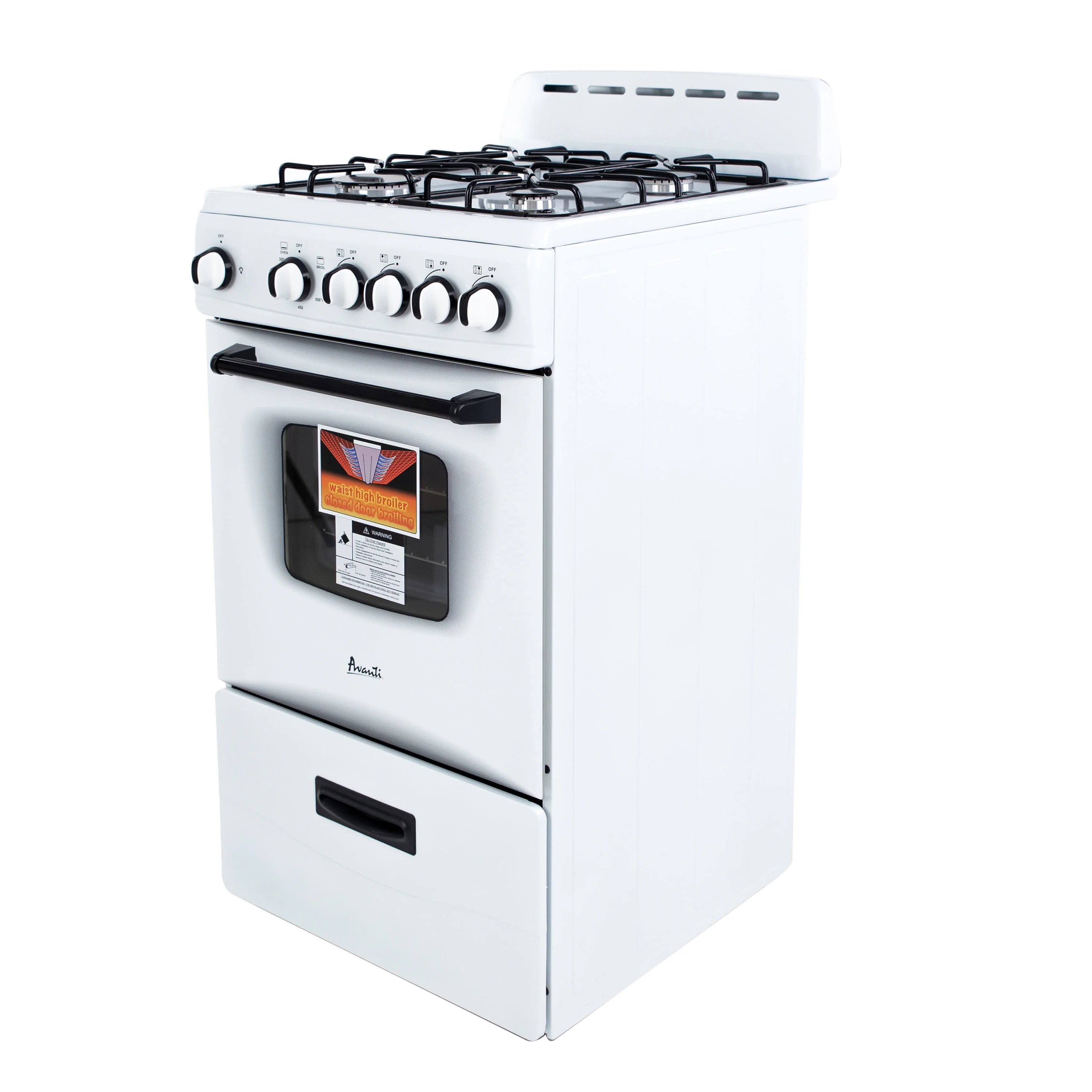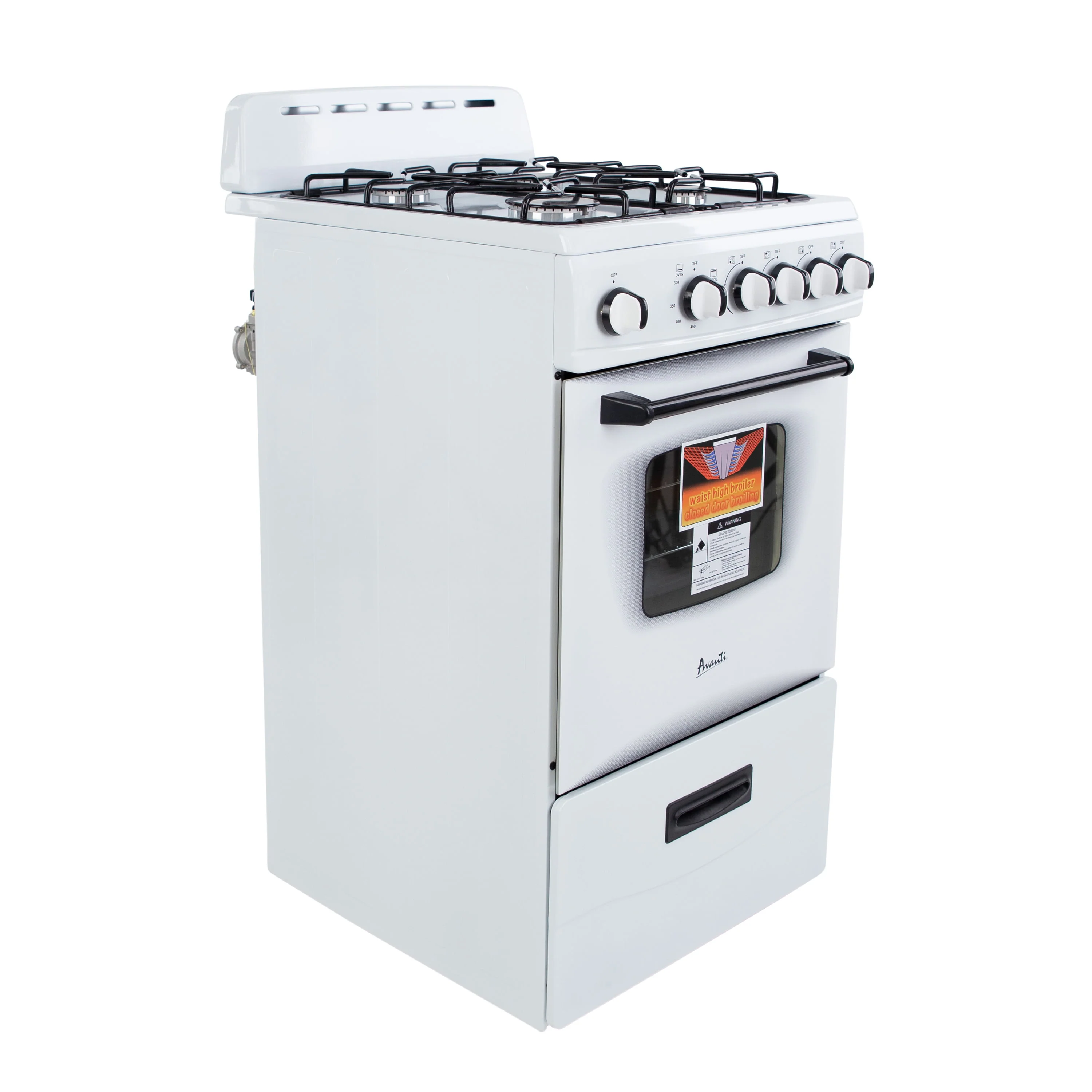 Save kitchen space with this compact, white range from Avanti. The perfect compact gas range for the office, studio apartment, RV, tiny home, condo, vacation home, or anywhere you need to save space in a small kitchen.This 20-inch-wide range features 4 sealed burners (1 rapid, 2 semi-rapid, 1 simmer). The oven has a storage drawer at the bottom and a broiler that comes with a broiling pan.