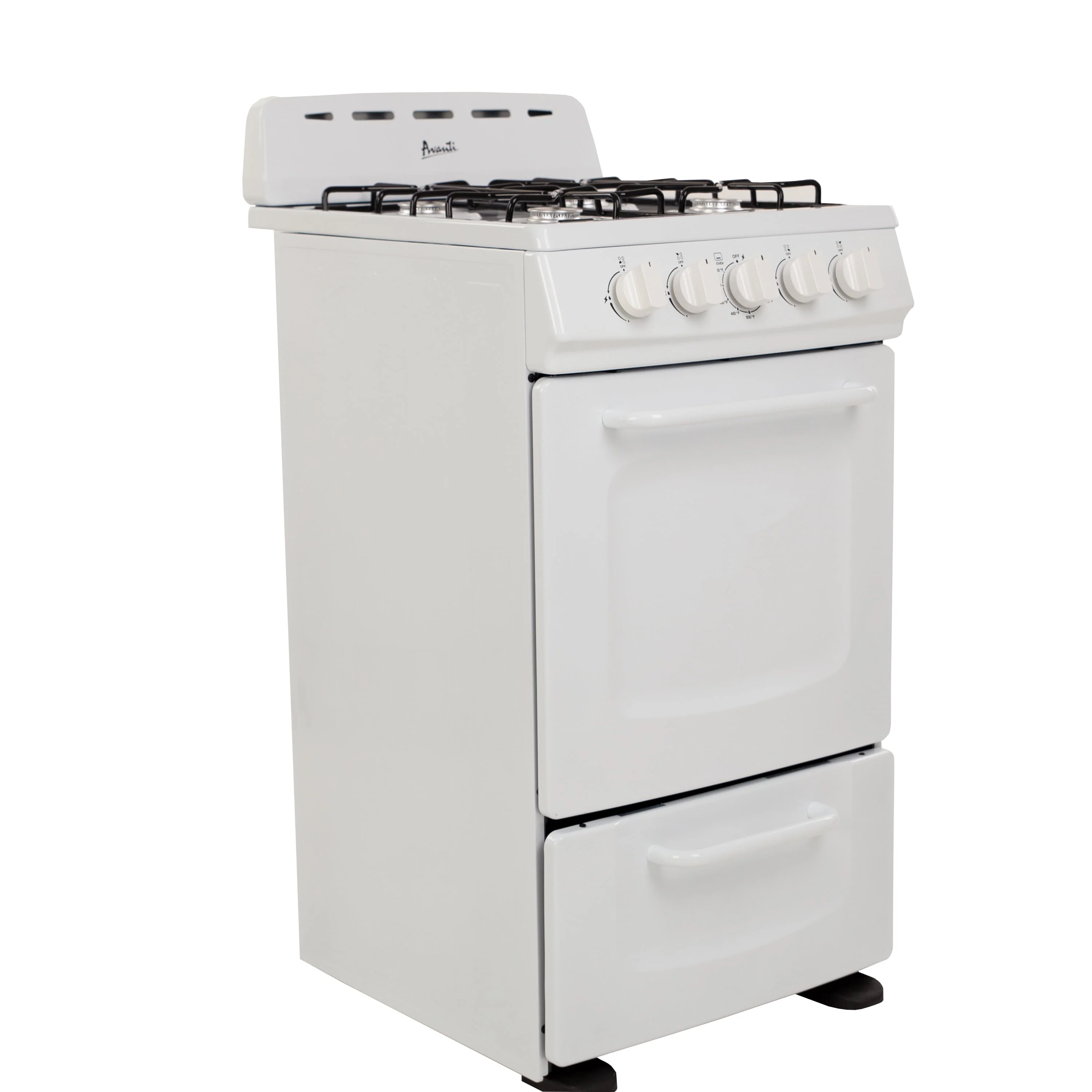 Save kitchen space with this compact, white range from Avanti. The perfect compact gas range for the office, studio apartment, RV, tiny home, condo, vacation home, or anywhere you need to save space in a small kitchen.This 20-inch wide range features 4 burners (9,000 BTU each), a broiler drawer (10,000 BTU) that comes with a broiling pan, and a storage drawer at the bottom.