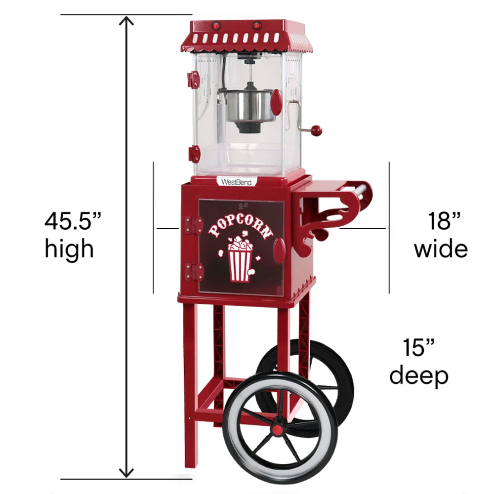 Fun and space saving, the new West Bend Popcorn Cart is the ideal way to bring a true movie theater experience into your home. And when you make your popcorn at home you can snack happy because you know that you’re making a healthy treat. With 10 cups per batch you’ll have plenty to share with the whole family. Use this for birthday parties, family events, and more! Easy to movie and take with you to an event or when rearranging. There is also a built in light so you see just how much popcorn you are getting giving you the whole movie theater experience!