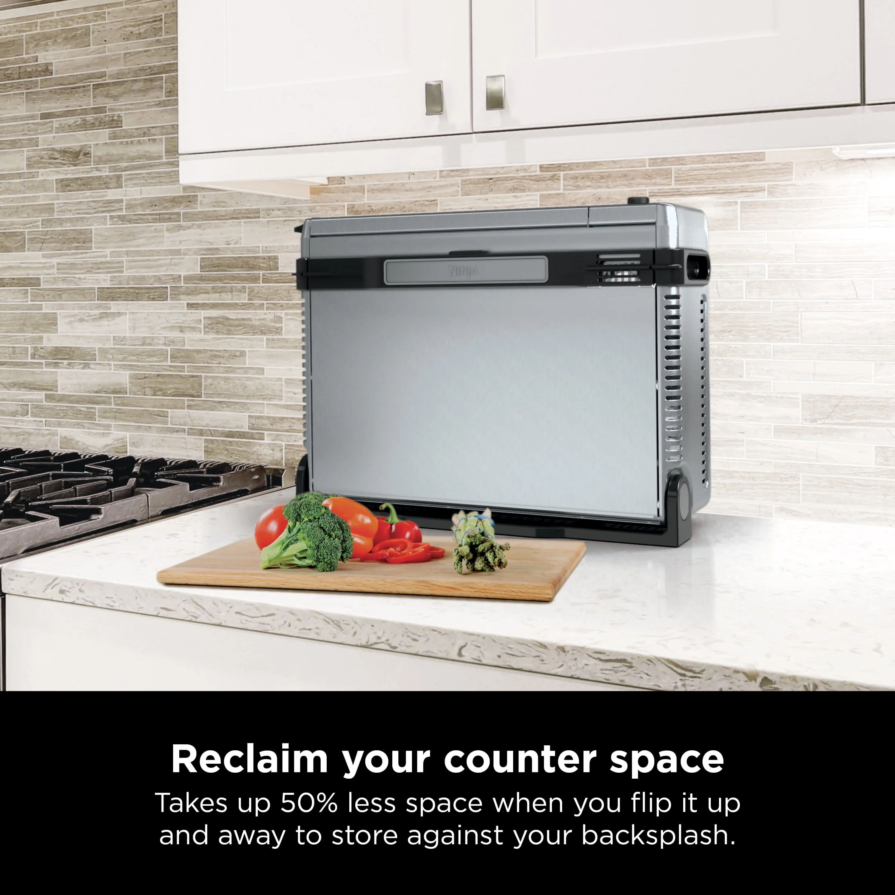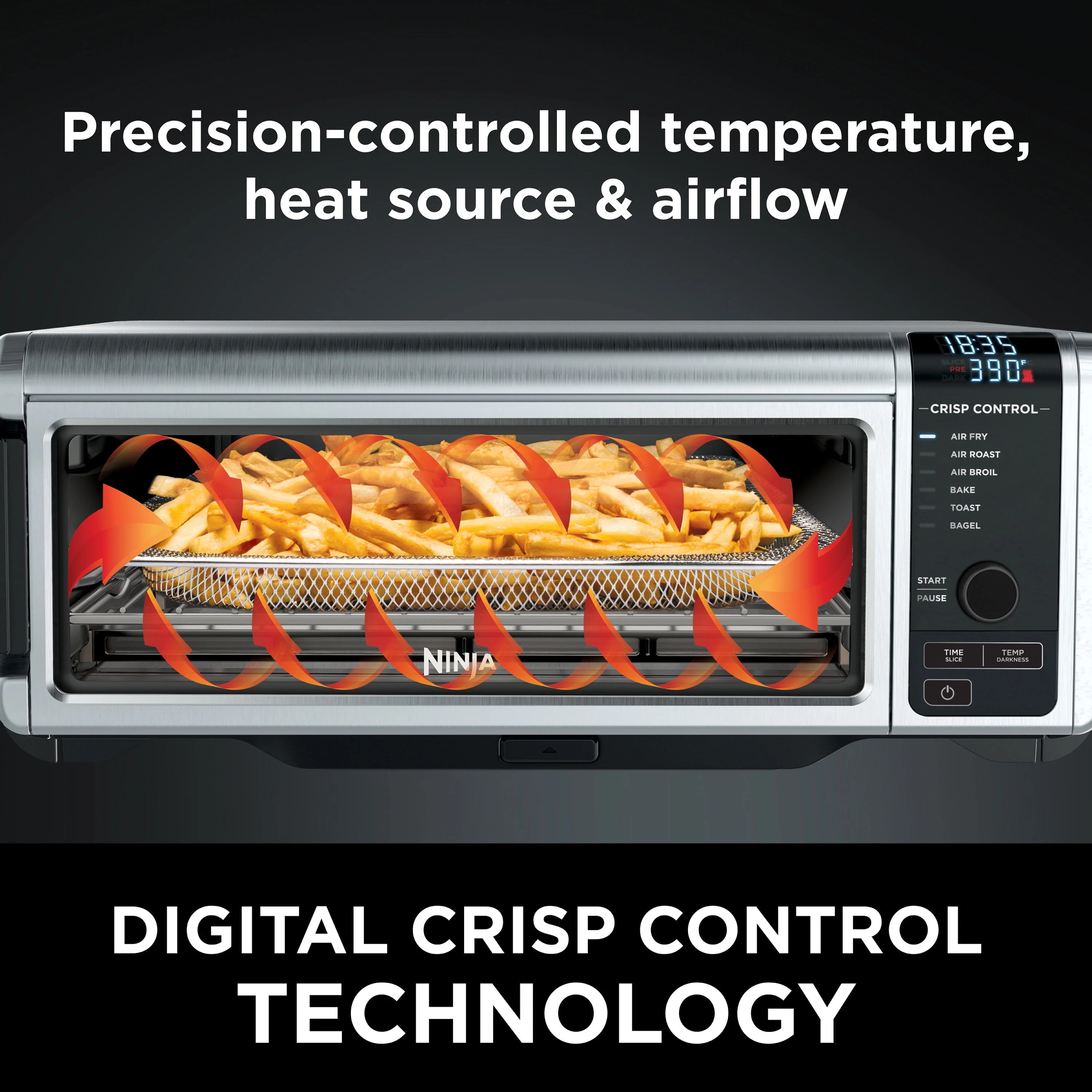 The ultimate meal-making machine: SP080 Air Fry, Air Roast, Air Broil, Bake, Bagel, and Toast all in one powerful 1800-watt appliance. Reclaim your counter space as this oven takes up 50% less space when you flip it up and away to store against your backsplash. Air fry up to 75% less fat than traditional frying methods. Tested against hand-cut, deep-fried French fries. XL capacity with 45% larger usable pan cooking area vs. the flat surface area of the Cuisinart TOA-60 and TOA-65 pan. Fits a 13" pizza, up to 9 slices of toast or 6 chicken breasts (6�? oz. each). Easy clean up with included removable crumb tray and an easily accessible back panel for deep cleaning. Cooks up to 60% faster than a traditional oven with Air Roast; 60 second preheat; full meals in as little as 20 minutes. Even baking: Up to 40% more-even baking than the Cuisinart Air Fry Oven TOA-60. Digital Crisp Control Technology: Precision-controlled temperature, heat source, and airflow for ultimate versatility and optimum cooking performance. Toast and bagels done the way you like: Use the toast darkness selector to get it just right.